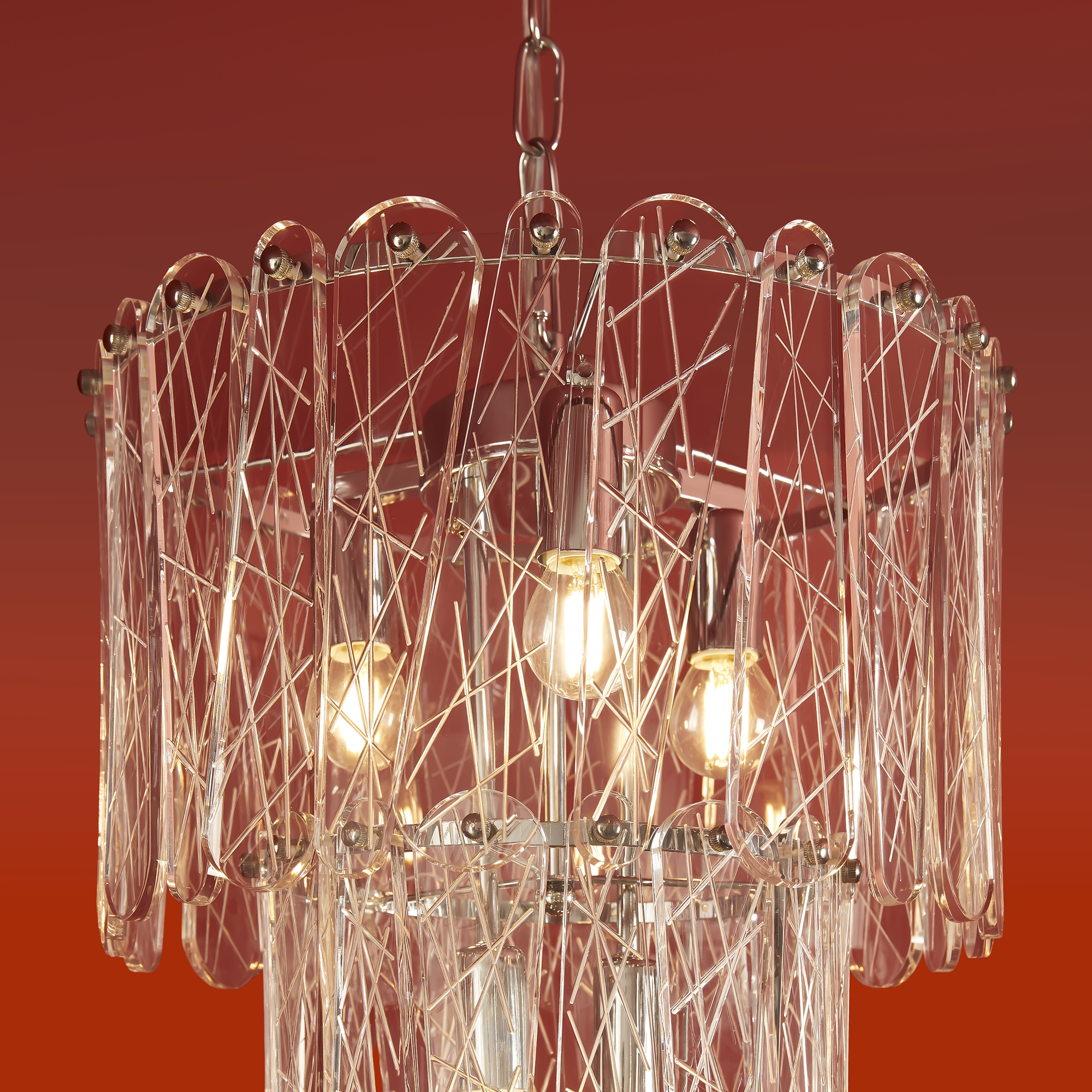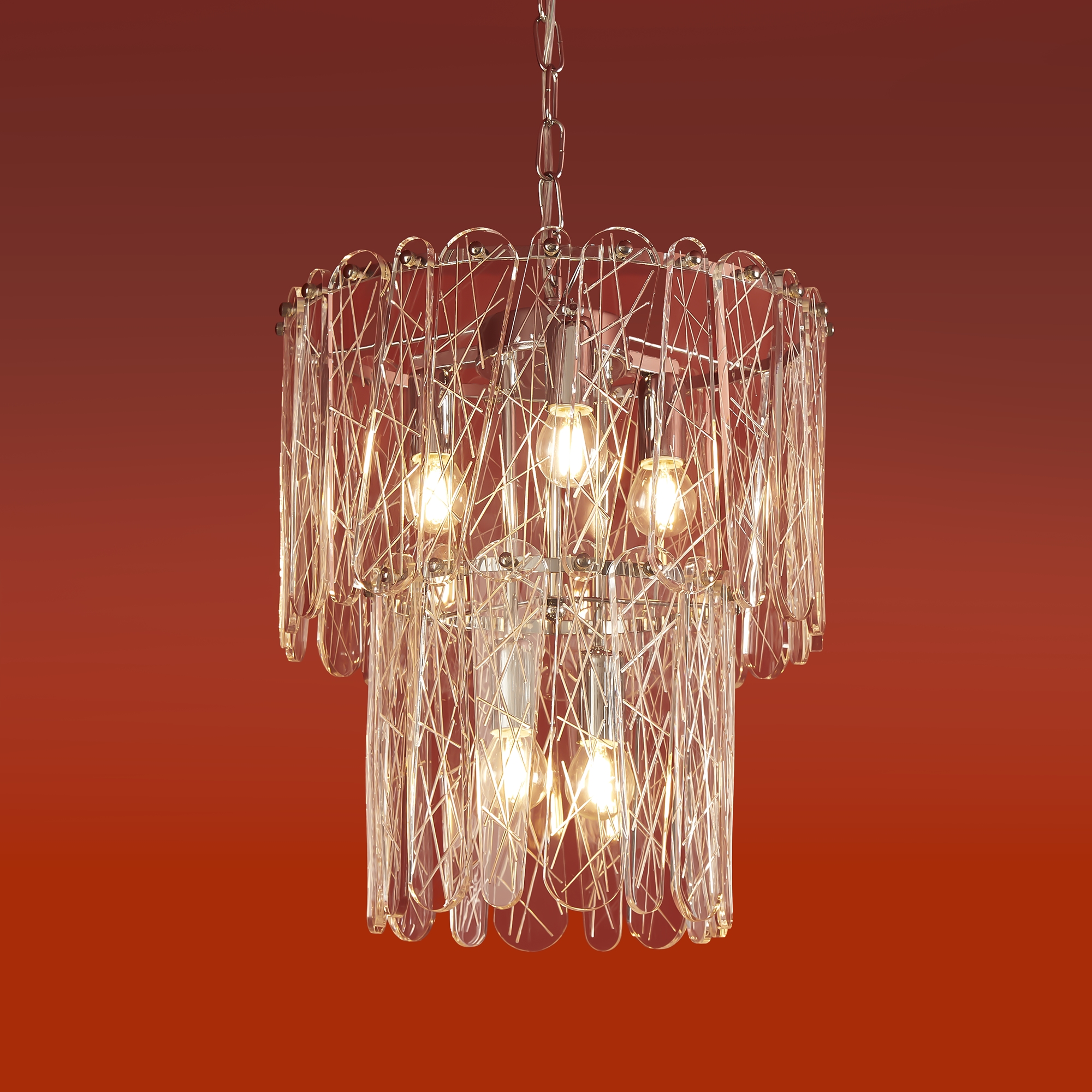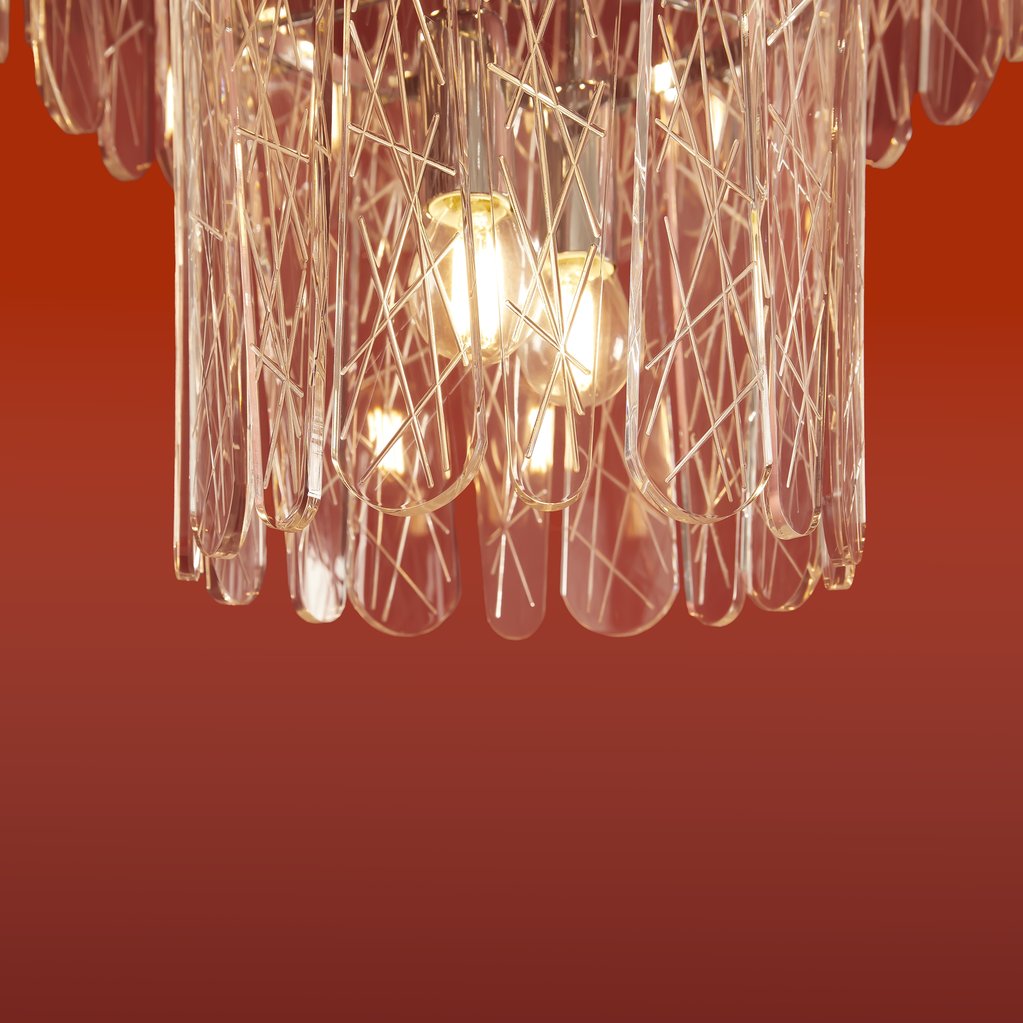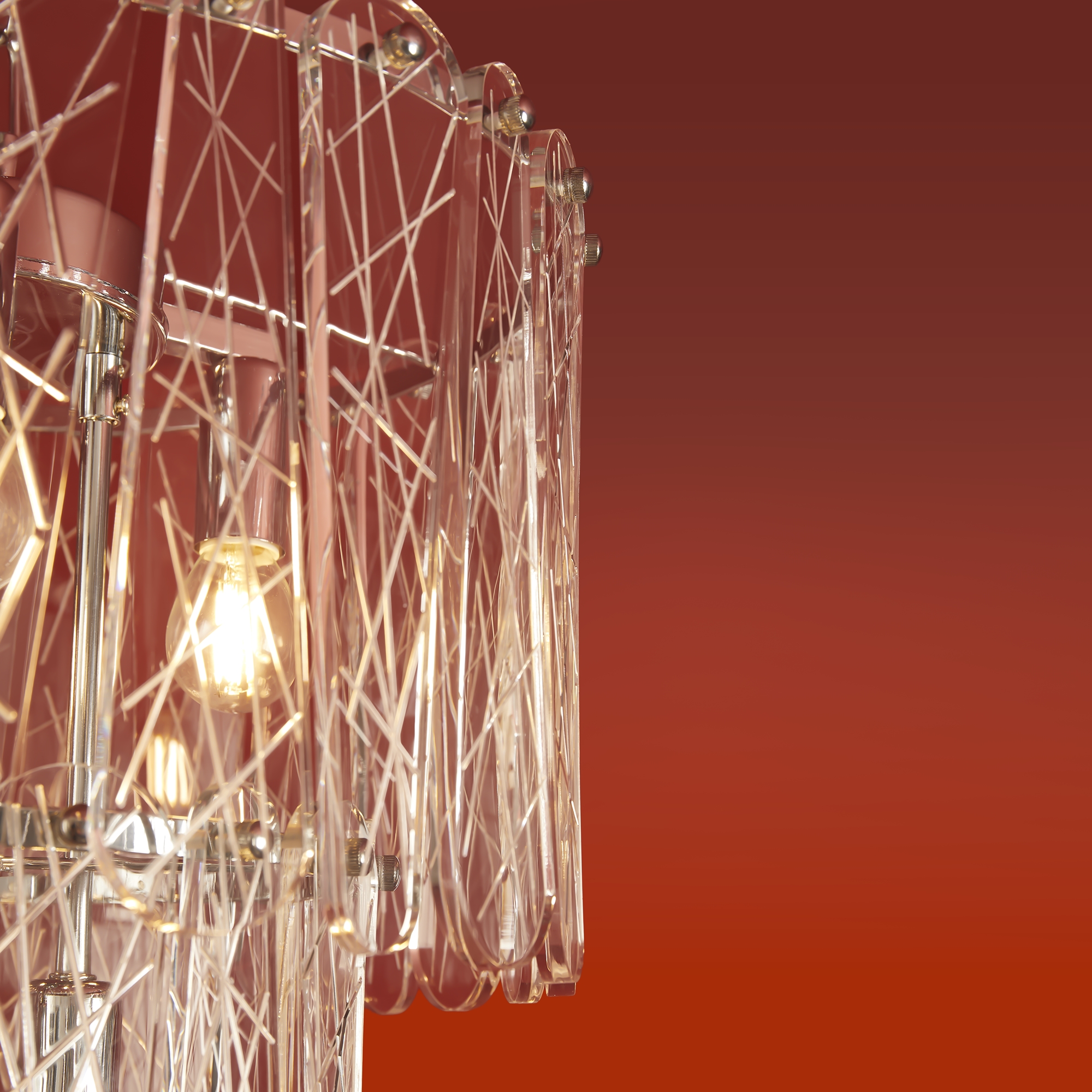 Материал арматуры — металл, цвет — хром. Светильники выполнены из хрусталя с рисунком "frozen". Подвесные светильники и бра с цоколем E14. Современный дизайн арматуры, дугообразные формы с хромированной отделкой подчеркивают декоративные хрустальные элементы. Подходит для современных интерьеров.