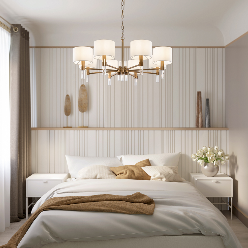 Металлическая арматура. Цвет – латунь. Тканевые абажуры белого оттенка. Декор – прозрачные акриловые трубки. Трендовая комбинация фактур и материалов. Широкий ассортимент. Торшер и подвес с цоколем Е27, лампа, бра и люстры – Е14.