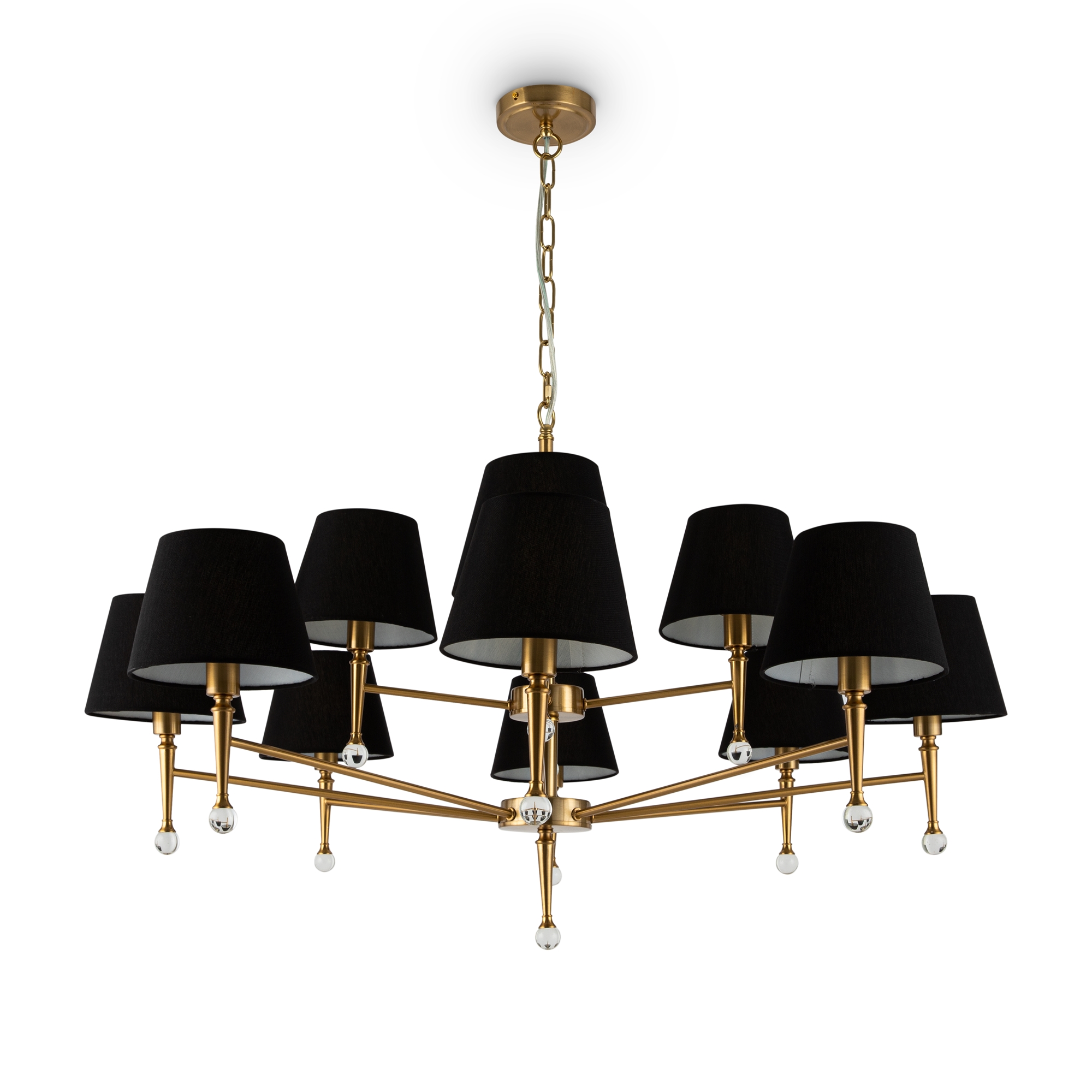Арматура - металл, плафоны - стекло. Цветовые комбинации арматуры и плафона: черный + прозрачный, черный + янтарный, латунь + прозрачный. Элементы декора - выдувные «бусины» из стекла. Высота проводов регулируется. Источник света - лампа с цоколем GU10.
