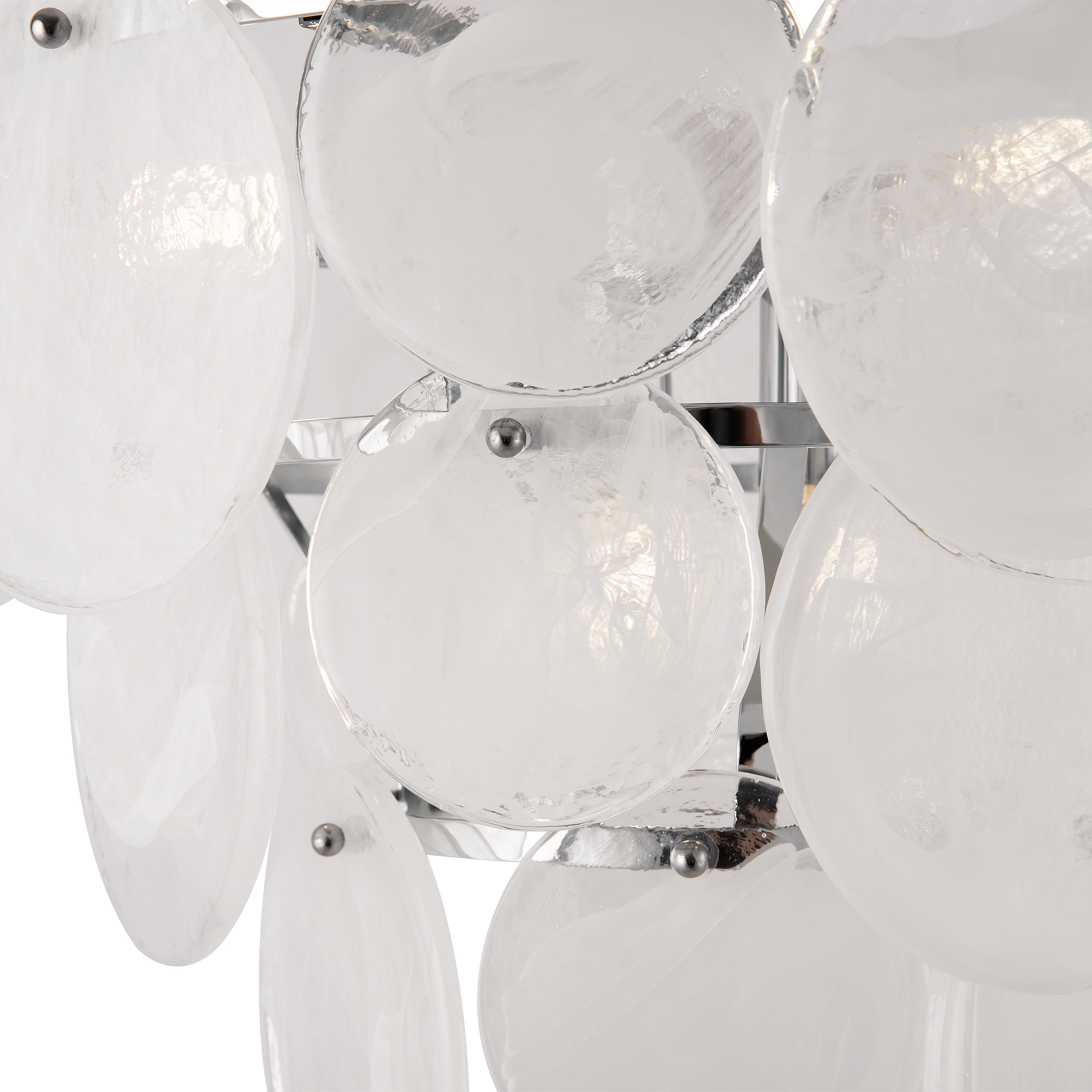 Металлическая арматура. Оттенки – латунь, хром. Оригинальный разноразмерный декор с эффектом замороженной фактуры. Материал декора – стекло. В качестве источников света используются лампы с цоколем Е14.