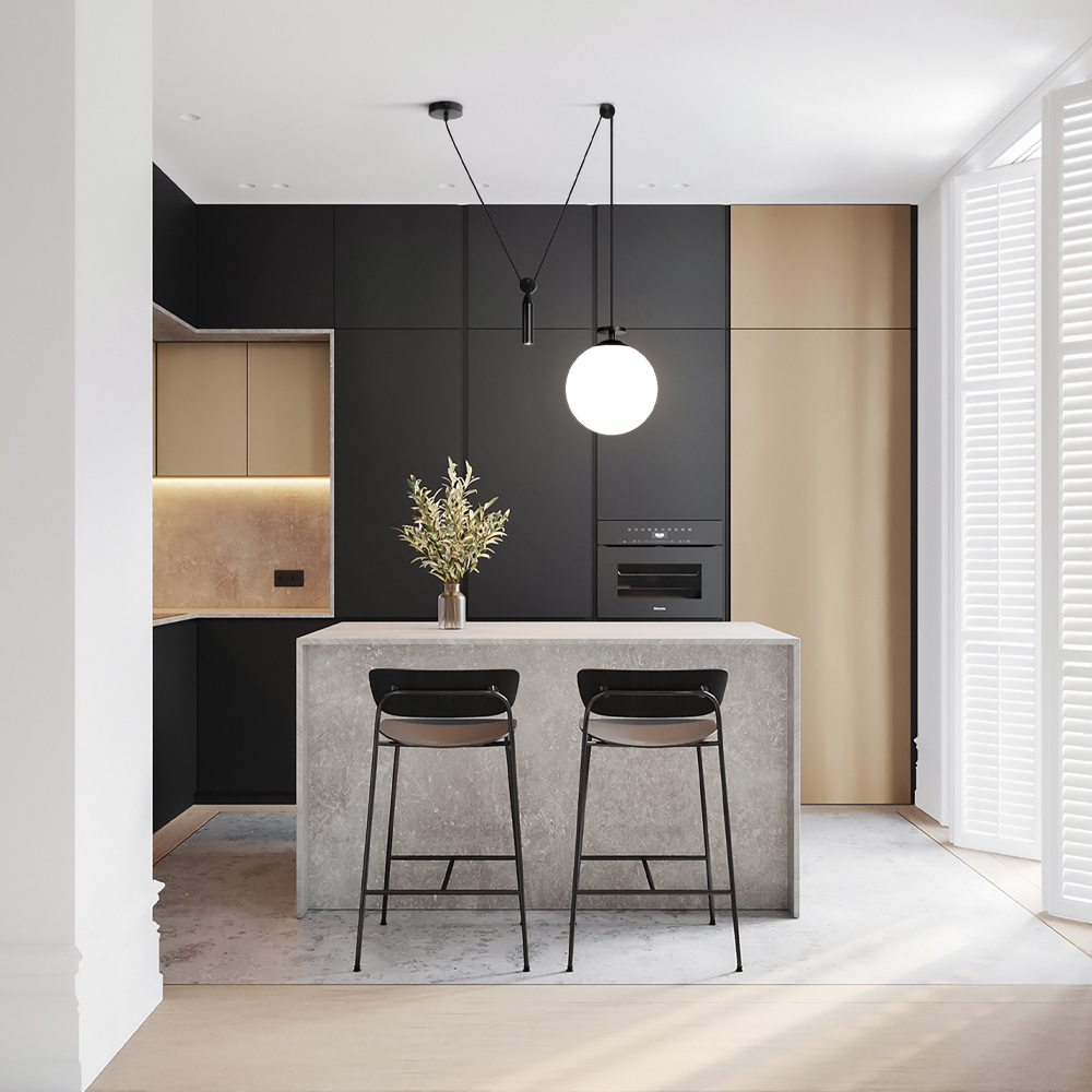 Чаша крепления и элементы корпуса выполнены из металла, цвета - черный и золотой. Плафон-сфера из белого матового стекла. Специальный грузик- противовес позволяет реглуировать высоту светильника. Универсальный дизайн для пространств любых габаритов. Источник света внутри плафона - лампа с цоколем Е27.