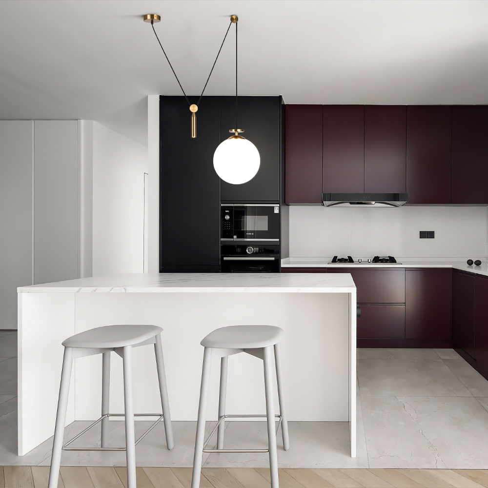Чаша крепления и элементы корпуса выполнены из металла, цвета - черный и золотой. Плафон-сфера из белого матового стекла. Специальный грузик- противовес позволяет реглуировать высоту светильника. Универсальный дизайн для пространств любых габаритов. Источник света внутри плафона - лампа с цоколем Е27.