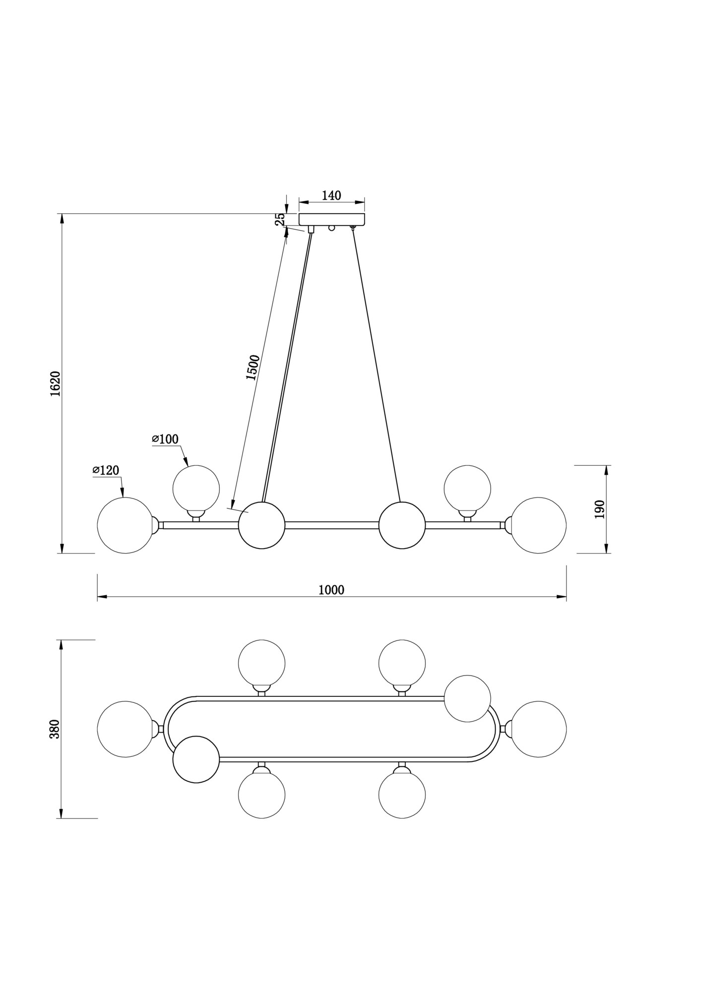 Металлическая арматура, цвета - черный и золотой. Плафоны-сферы из стекла 2х оттенков - матовый белый, полупрозрачный дымчатый - расположены на вытянутом металлическом каркасе, обеспечивая равномерный свет. Тонкие тросы придают светильнику эффект парения. Источник света - лампа с цоколем G9.