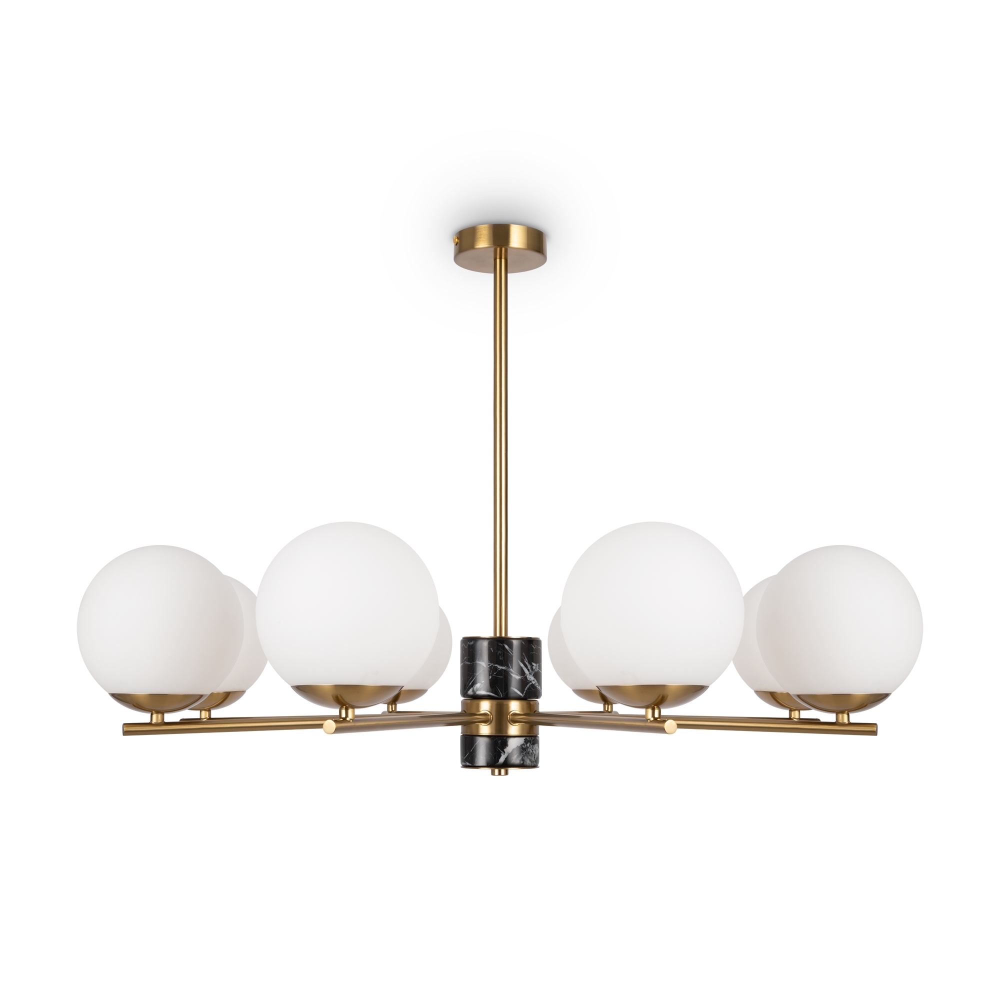 Арматура - металл, цвет - латунь. Мраморные черные элементы в основании. Плафоны-сферы из белого матового стекла с металлической апликацией у основания крепления в цвет арматуры. Сменямый источник света - лампы с цоколем Е27.
