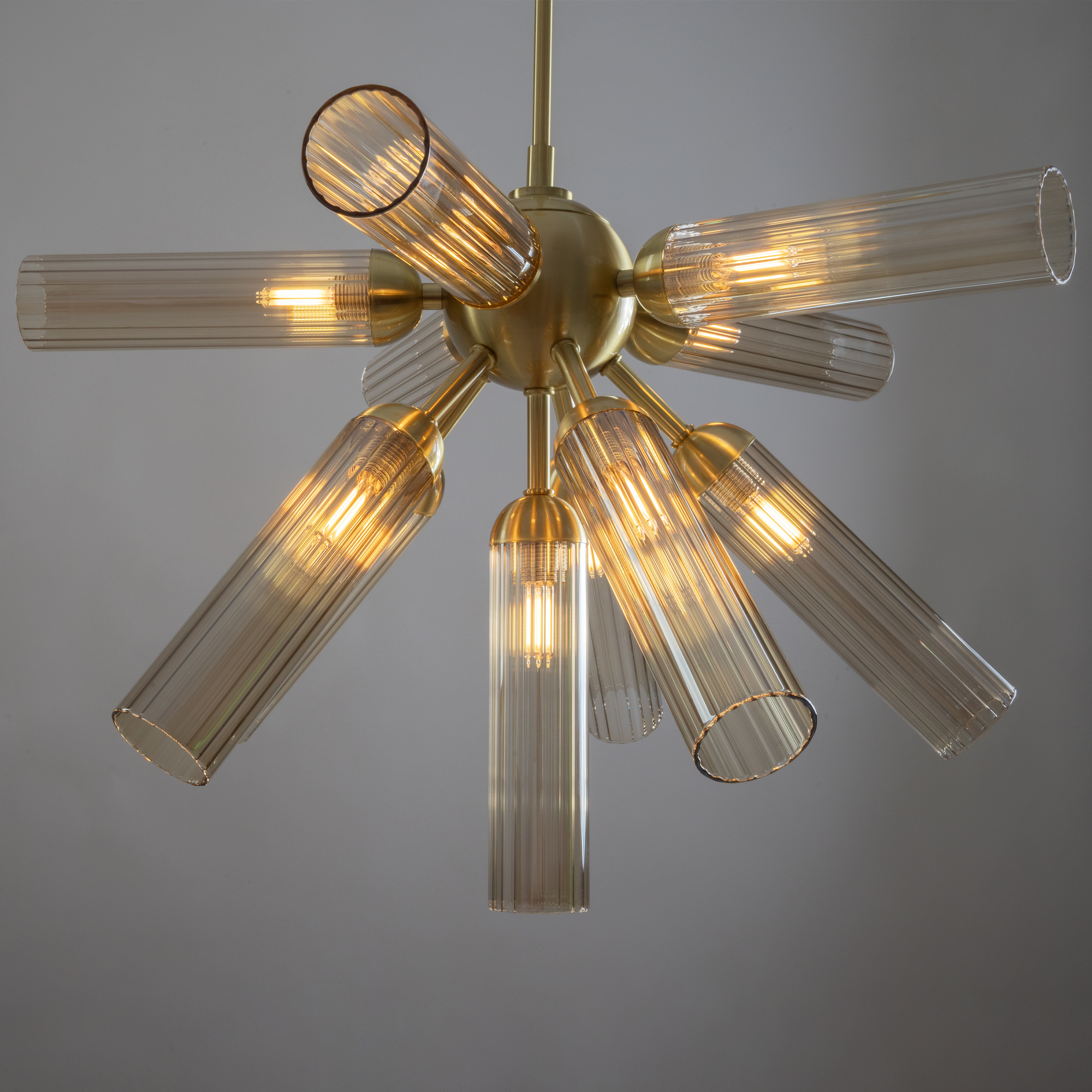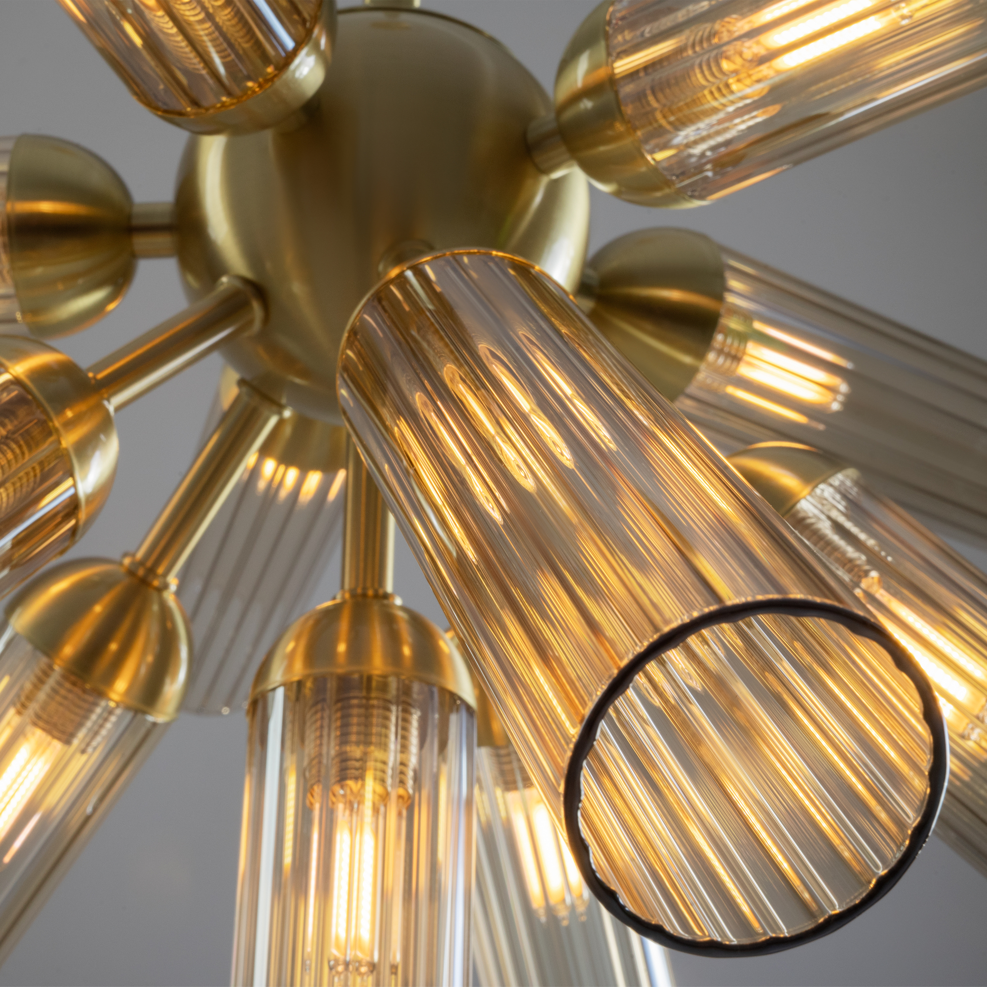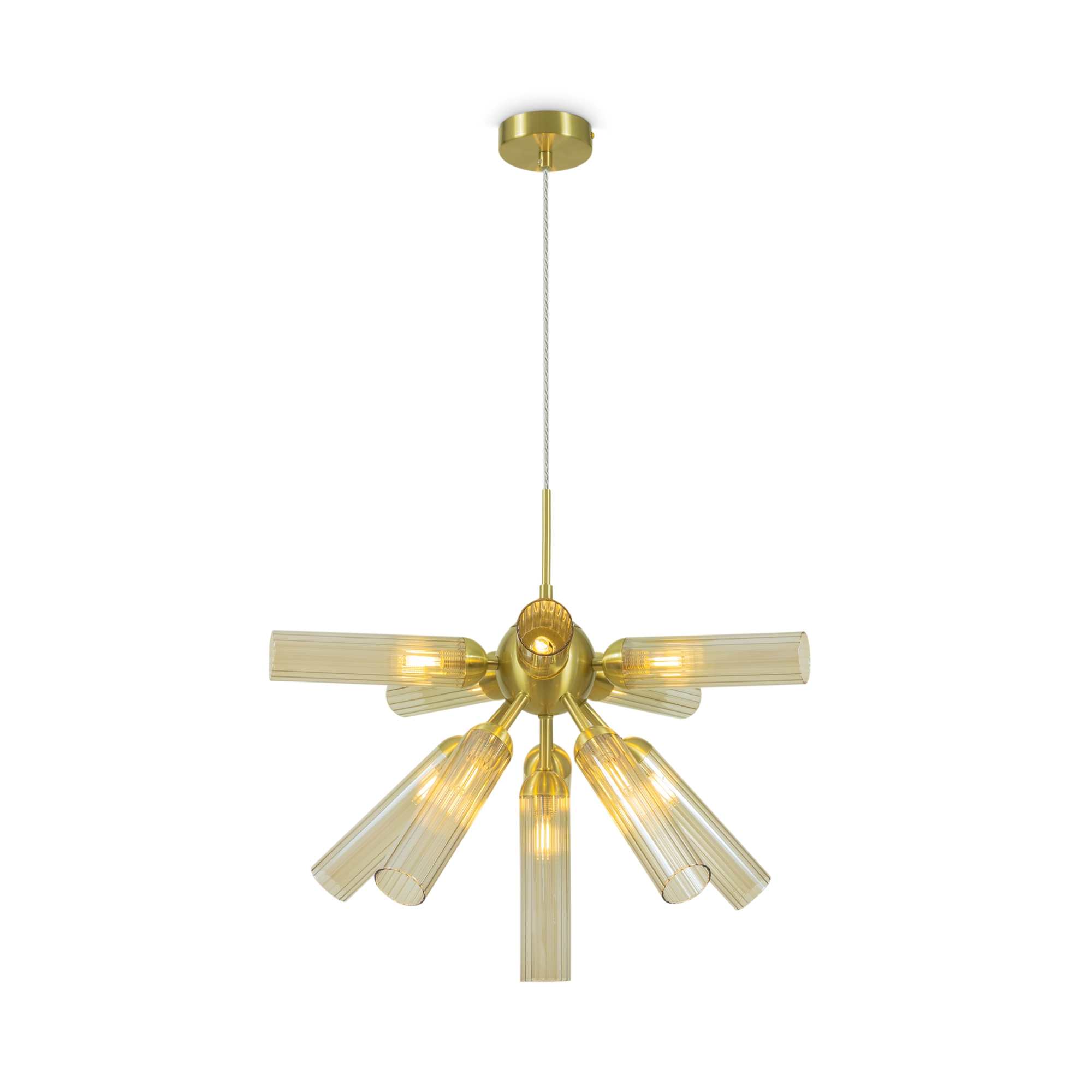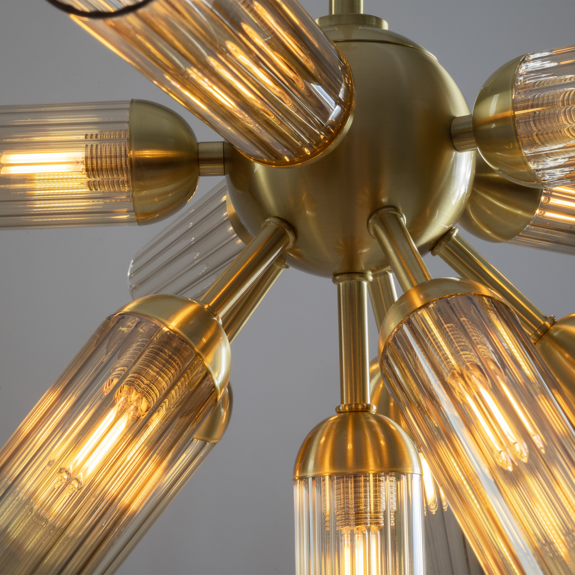 Арматура из металла, цвет — золото. Рельефные плафоны в тренде ZIGZAG. Материал — стекло, цвет — янтарный. Высота подвесных светильников регулируется. Плафоны закреплены на металлическую сферу. Источник света — лампа с цоколем G9.