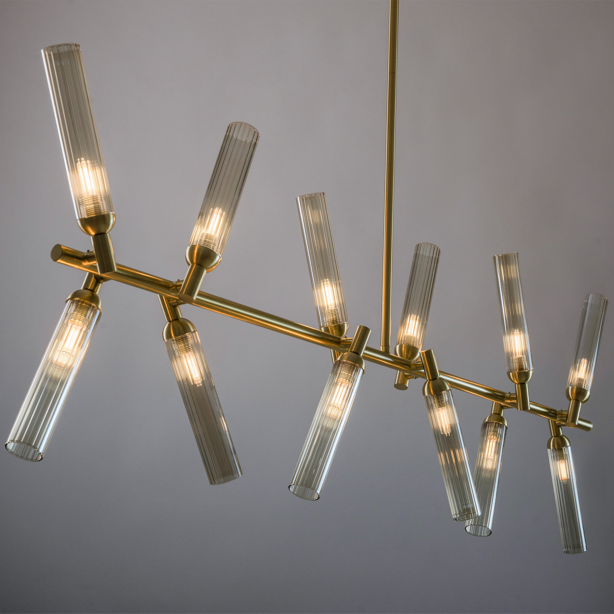 Арматура из металла, цвет — золото. Рельефные плафоны в тренде ZIGZAG. Материал — стекло, цвет — янтарный. Высота подвесных светильников регулируется. Плафоны закреплены на металлическую сферу. Источник света — лампа с цоколем G9.