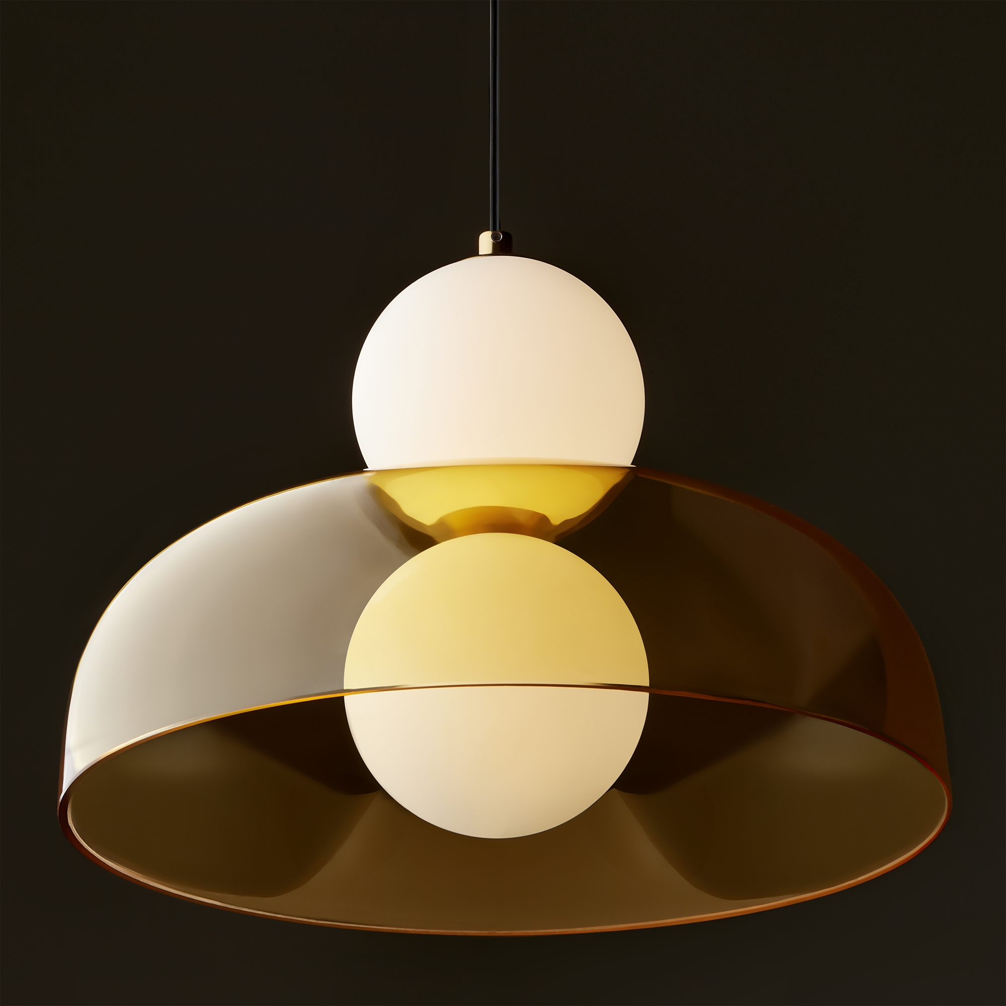 Арматура - металл, цвет - латунь. Стеклянные плафоны в виде сдвоенных матовых “шариков” дополнены широкими декоративными плафонами из стекла двух оттенков: дымчатый и янтарный. LED-источник света. Цветовая температура - 3000К. Светильники подойдут для светлых интерьеров и детских комнат.