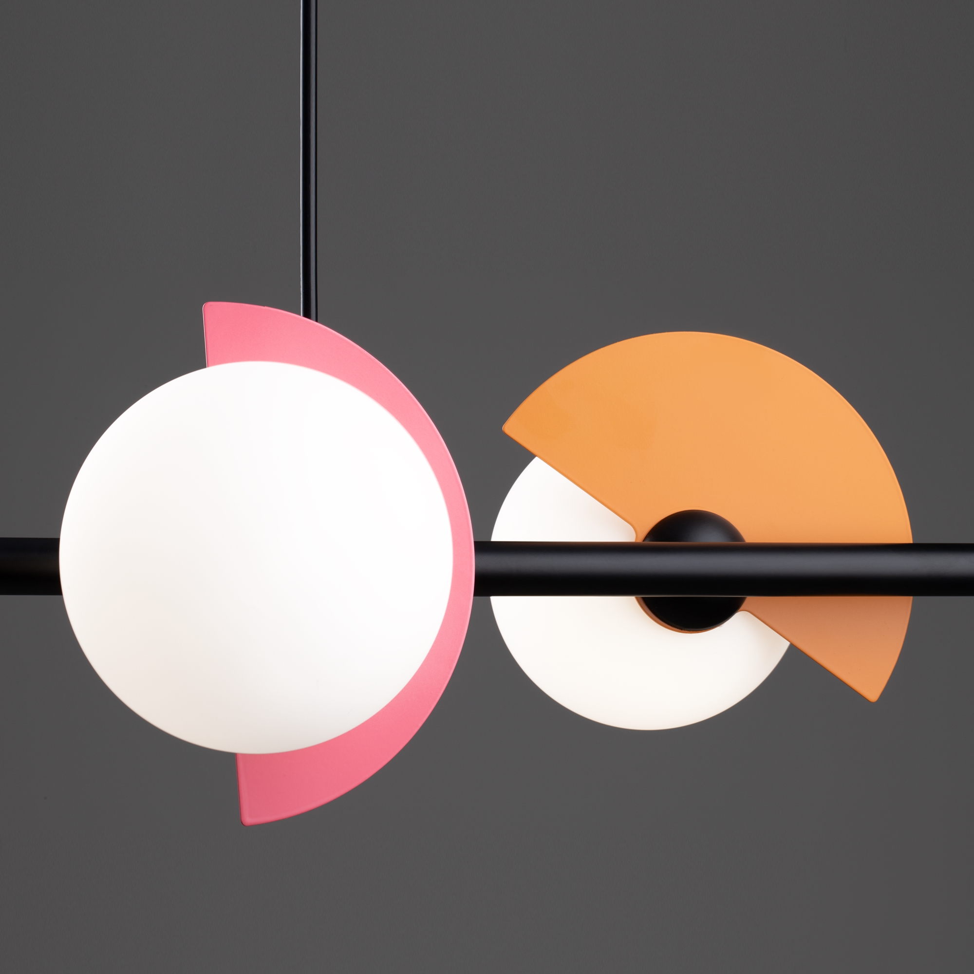 Арматура — металл, цвет — разноцветный или латунь. Белые матовые плафоны из стекла украшены металлическими золотыми или цветными лепестками. Динамичный дизайн для интерьеров в стиле Мемфис. Разнообразие форм в одной конструкции позволяет создать яркое освещение в больших комнатах. Высота регулируется. Источником света служит лампа с цоколем G9.