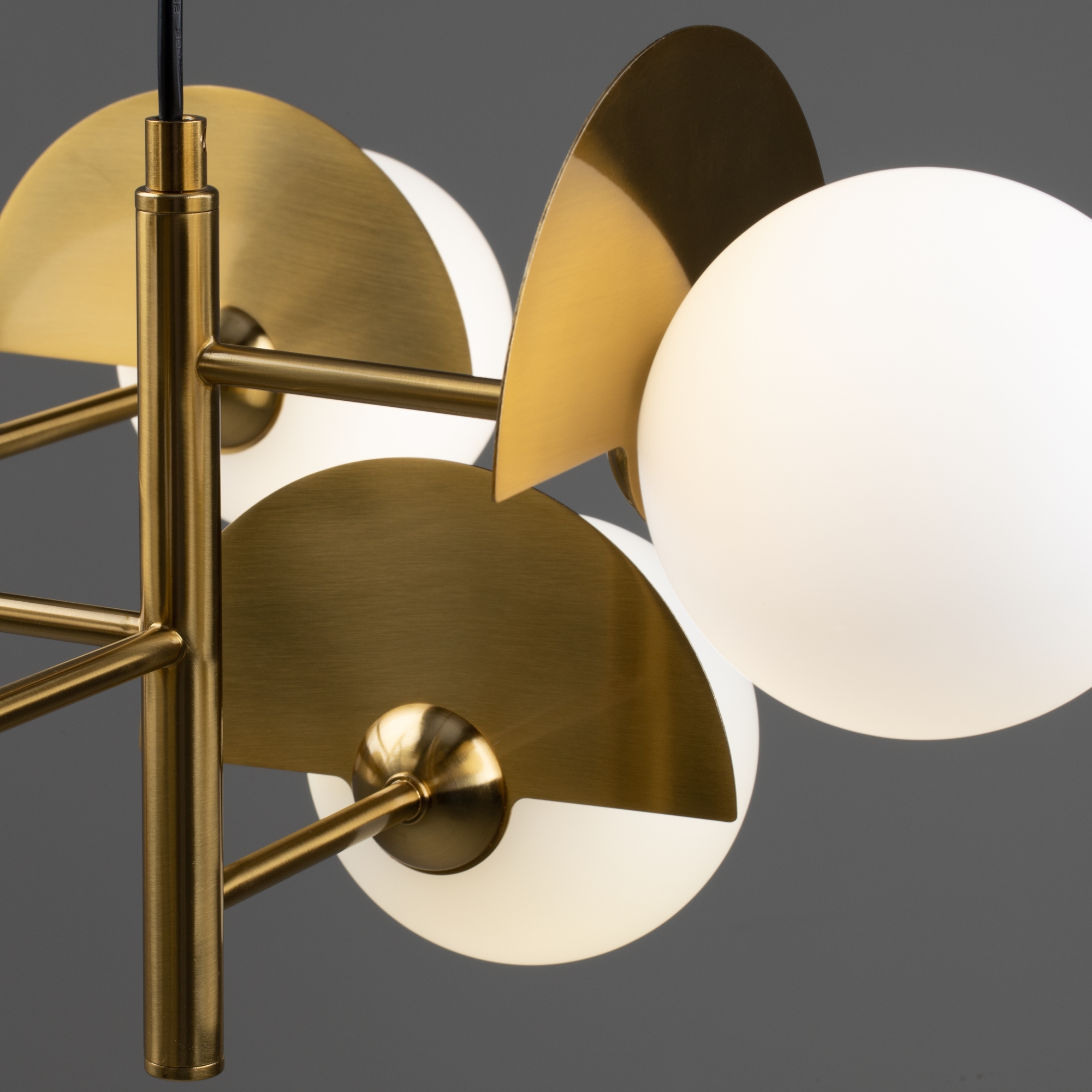 Арматура — металл, цвет — разноцветный или латунь. Белые матовые плафоны из стекла украшены металлическими золотыми или цветными лепестками. Динамичный дизайн для интерьеров в стиле Мемфис. Разнообразие форм в одной конструкции позволяет создать яркое освещение в больших комнатах. Высота регулируется. Источником света служит лампа с цоколем G9.