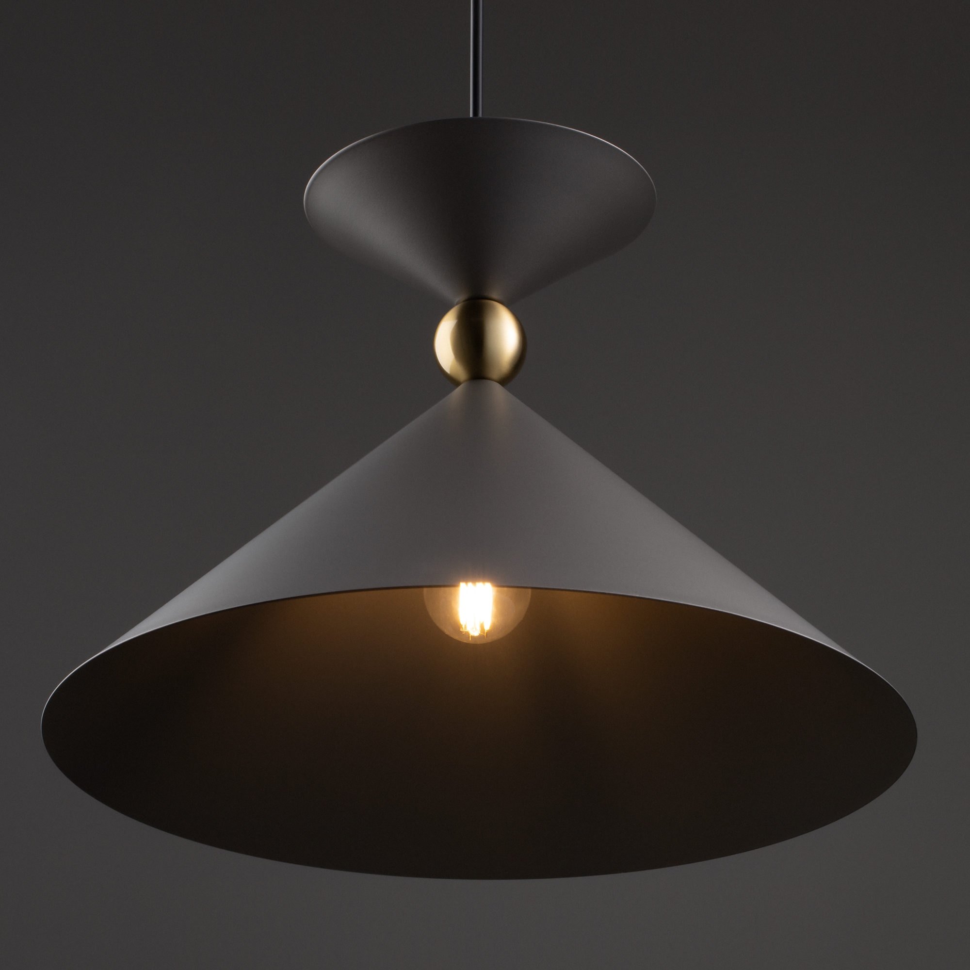 Арматура и плафоны из металла в двух цветах — белом и сером. Плафон состоит из 2-х конусов разных размеров, соединённых золотистым декоративным элементом. Высота регулируется. Идеальны для составления композиций. Источник света — лампа с цоколем Е27.