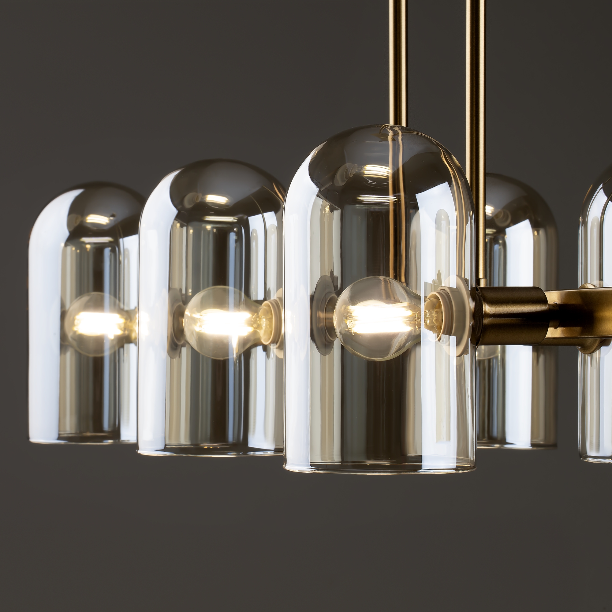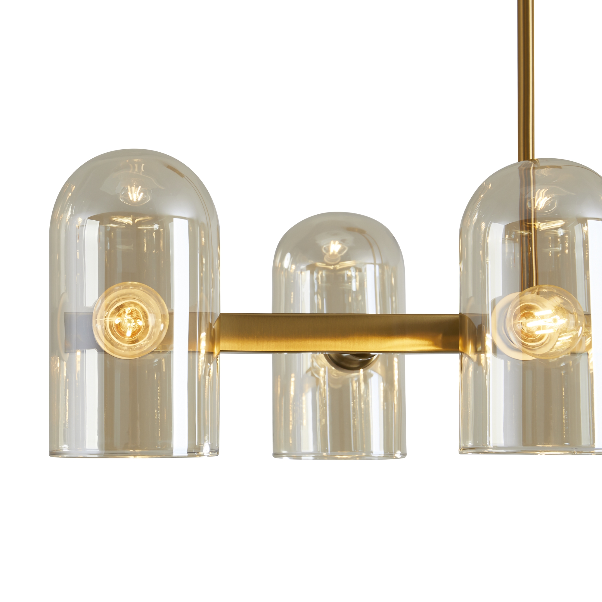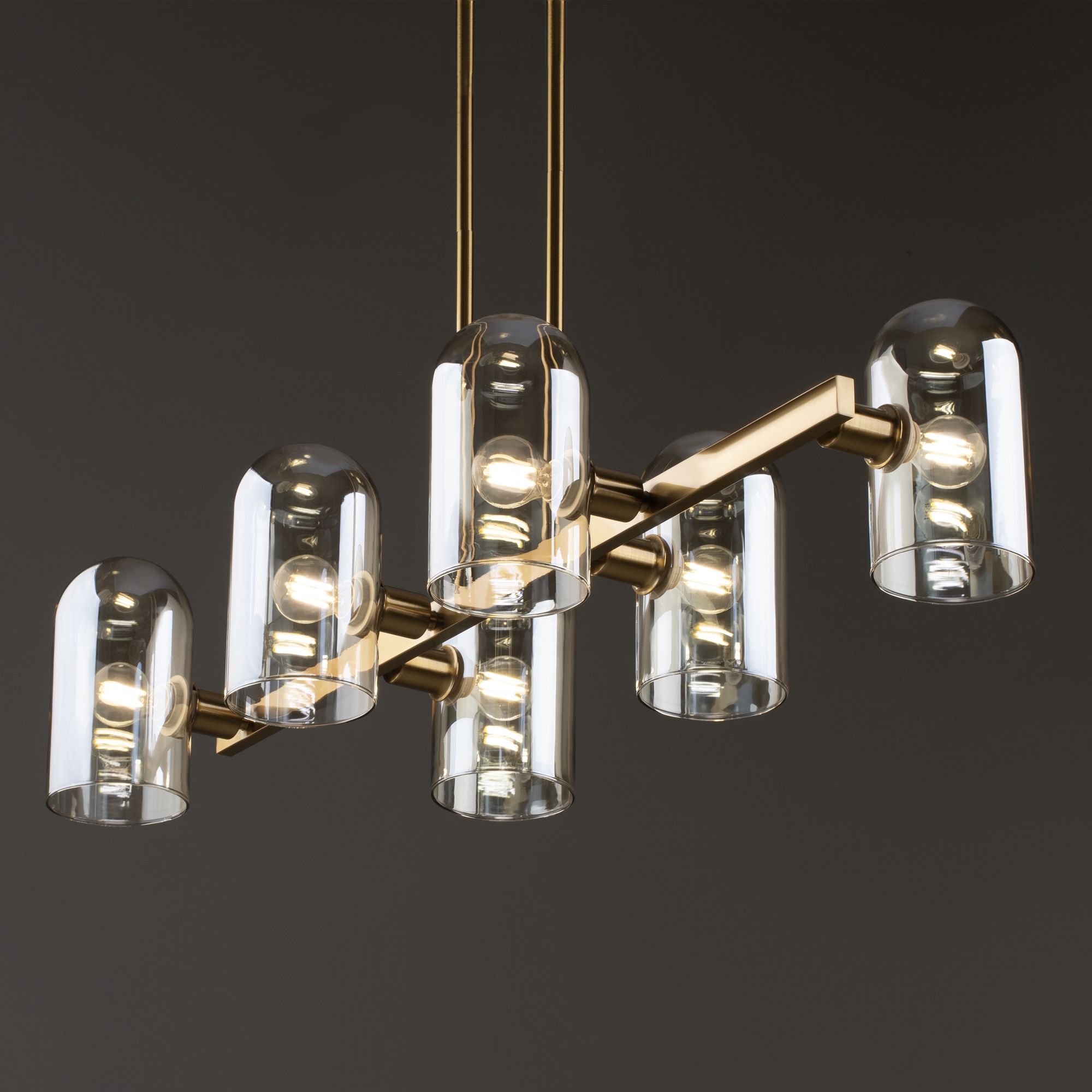 Арматура — металл. Цвет — латунь. Горизонтальные подвесы на твердой ножке. Плафоны из коньячного стекла в форме конуса. Направление плафона у настенного светильника можно регулировать за металлическое основание. Источник света лампа. Цоколь E14.