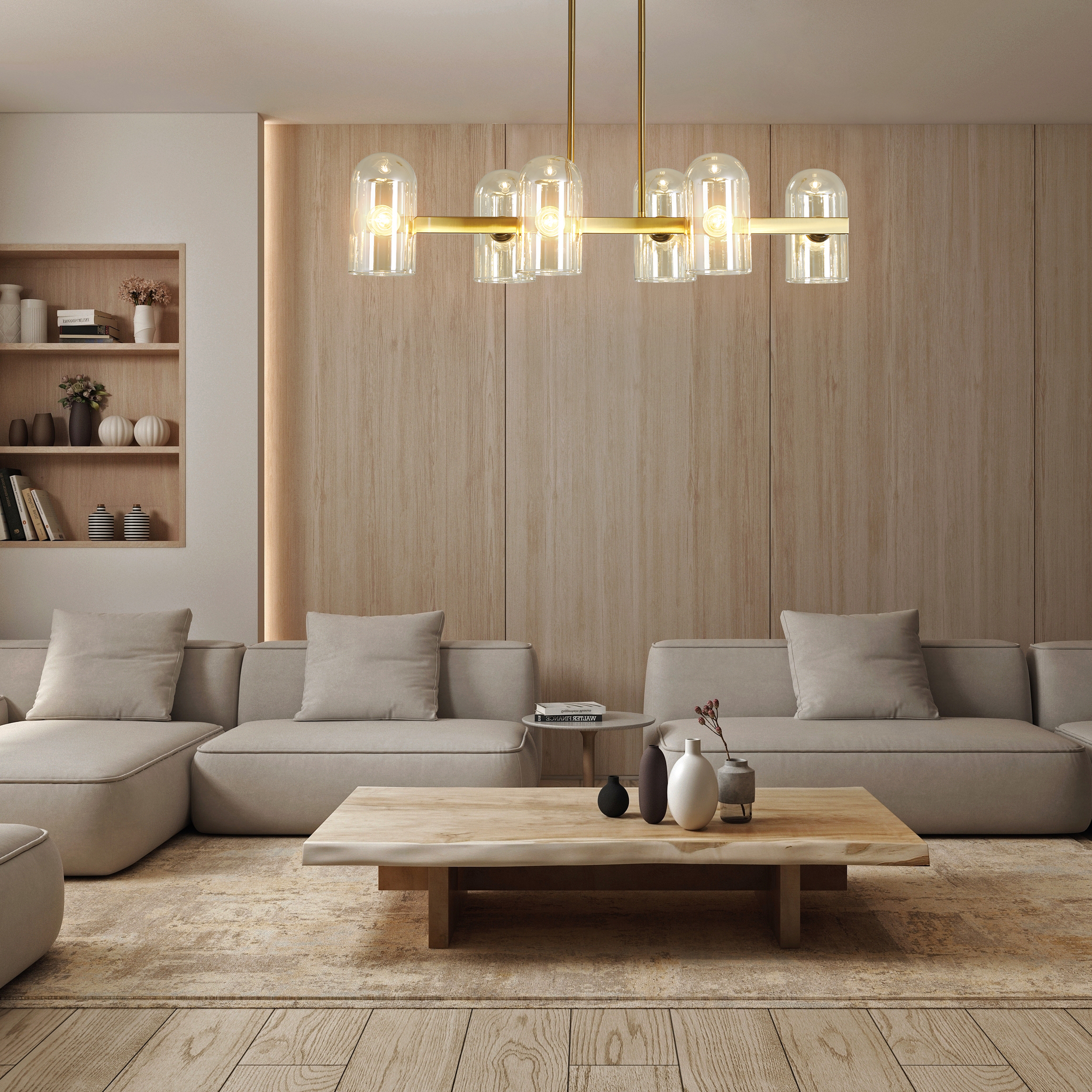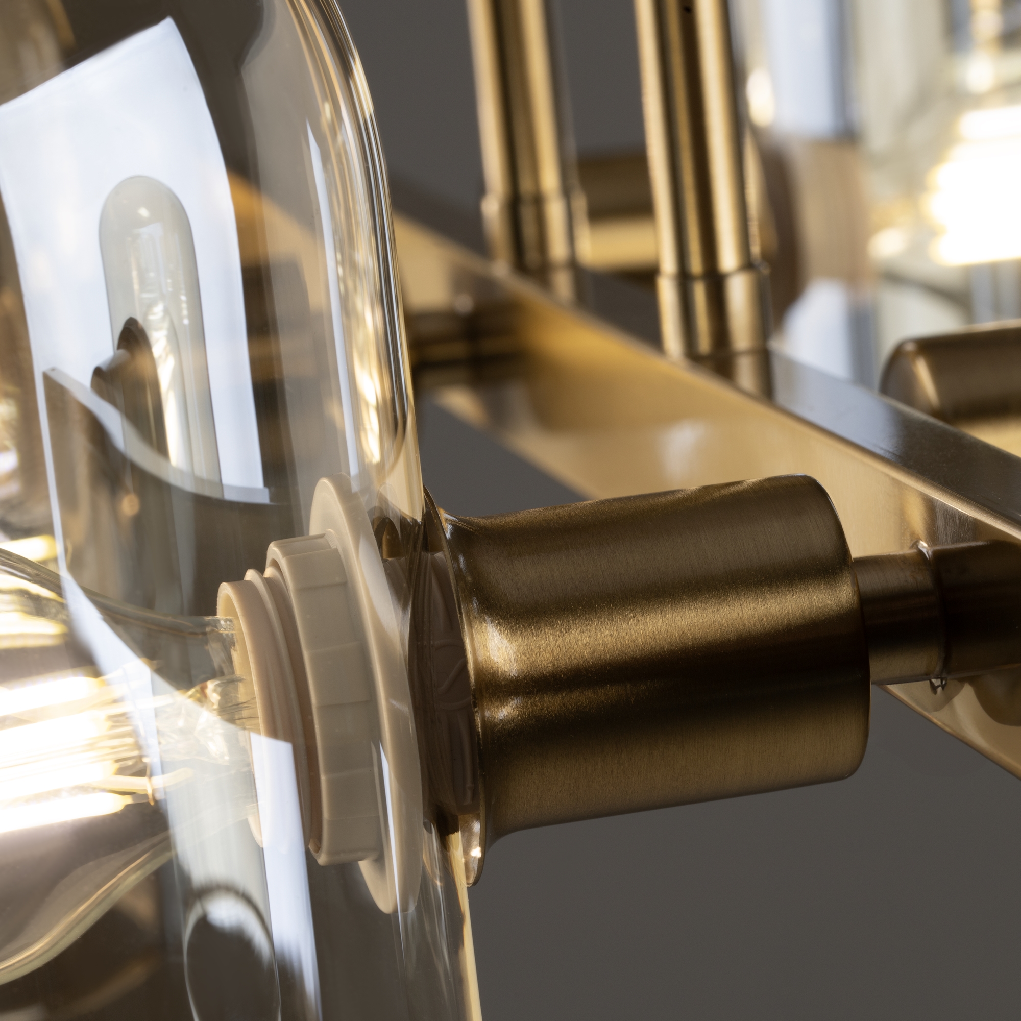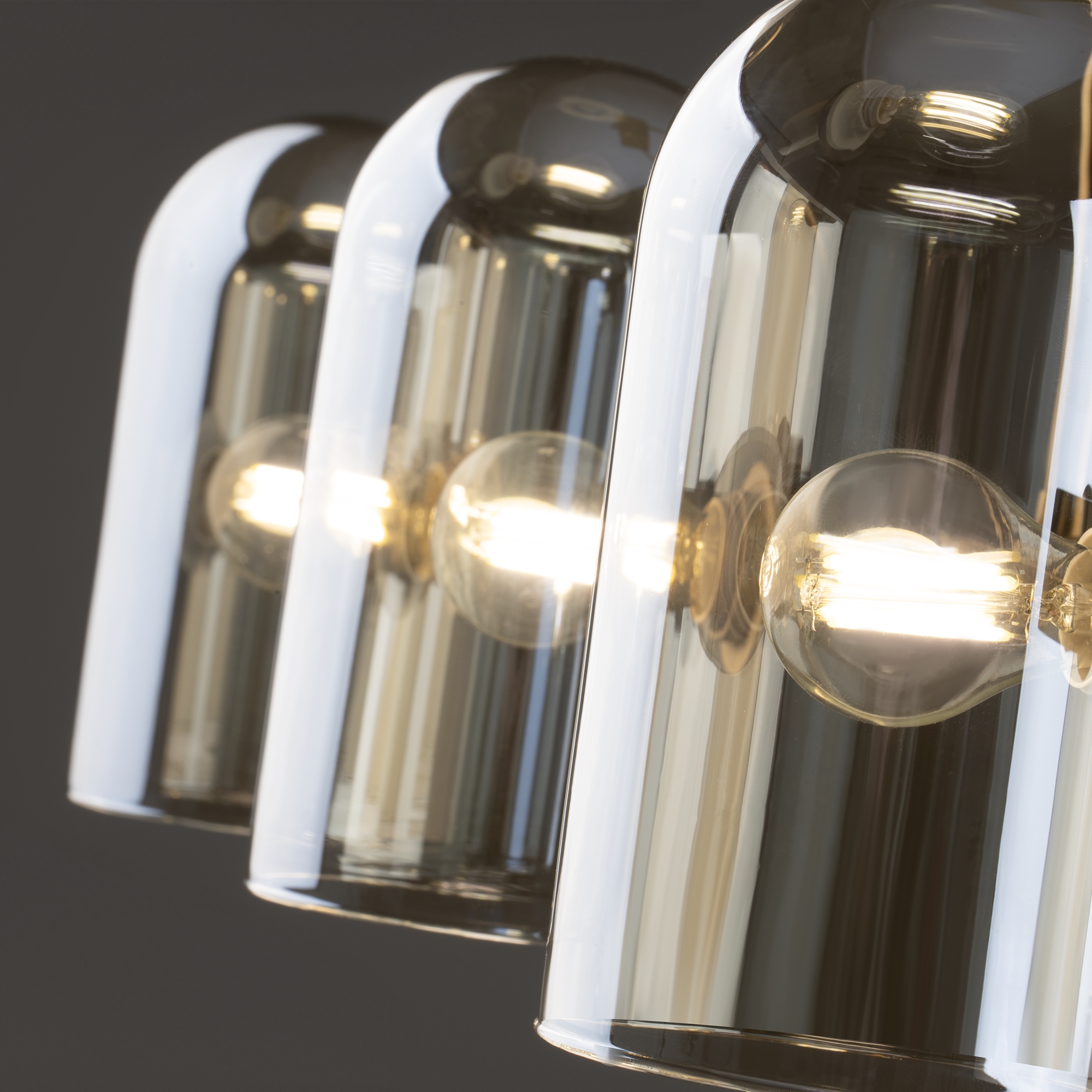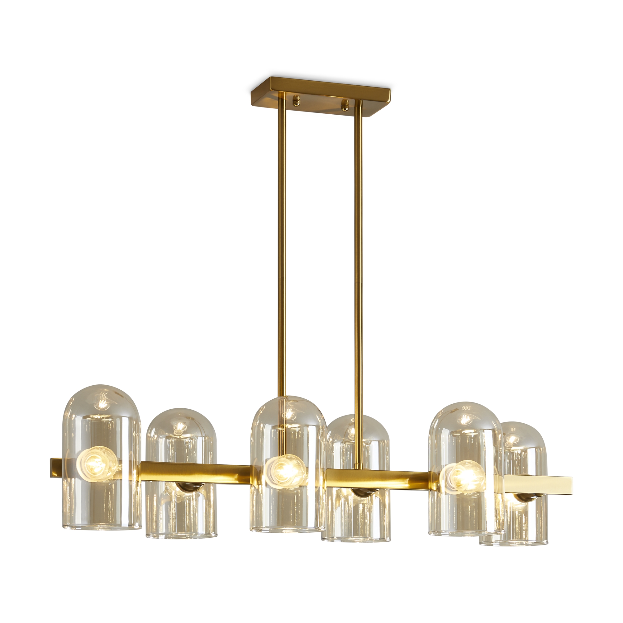 Арматура — металл. Цвет — латунь. Горизонтальные подвесы на твердой ножке. Плафоны из коньячного стекла в форме конуса. Направление плафона у настенного светильника можно регулировать за металлическое основание. Источник света лампа. Цоколь E14.