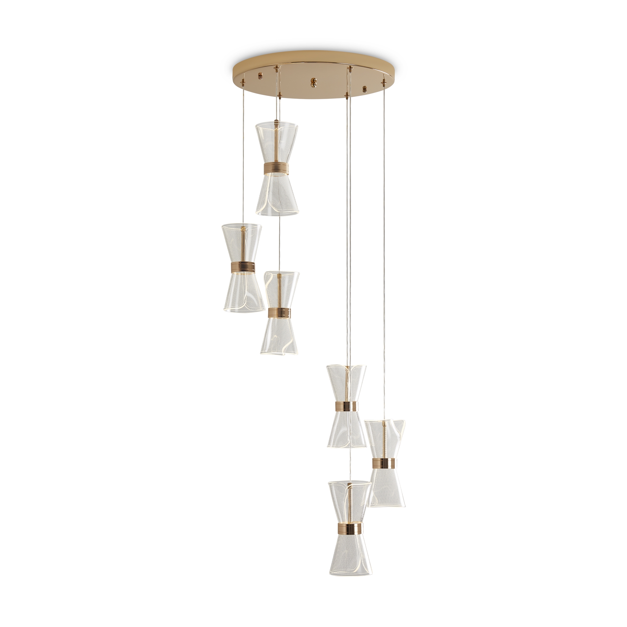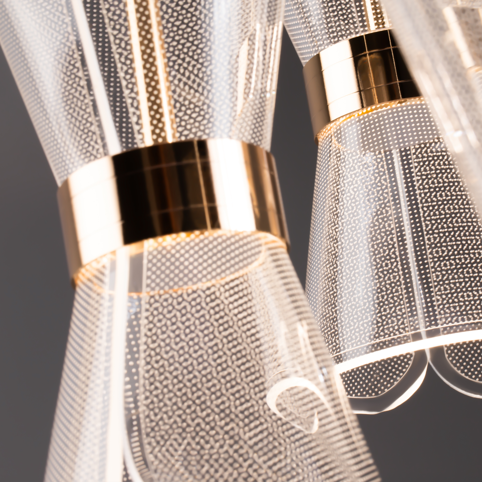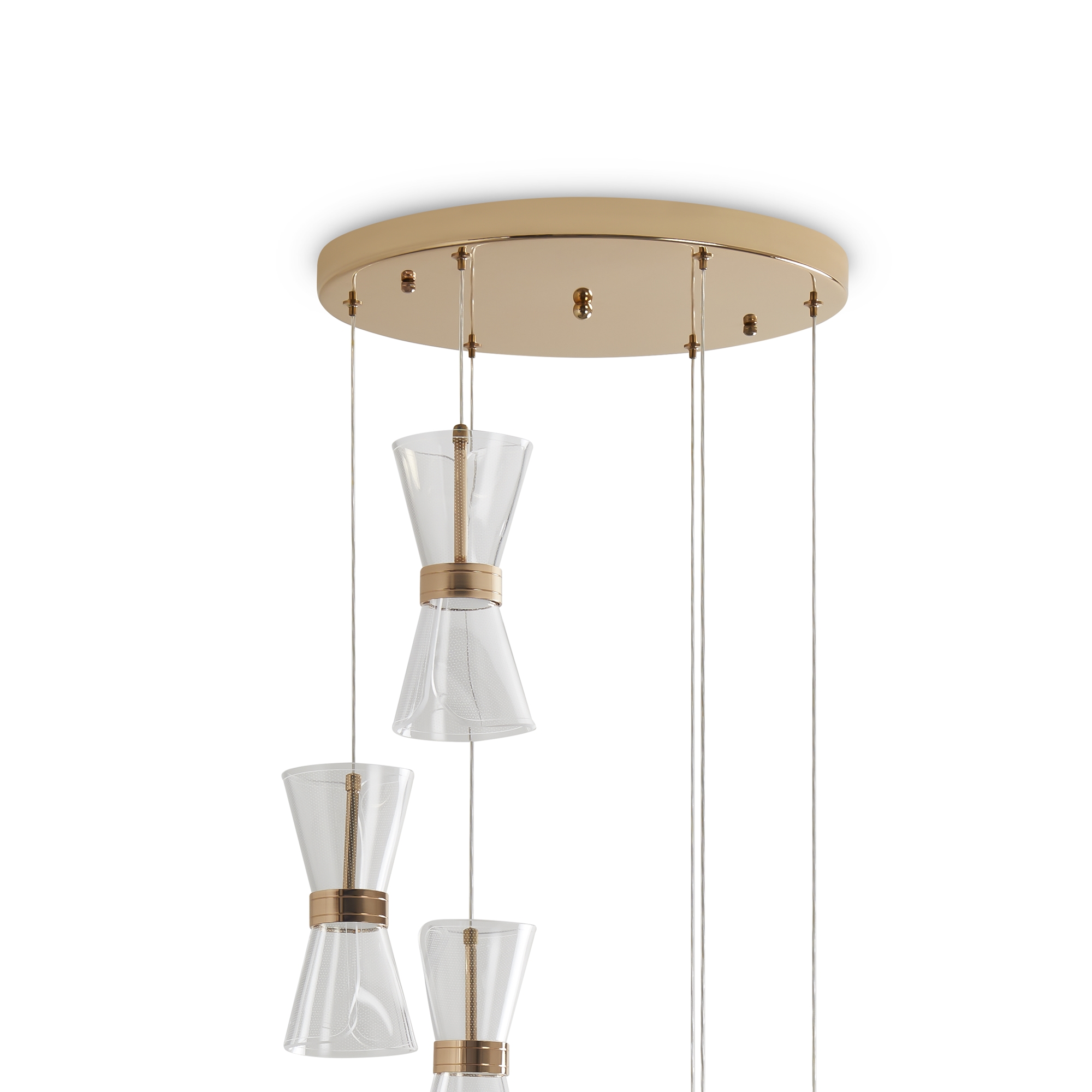 Арматура металл. Цвет золото. Плафоны из акрила. Форма песочные часы. Золотая окантовка как декоративный элемент. К светильникам прилагается пульт управления. LED источник света. Цветовая температура 2600-6000К.