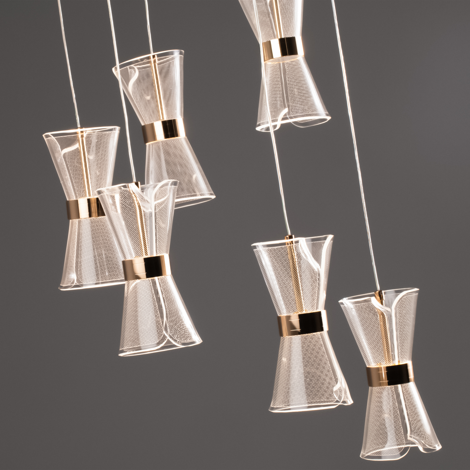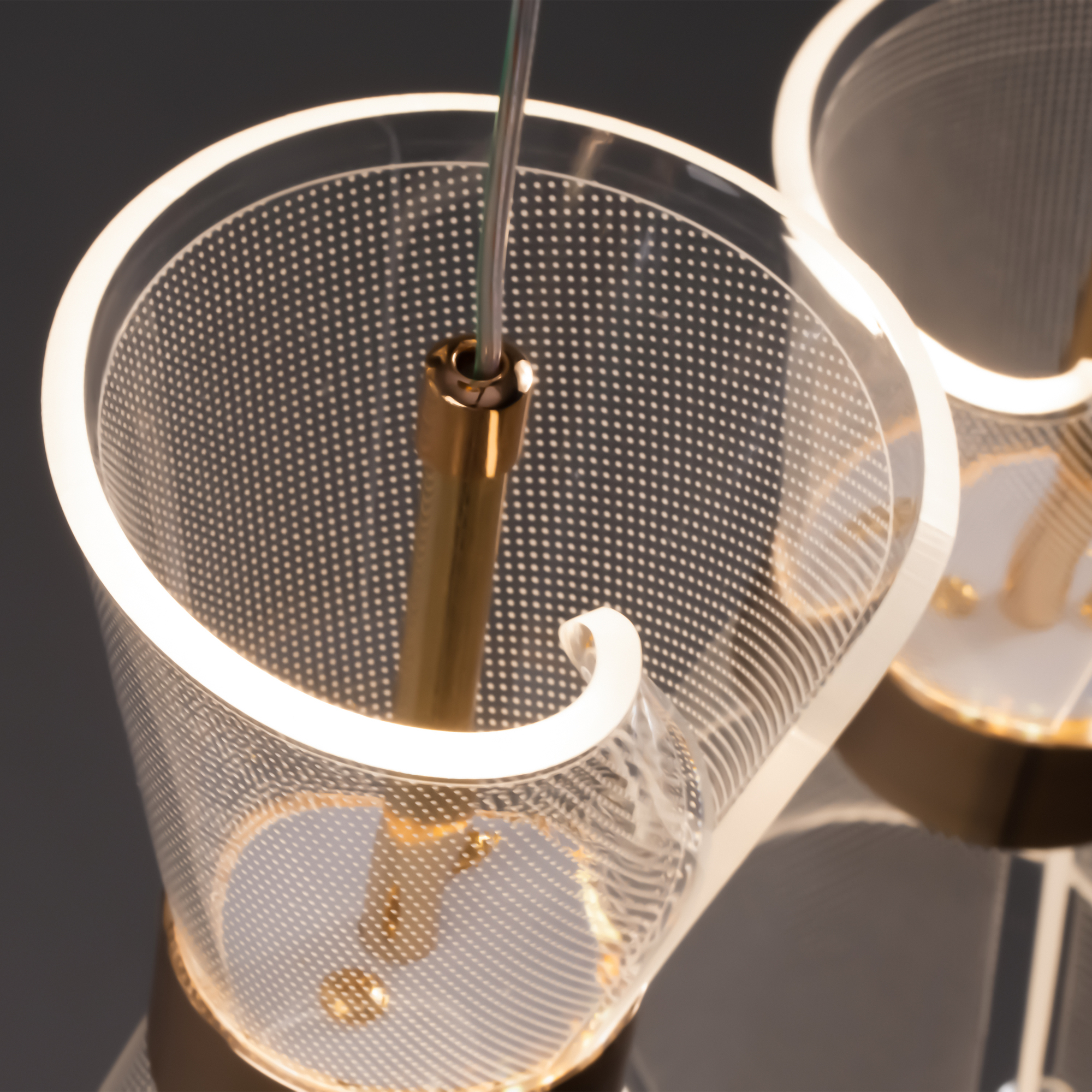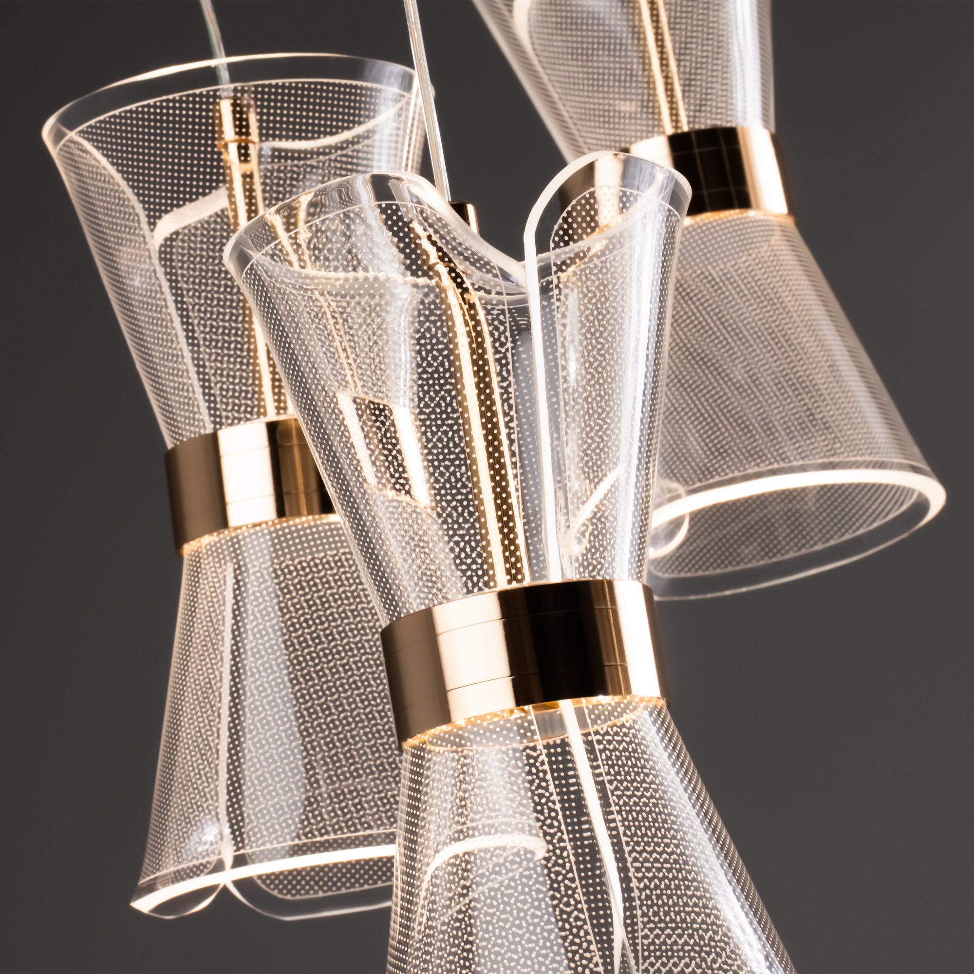 Арматура металл. Цвет золото. Плафоны из акрила. Форма песочные часы. Золотая окантовка как декоративный элемент. К светильникам прилагается пульт управления. LED источник света. Цветовая температура 2600-6000К.