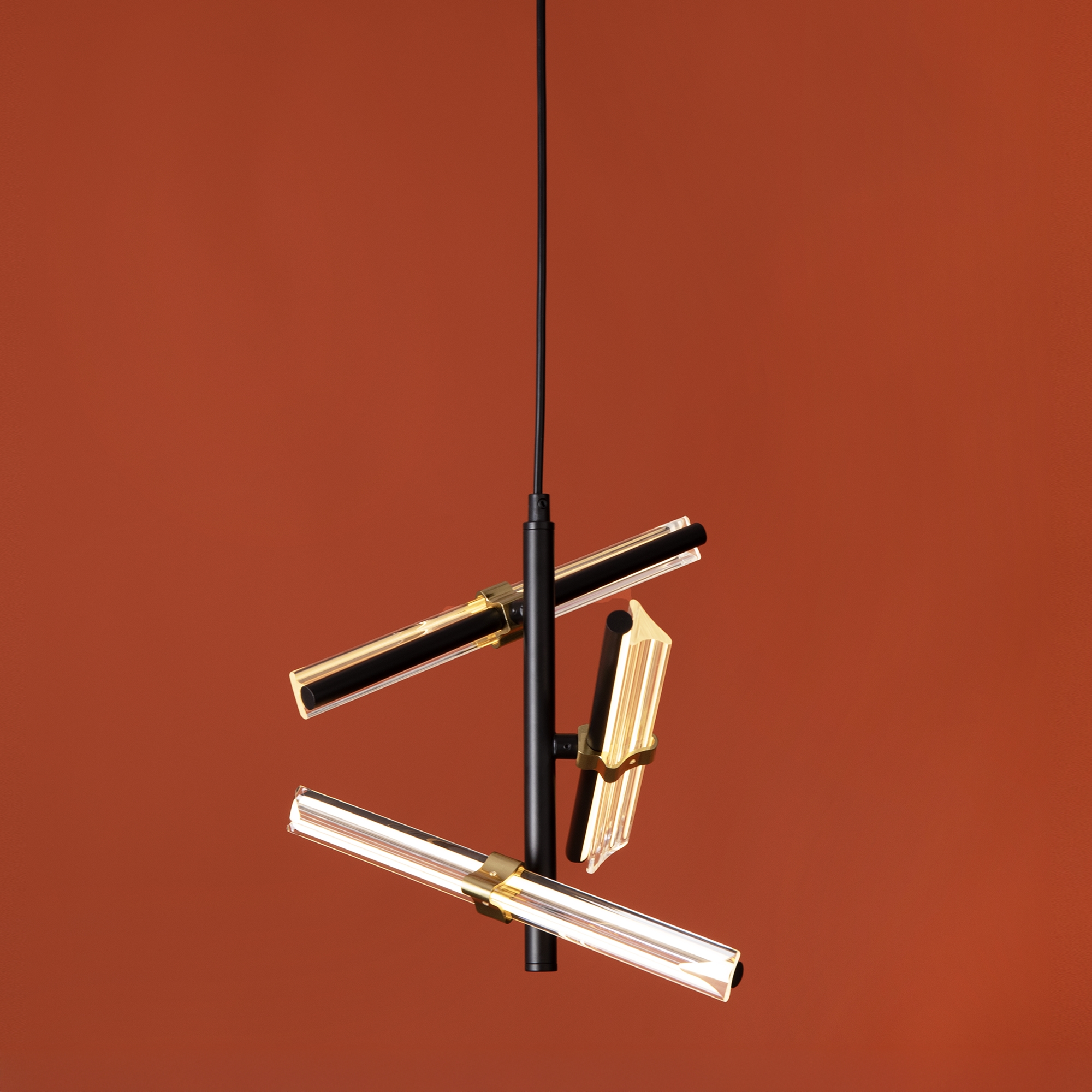 Материал арматуры — металл, цвет — черный и латунь. Все модели серии Brilliance оснащены LED-источником света. Цветовая температура 2700К. Прозрачные стеклянные рассеиватели. Регулируемая высота. Особенностью серии являются поворотные LED-трубки, позволяющие менять направление светового потока и создавать различные световые композиции.