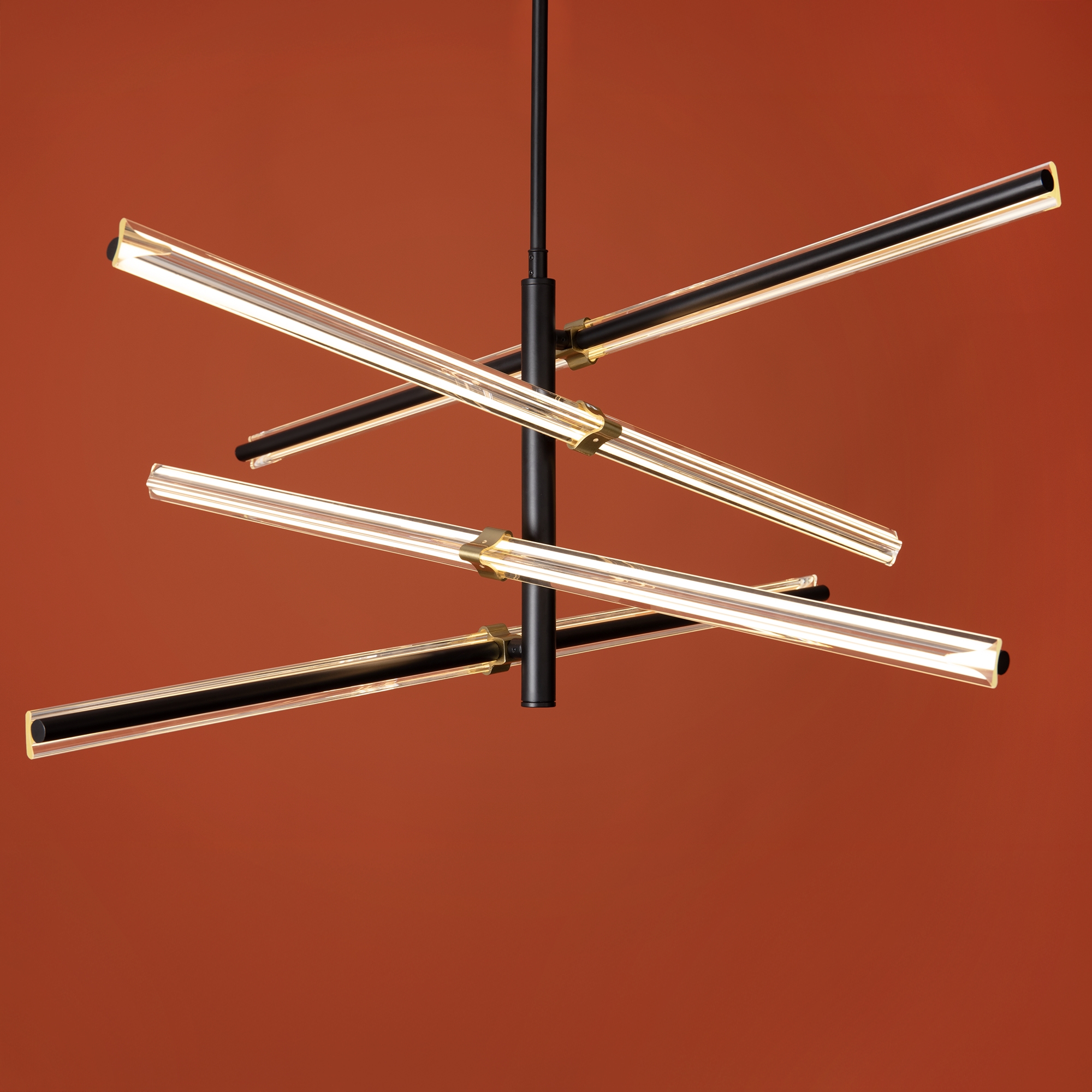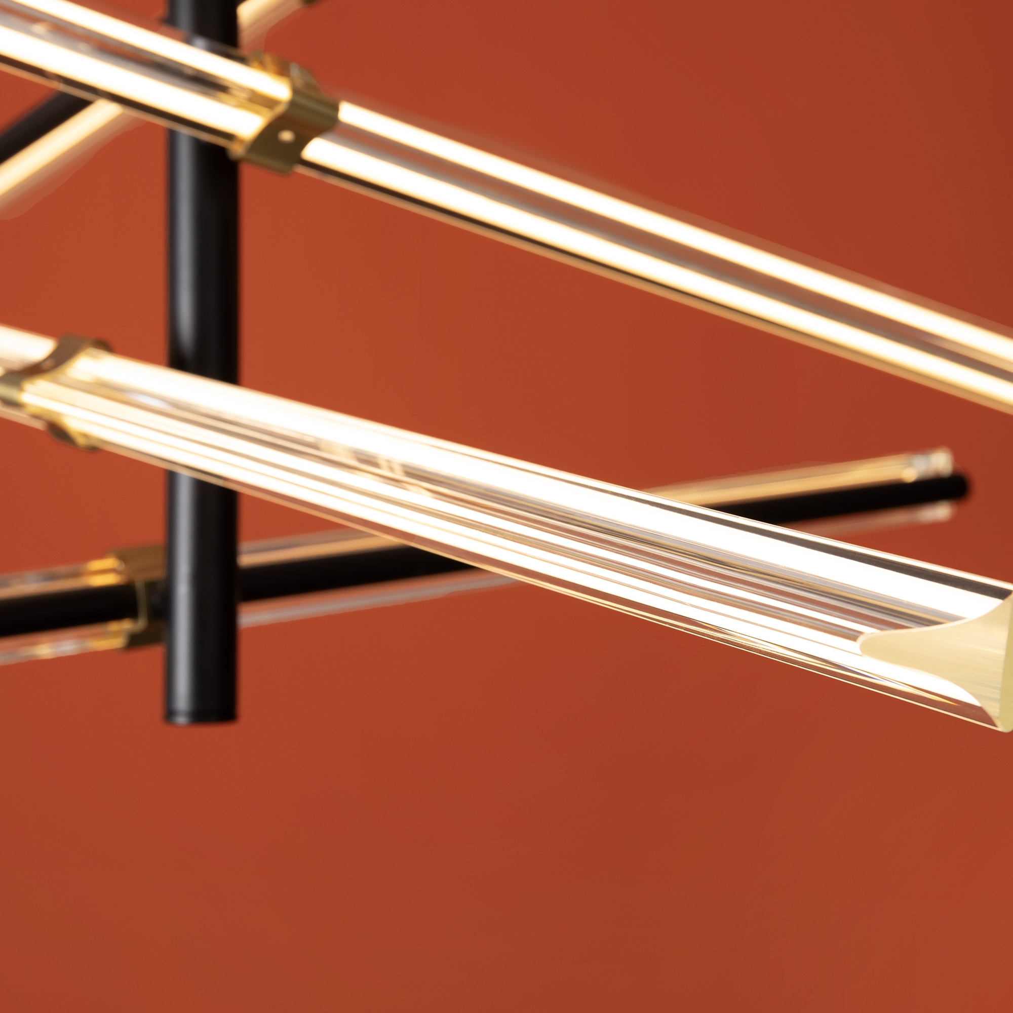 Материал арматуры — металл, цвет — черный и латунь. Все модели серии Brilliance оснащены LED-источником света. Цветовая температура 2700К. Прозрачные стеклянные рассеиватели. Регулируемая высота. Особенностью серии являются поворотные LED-трубки, позволяющие менять направление светового потока и создавать различные световые композиции.