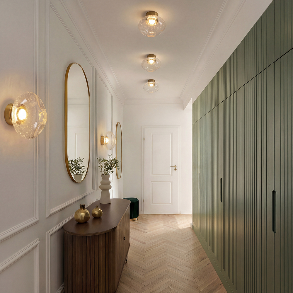 Арматура — металл. Стеклянные плафоны с пузырьками в трёх цветах: дымчатый, прозрачный, янтарный. Интегрированный LED источник света 3000К, Ra 80, угол 180°. Высота регулируется.
