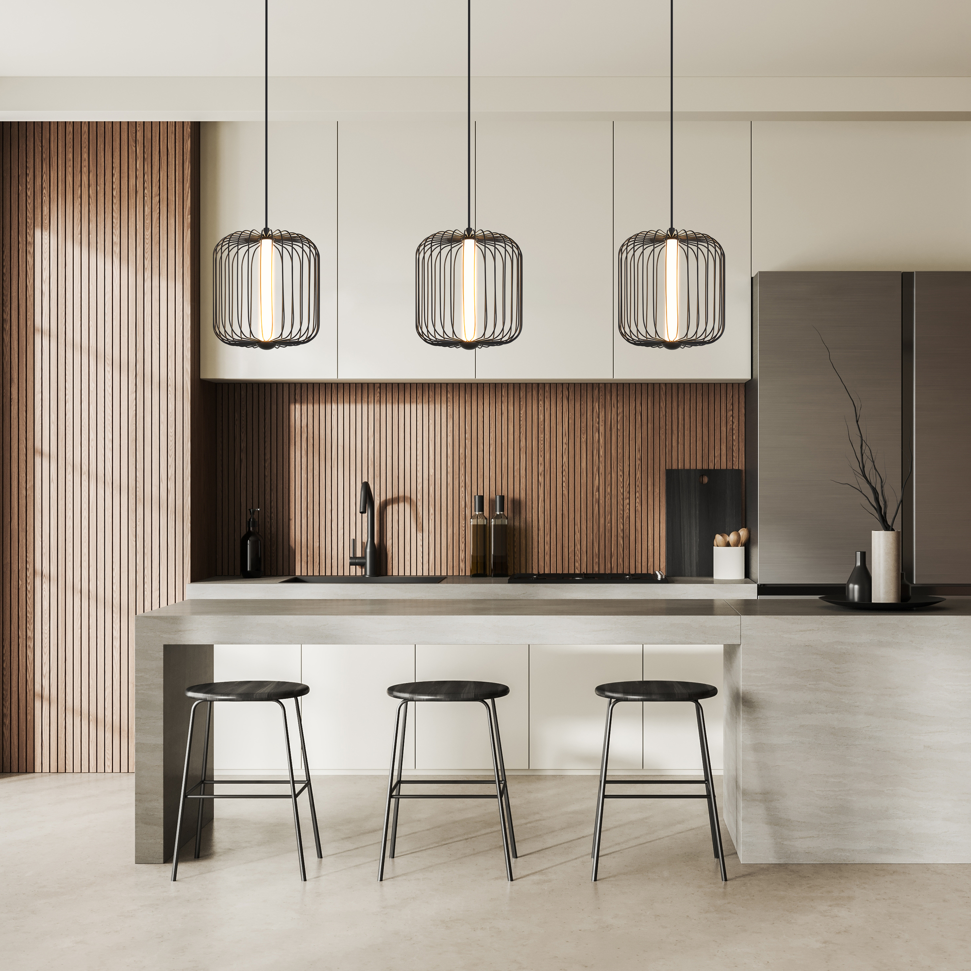 Арматура и плафоны из металла. Цвета - черный и латунь. Источник света - LED-трубка. Три формы плафонов для создания композиции в интерьере. Цветовая температура 3000К.