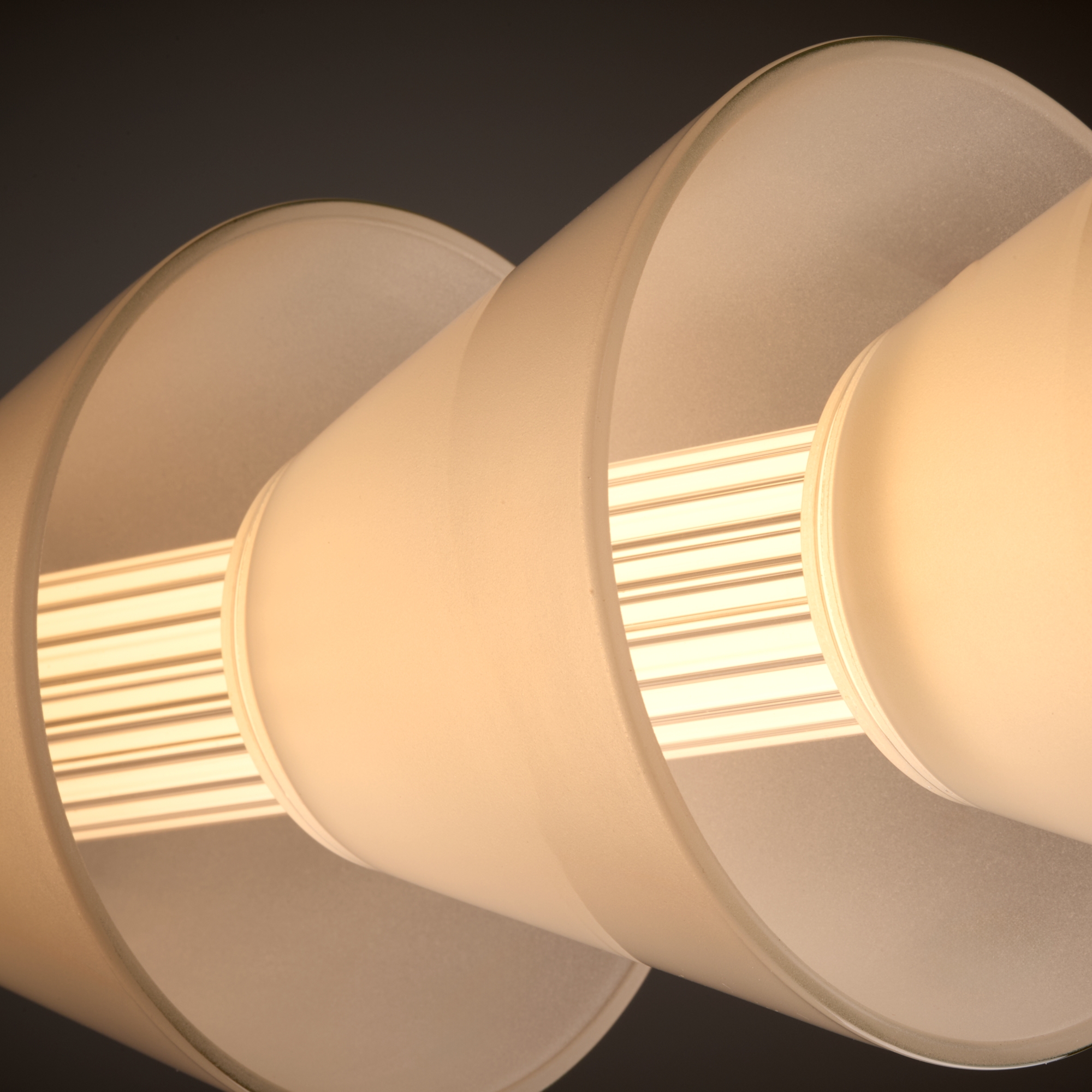 Арматура из металла. Цвет латунь. Плафон из матового, кристально прозрачного и дымчатого стекла. Горизонтальные и вертикальные подвесы. LED источник света. Цветовая температура 3000К.