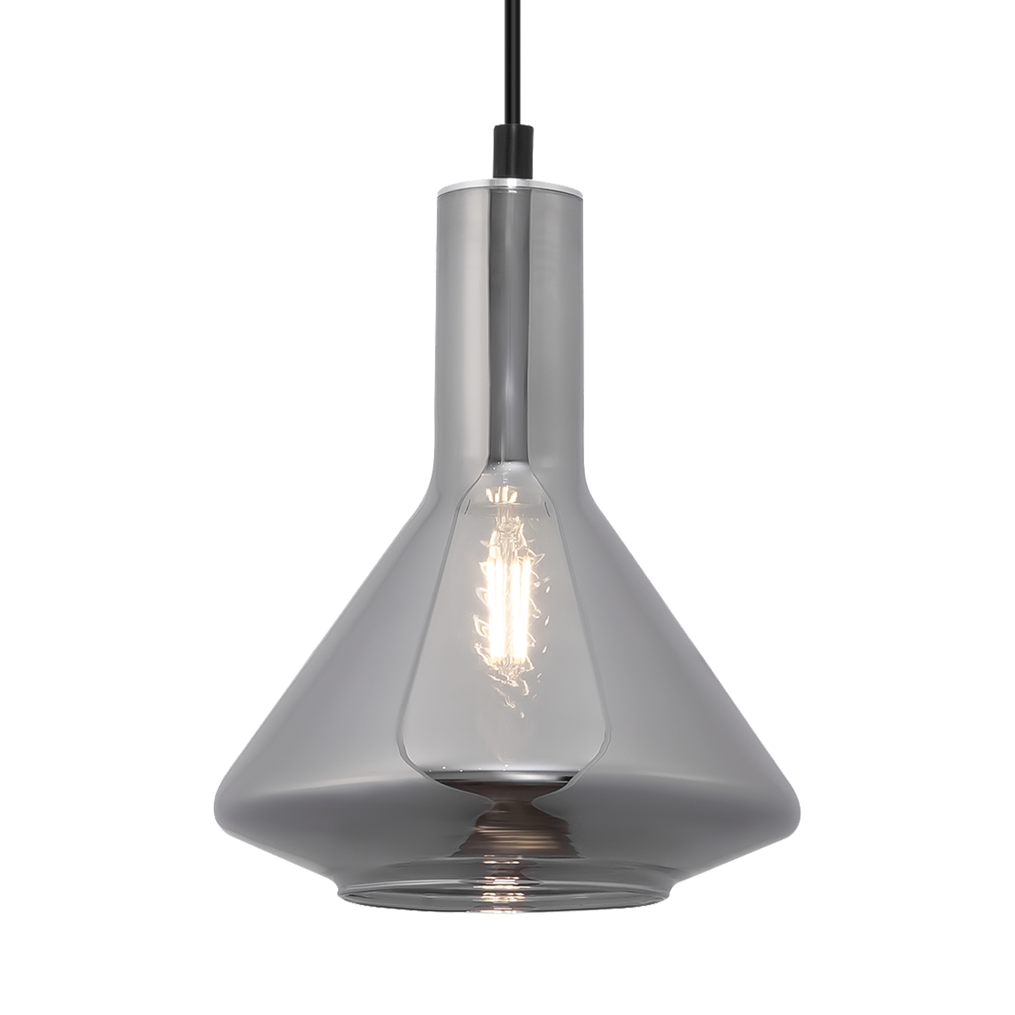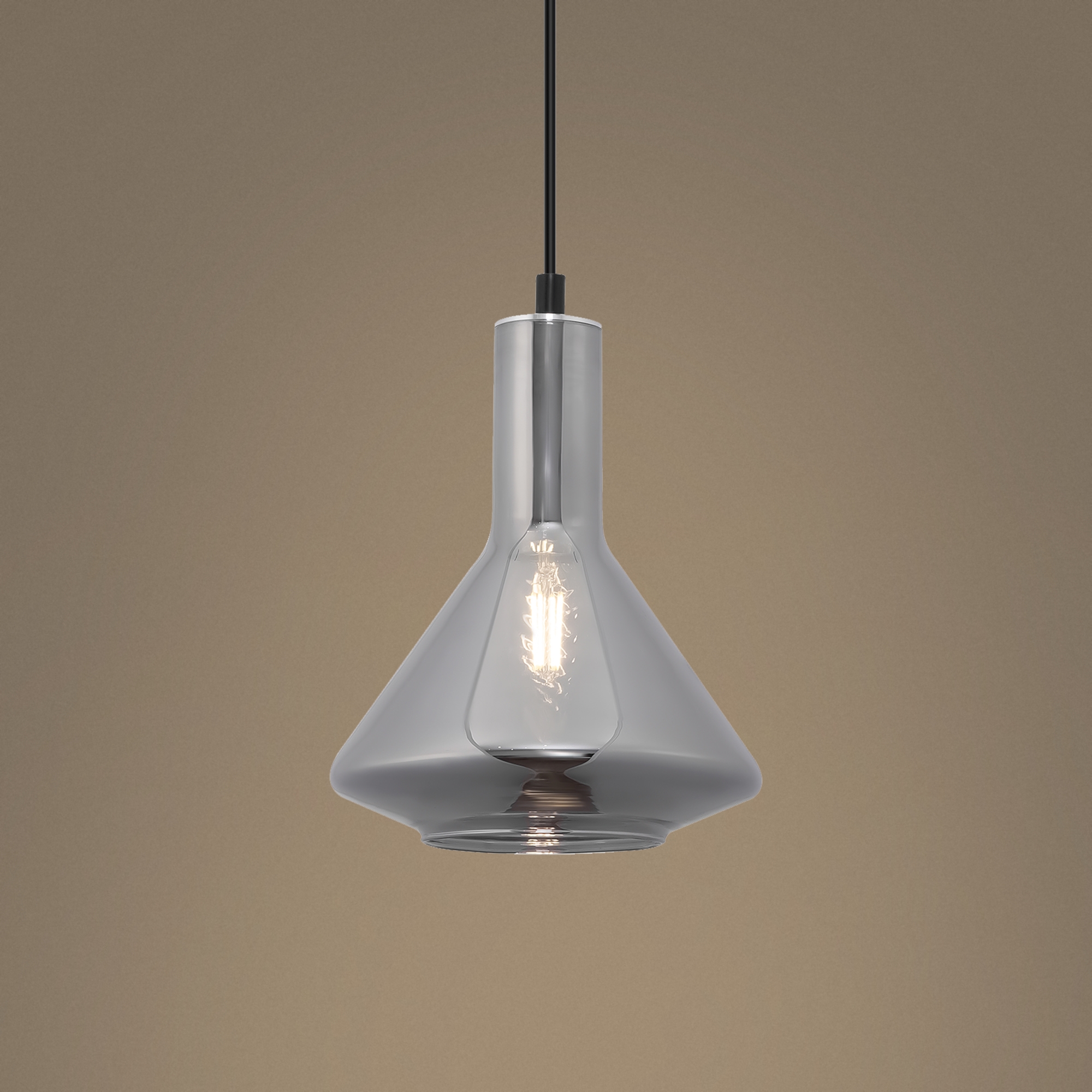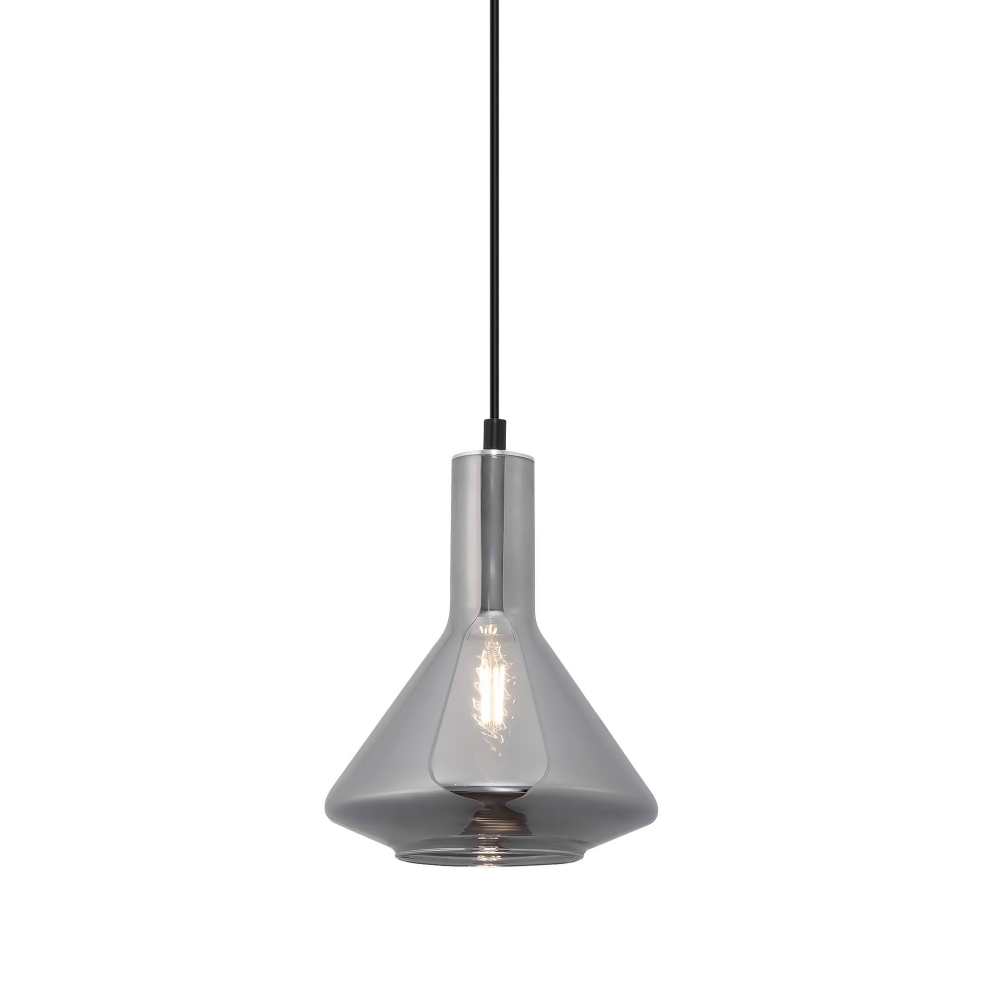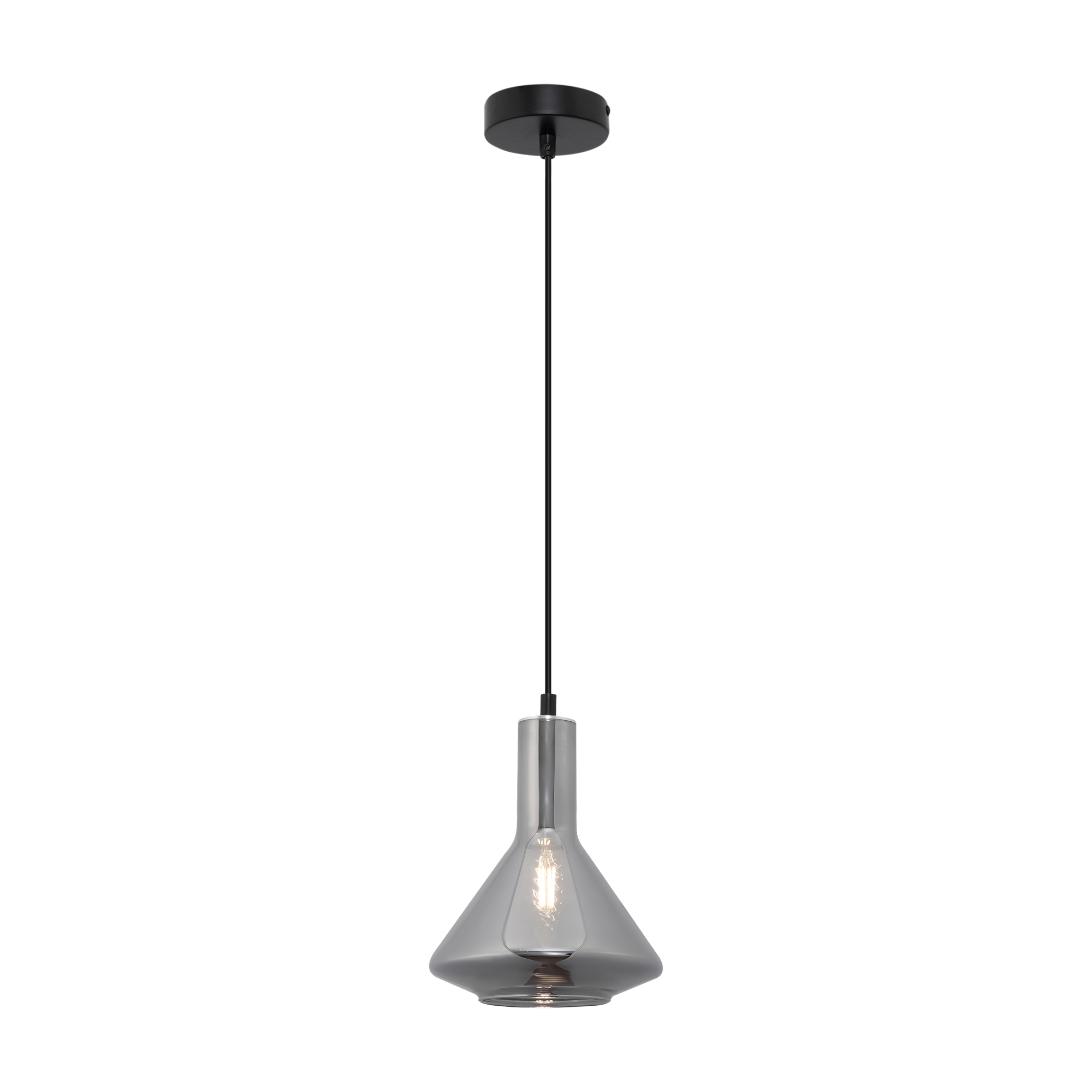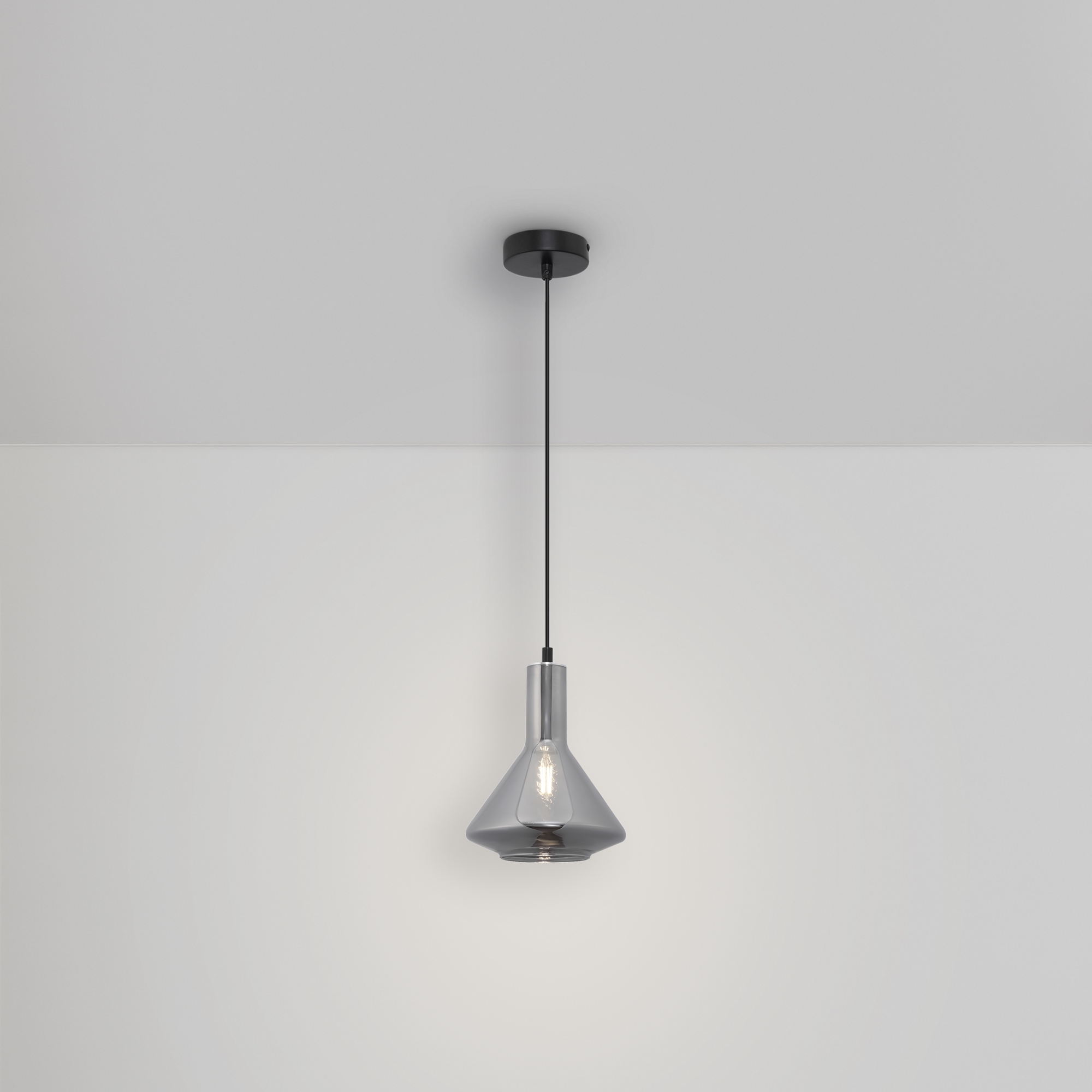 Металлическая арматура черного цвета. Плафон из глянцевого стекла серого оттенка. Нетривиальная форма плафона, расширенная к низу. Источник света – лампа с цоколем E14.