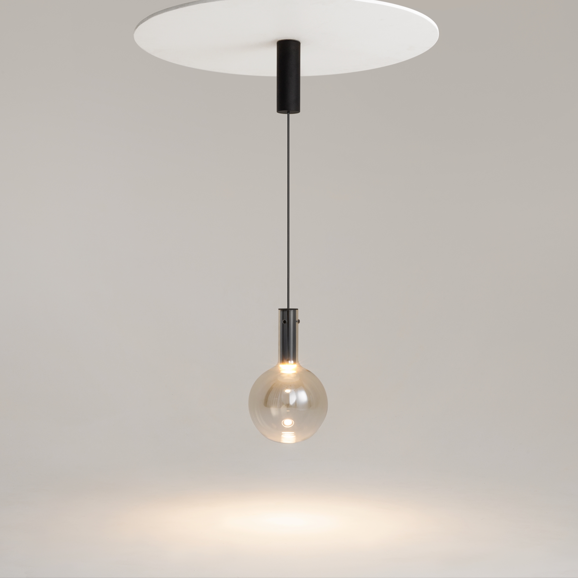 Металлическая арматура, цвет - черный, белый. Выдувной плафон-шар из стекла с вытянутым цилиндрическим основанием в трех цветах: дымчато-черный, туманно-белый, бежево-коньячный. LED-источник света в основании плафона. Цветовая температура 3000К. Два диаметра плафонов и регулируемая длина проводов для создания разнообразных композиций.