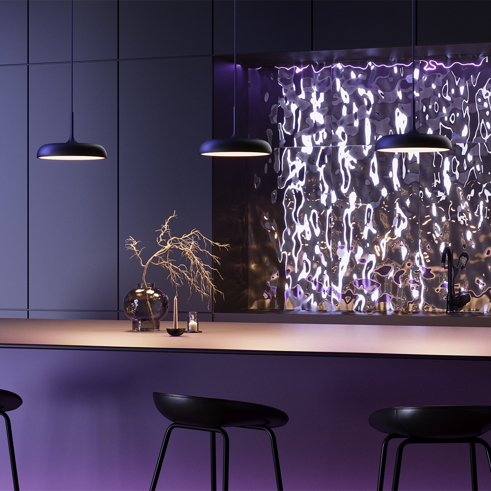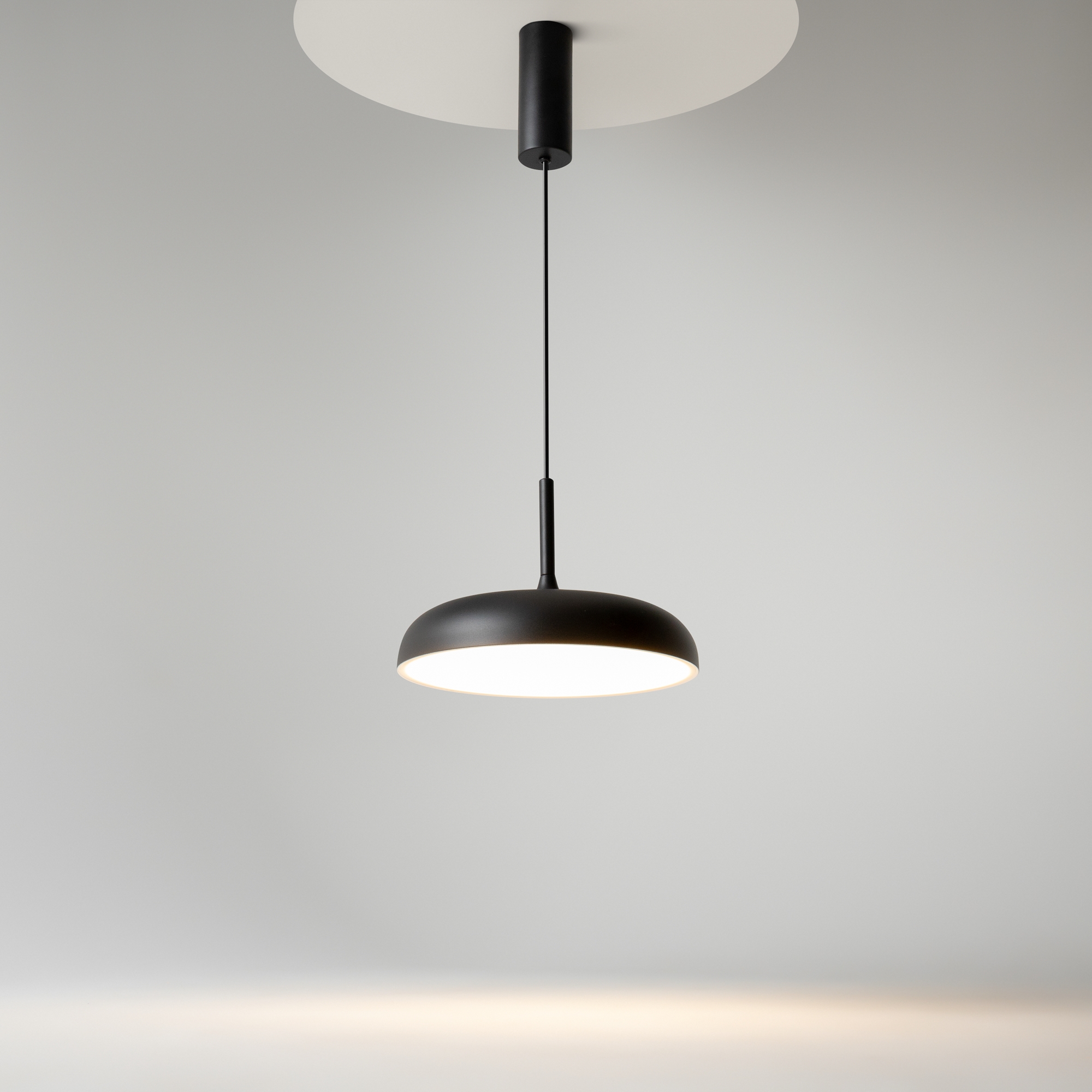В минималистичной серии Gerhard представлены светильники в двух диаметрах (300 мм и 400 мм), двух цветах (черный и белый), а также в двух форматах. Первое поколение светильников – классические – направленный вниз свет, длина провода 3 метра. Второе поколение светильников – функциональные – двунаправленный источник света (вверх и вниз) и лифтовый механизм с проводом 2 метра, что позволяет менять высоту расположения светильника одним движением. LED-источник света с цветовой температурой 3000K.