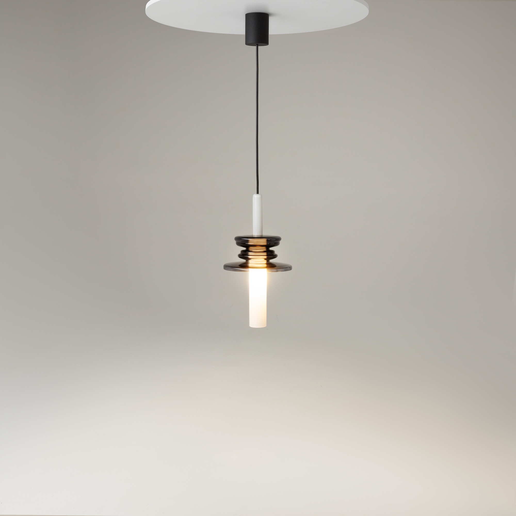 Уникальная многослойная конструкция в образе звуковой волны. Магнитная потололчная чаша из металла без видимых креплений. Плафон-трубка из белого полупрозрачного стекла. Декоративный волнообразный «звуковой» элемент из литого стекла в центре плафона. Цвета - синий, черный, золото, серый. Источник света - лампа с цоколем G9.