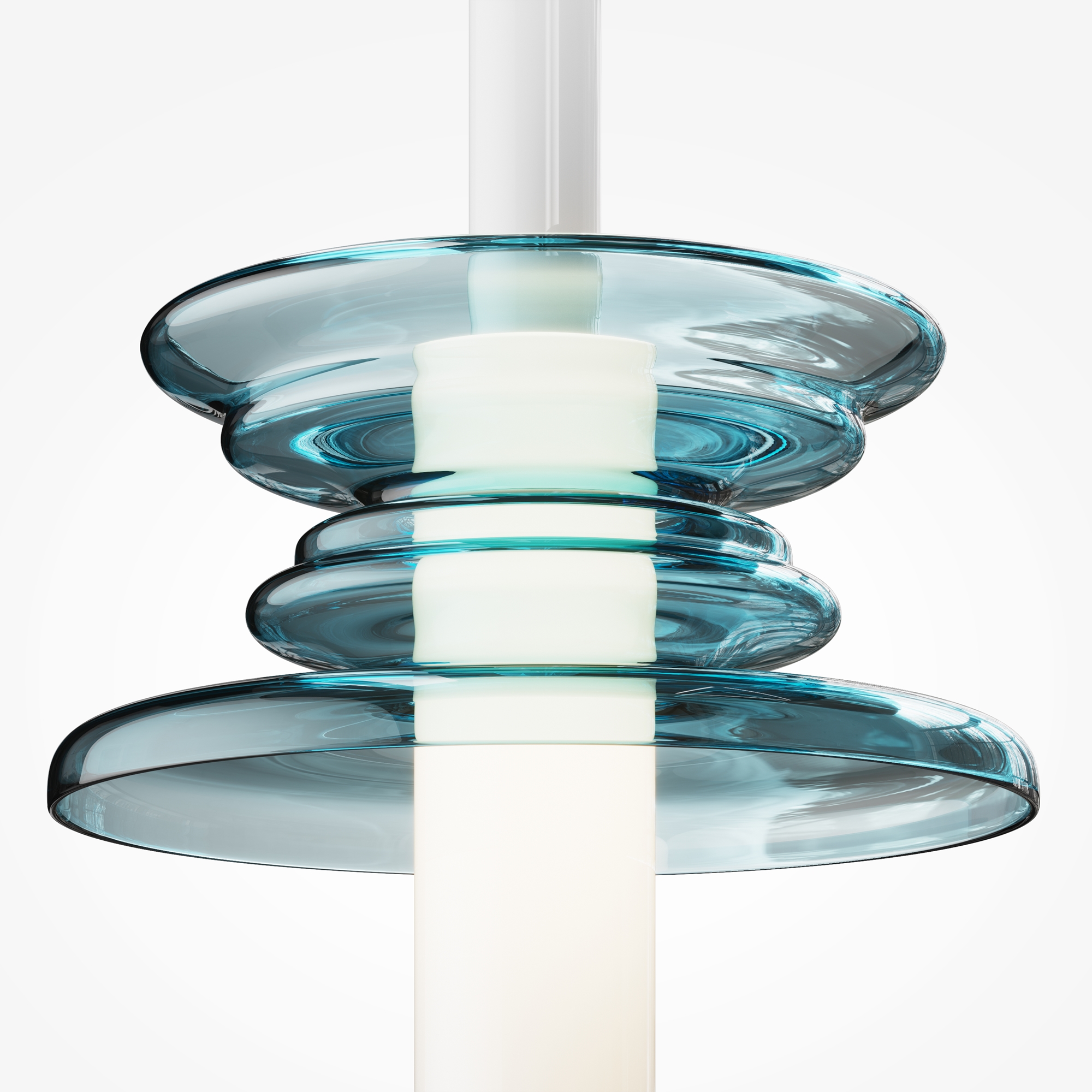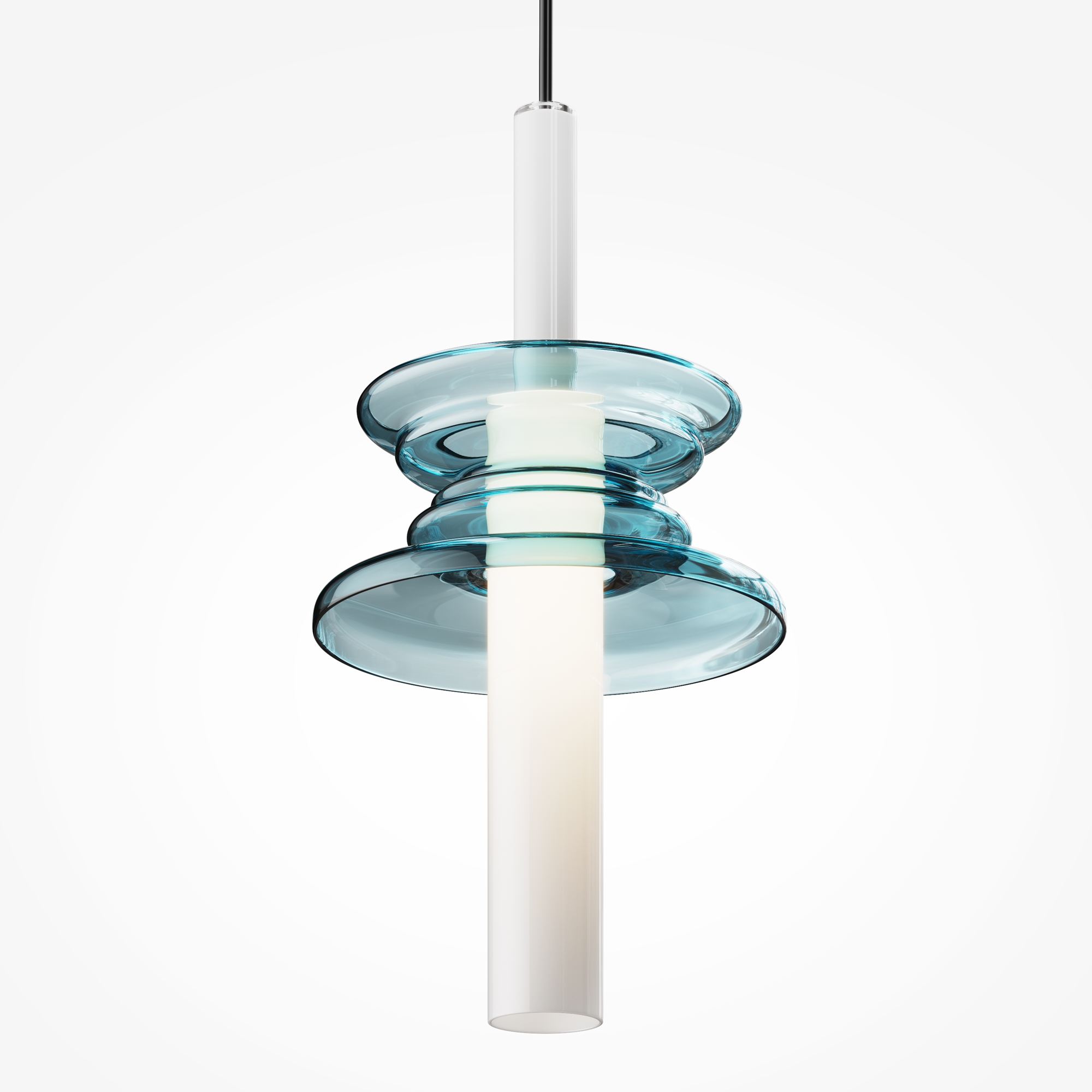 Уникальная многослойная конструкция в образе звуковой волны. Магнитная потололчная чаша из металла без видимых креплений. Плафон-трубка из белого полупрозрачного стекла. Декоративный волнообразный «звуковой» элемент из литого стекла в центре плафона. Цвета - синий, черный, золото, серый. Источник света - лампа с цоколем G9.