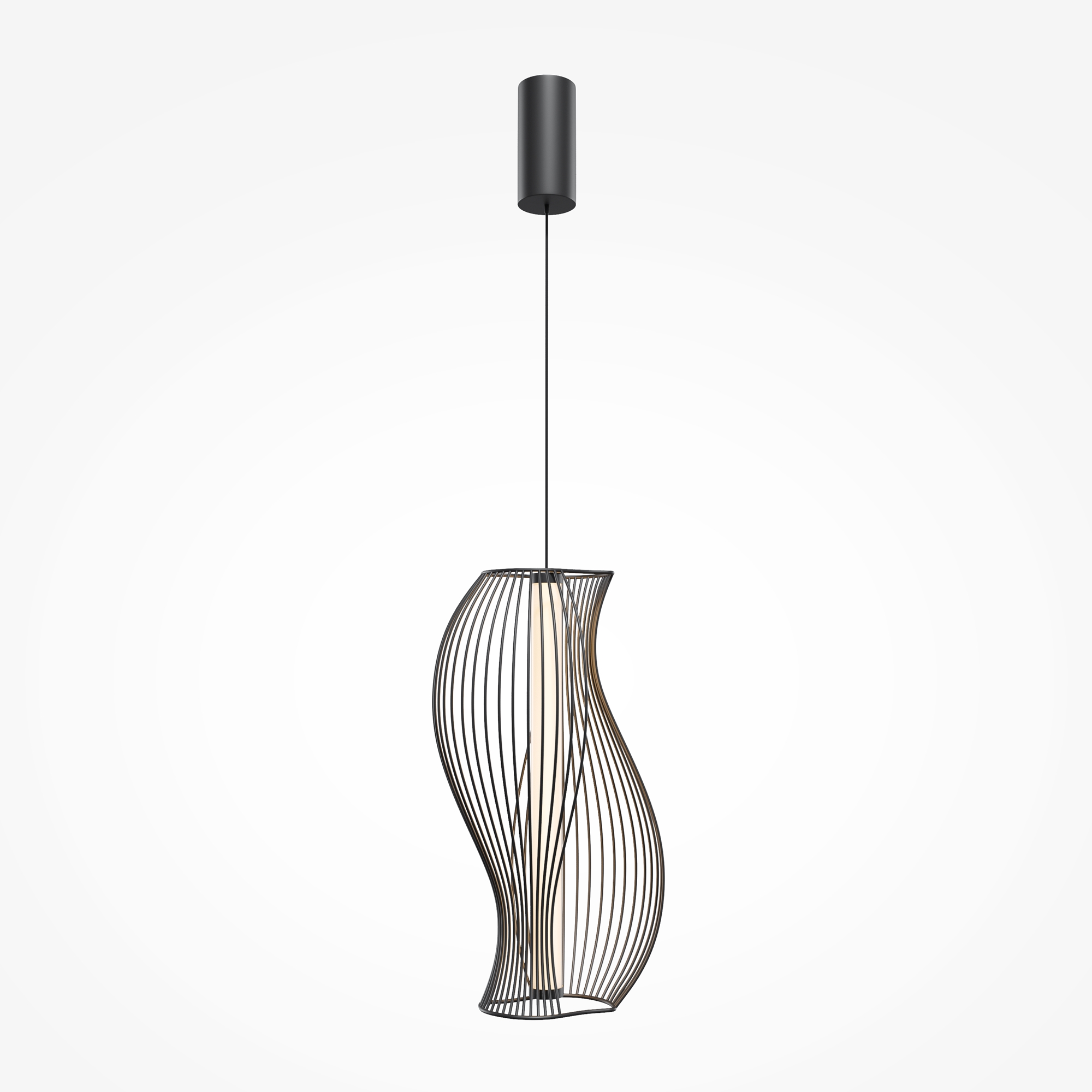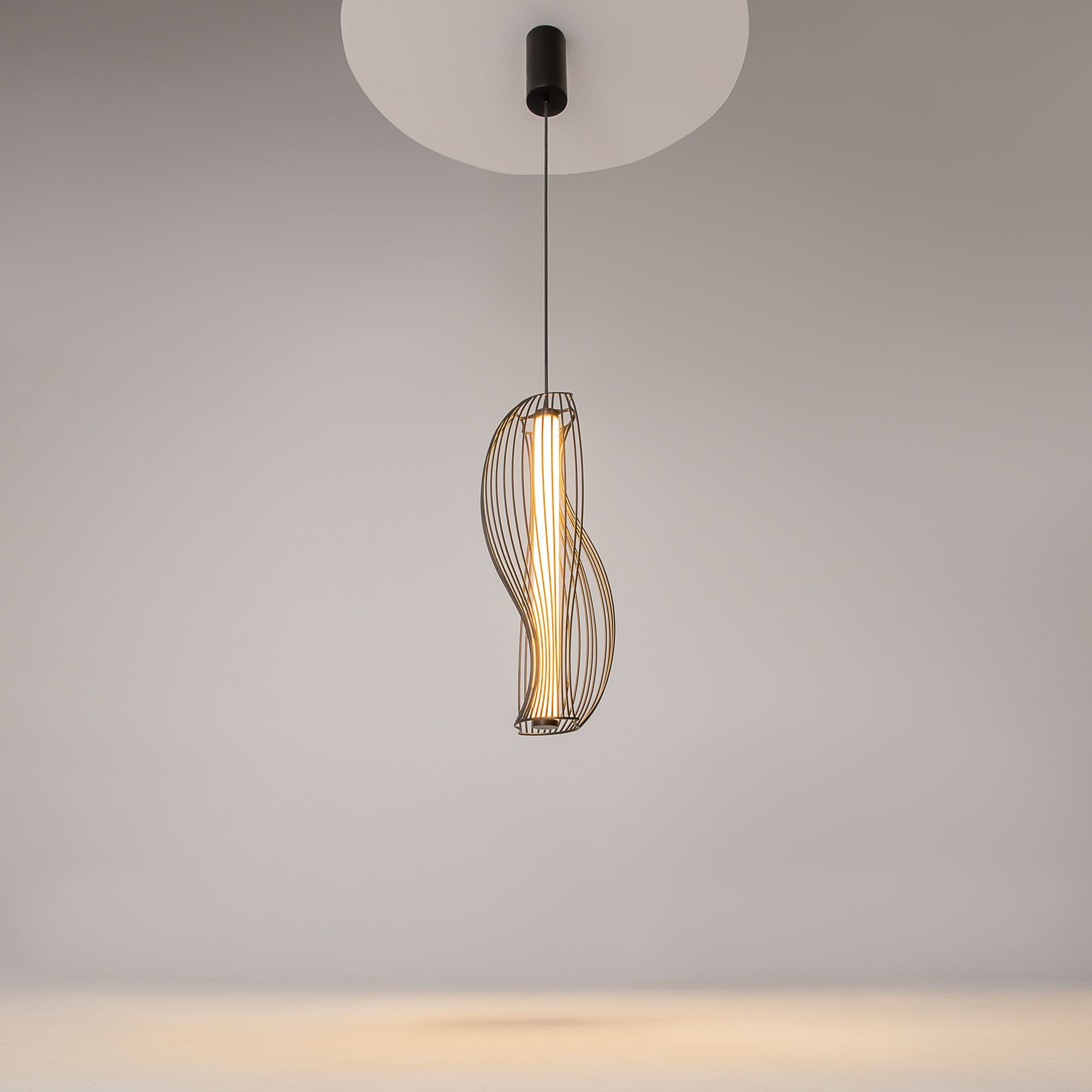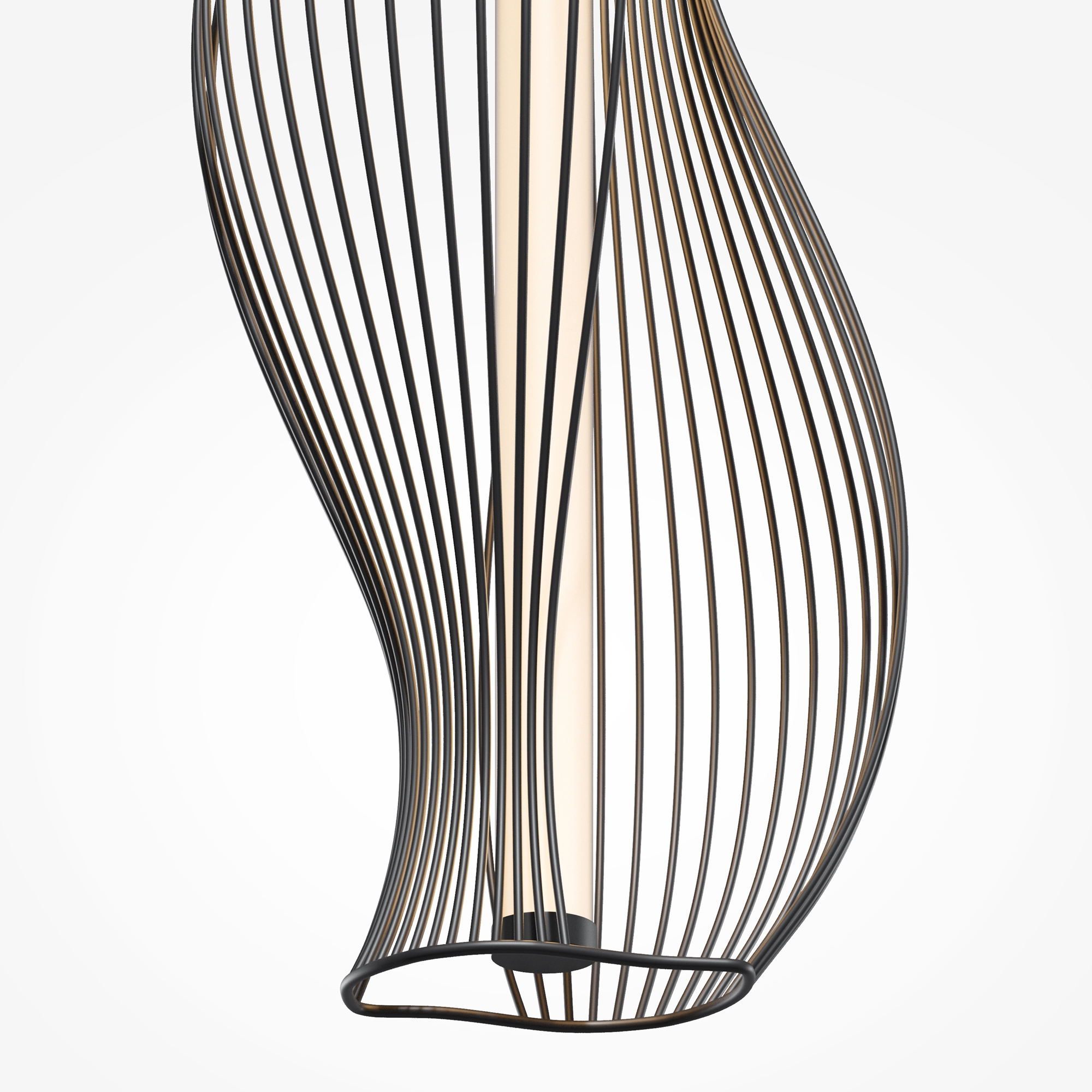 Два цветовых решения: черный и латунь. Абажуры из проволоки в асимметричном исполнении. Оригинальный дизайн, вдохновленный силуэтами античных амфор. Центральный LED-источник света с матовым рассеивателем. Регулируемая высота подвеса и провод длиной 3 метра. Возможность создания композиций.