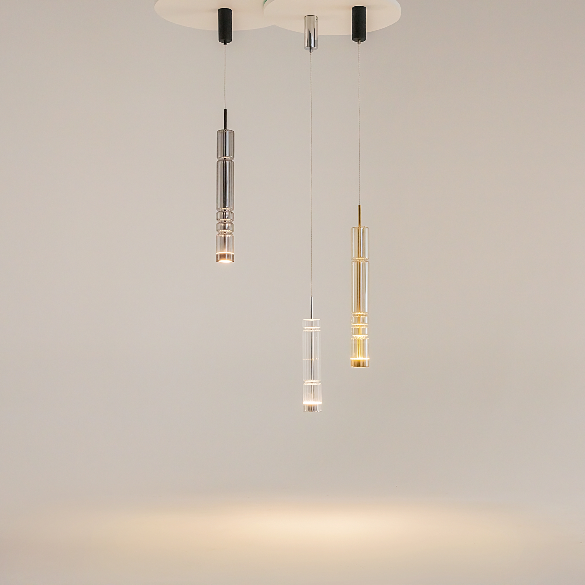 Арматура - металл, цвет - хром, черный. Цилиндрические плафоны из стекла с вертикальным рельефным рисунком в трех оттенках: прозрачный, коньячный, дымчатый. Метафора древнегреческих храмовых колонн в образе светильников. LED-источник света. Цветовая температура 3000К.
