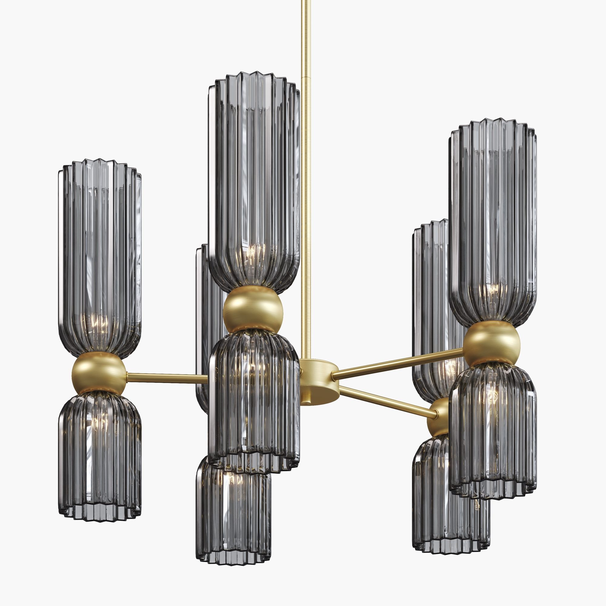 Металлическая арматура в цвете золота.Стеклянные плафоны нескольких цветов: коньячный, белый, серый. Рифленая поверхность стекла усиливает световые эффекты. Сменные источники света. Высота подвесных светильников регулируется сегментами штанги или с помощью трехметрового провода. Серия может использоваться в помещениях с высокими потолками. Доступны подвесные и настенные модели для создания разнообразных световых композиций.