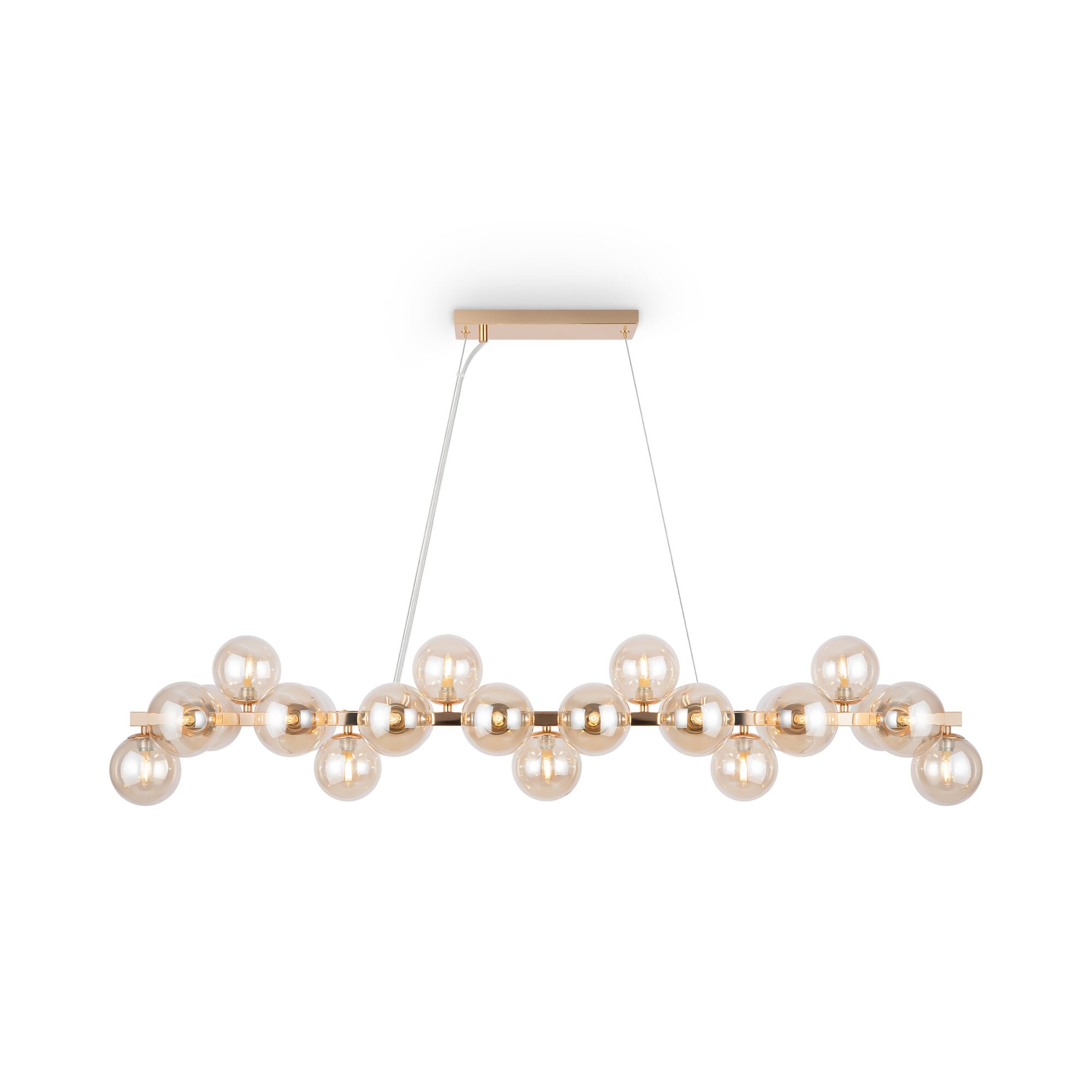 Металлическая арматура в четырех цветах: матовый черный, хром, золото, латунь. Плафоны — выдувное стекло. Цвета — дымчатый, янтарный, коньячный. Дизайн с имитацией молекулярной структуры. Высота подвесных светильников регулируется тросом. Лампа с цоколем G9.