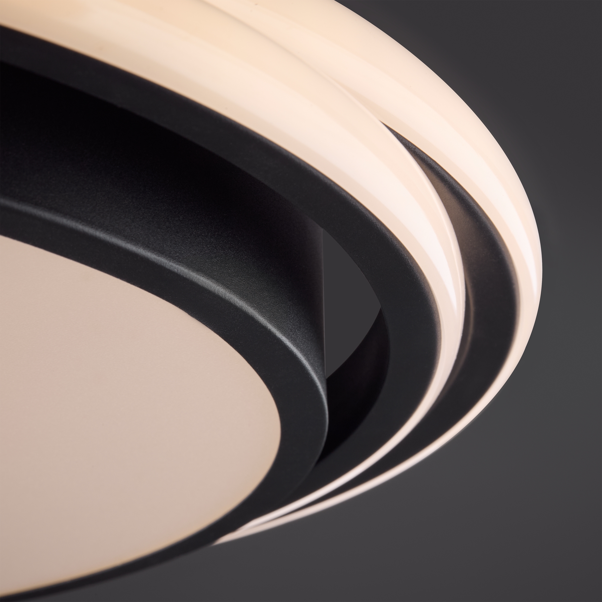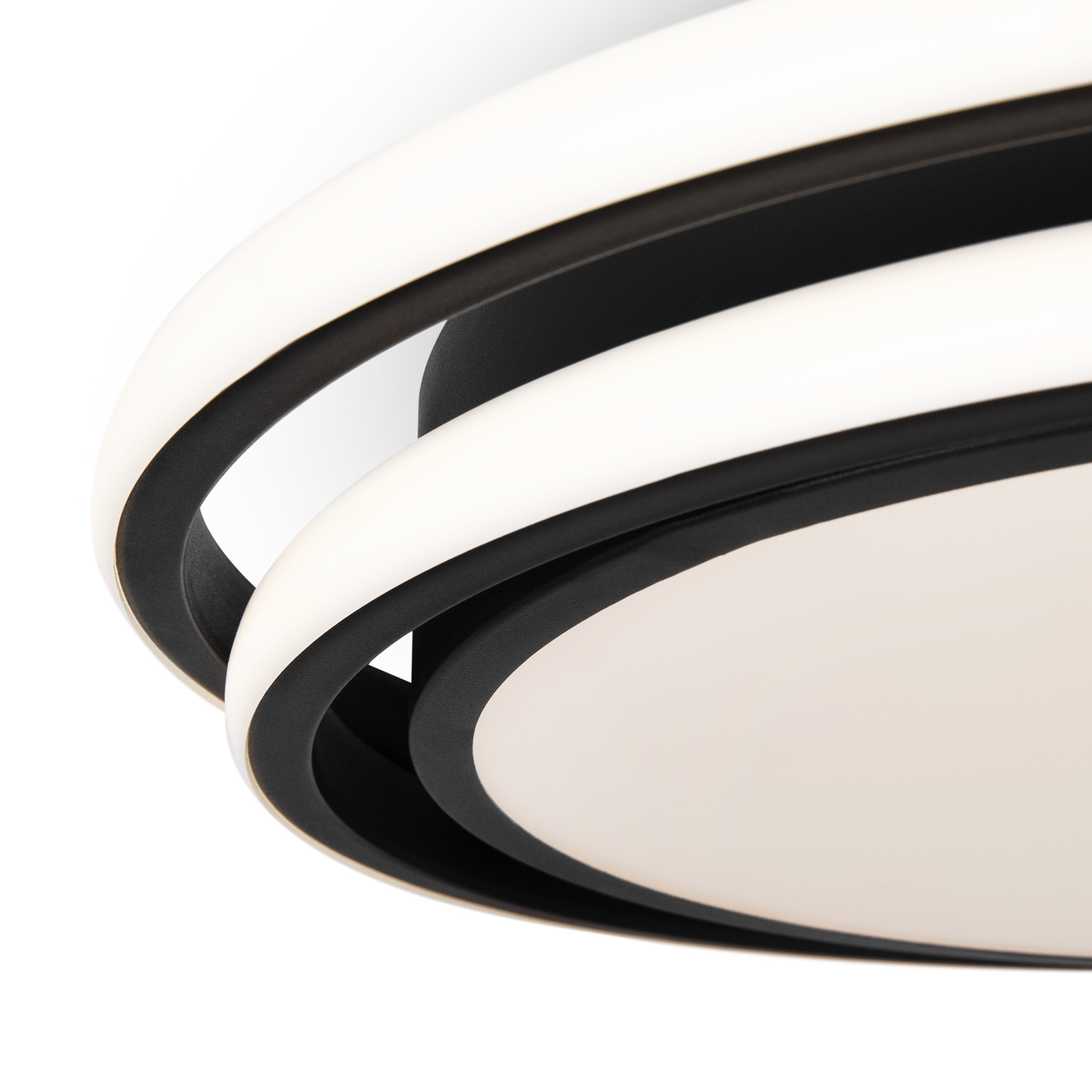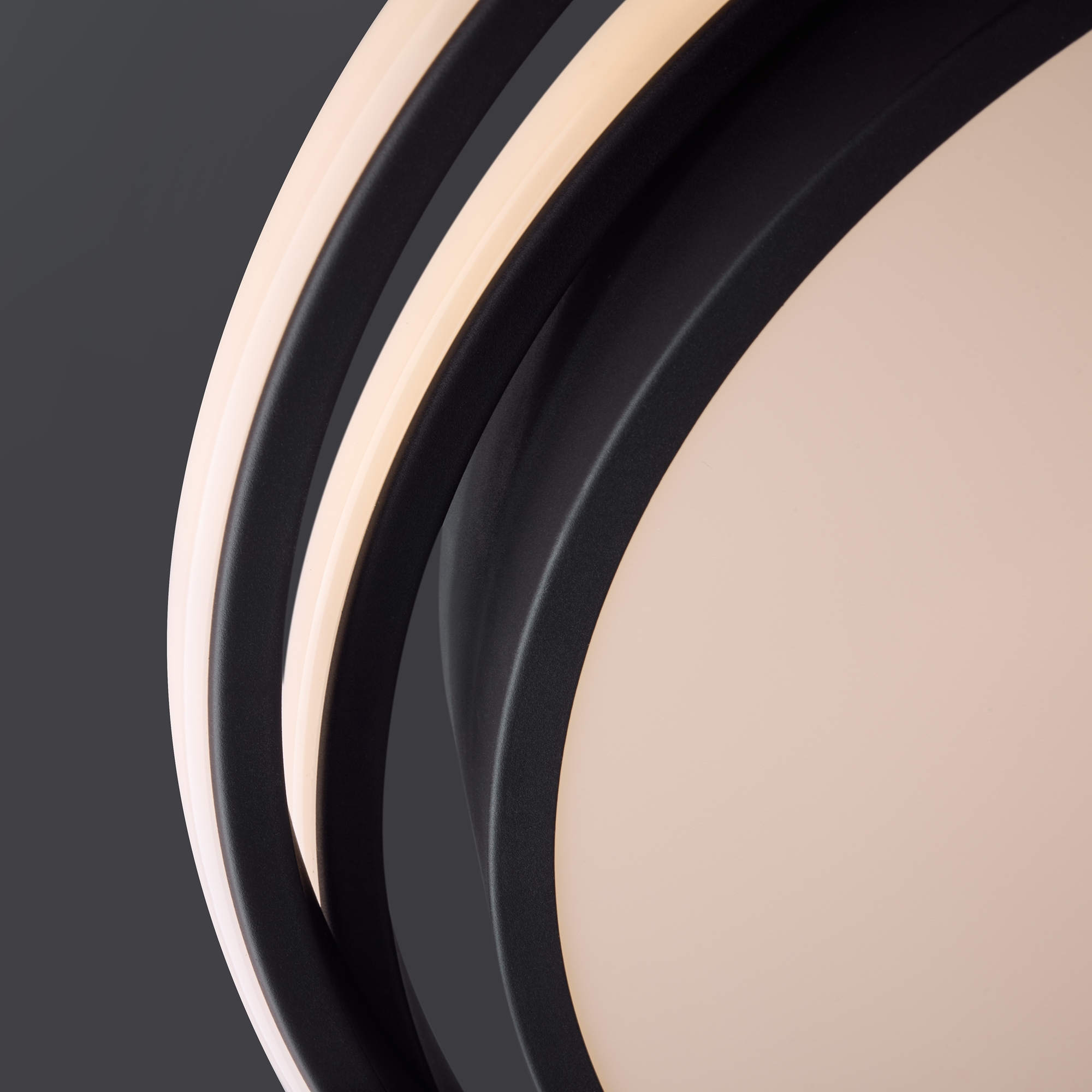 Арматура из металла и акрила. Цвет – черный. Трендовый элемент дизайна – кольца, расположенные под необычным углом. Энергоэффективный LED-источник дает яркую и комфортную для зрения подсветку.