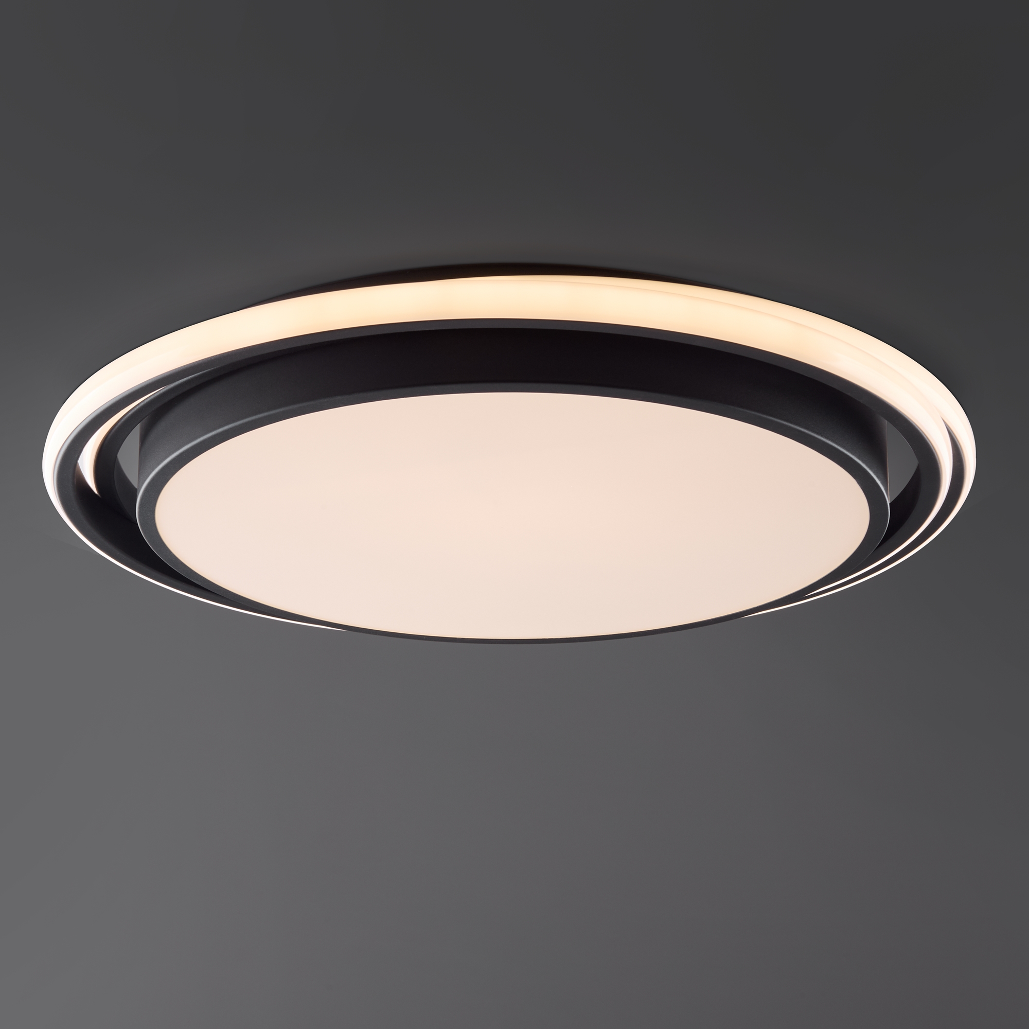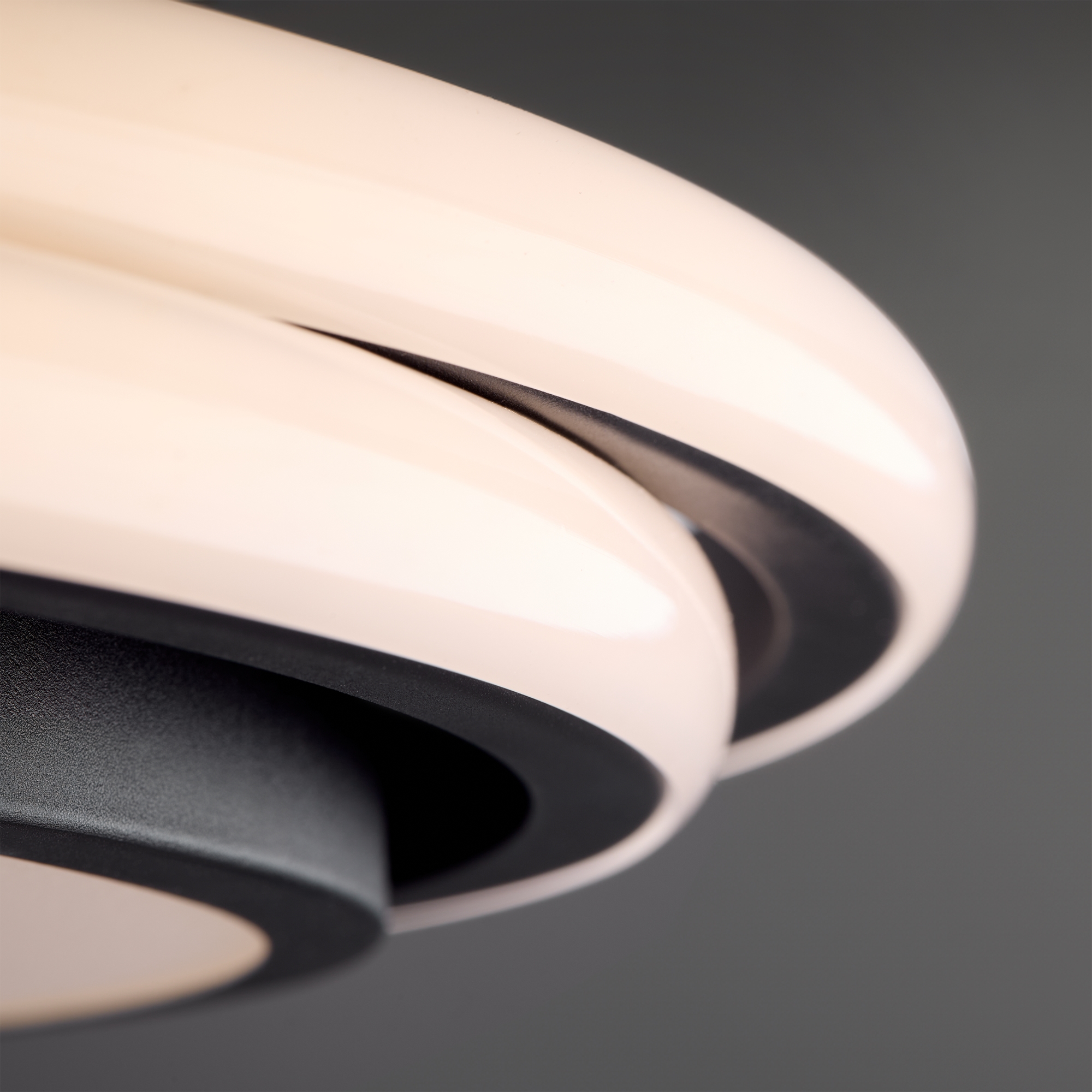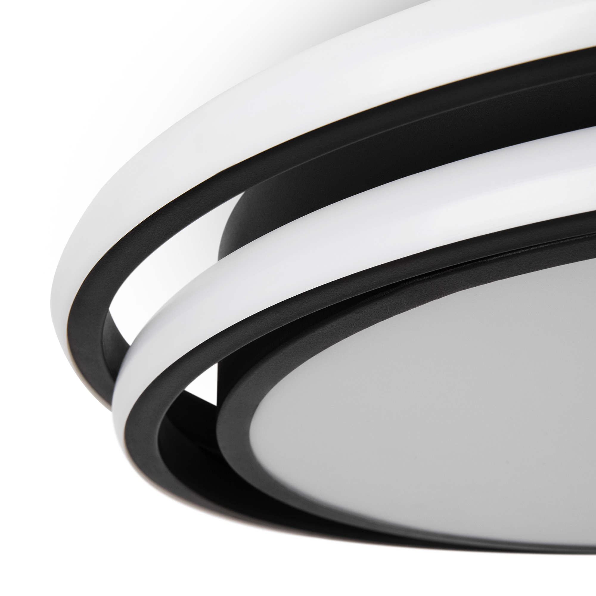 Арматура из металла и акрила. Цвет – черный. Трендовый элемент дизайна – кольца, расположенные под необычным углом. Энергоэффективный LED-источник дает яркую и комфортную для зрения подсветку.