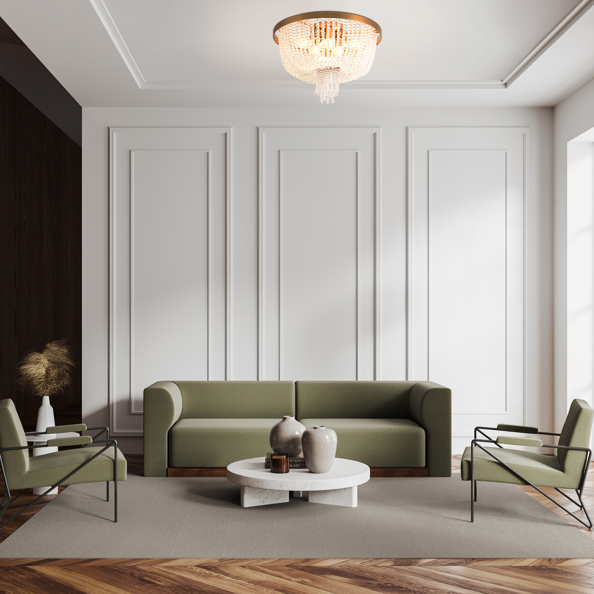 Материал абажура — хрустальное стекло, цвет — прозрачный. Металлическая арматура в цвете латунь. Потолочный светильник не регулируется по высоте. Источник света — лампы с цоколем Е14. Степень защиты — IP20.