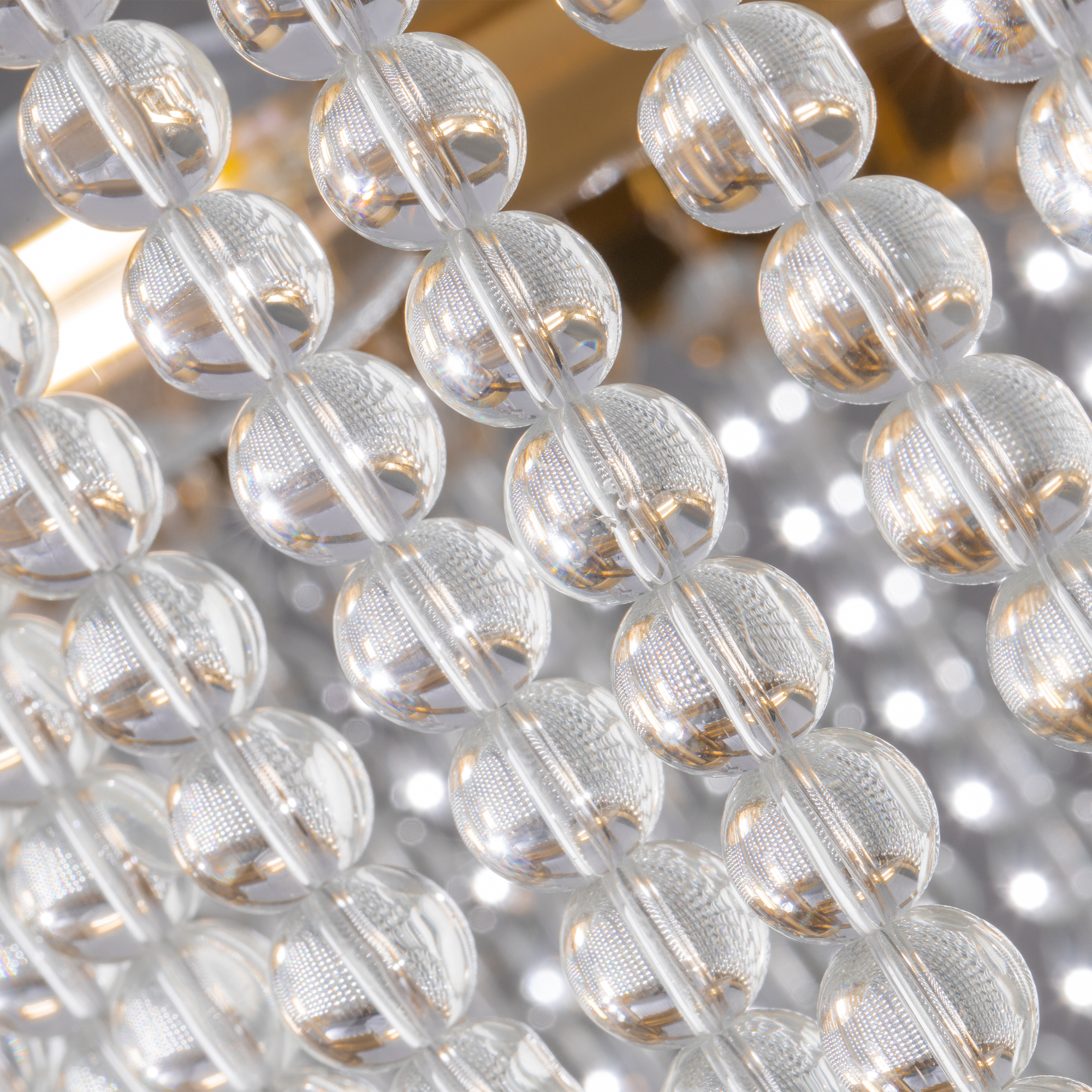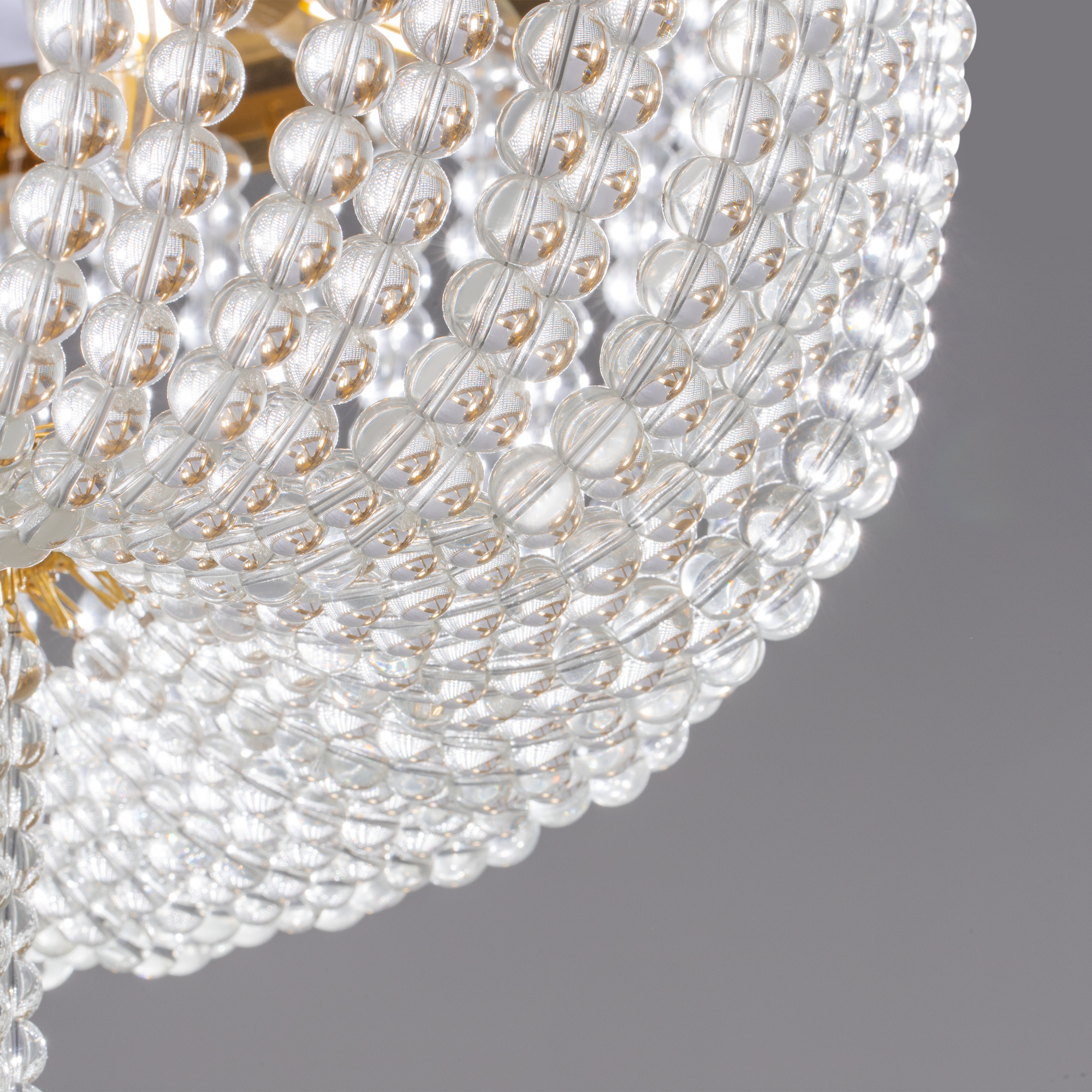 Материал абажура — хрустальное стекло, цвет — прозрачный. Металлическая арматура в цвете латунь. Потолочный светильник не регулируется по высоте. Источник света — лампы с цоколем Е14. Степень защиты — IP20.
