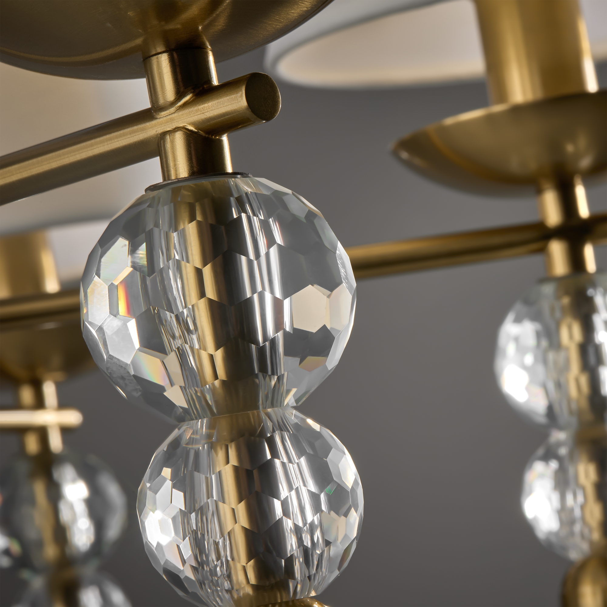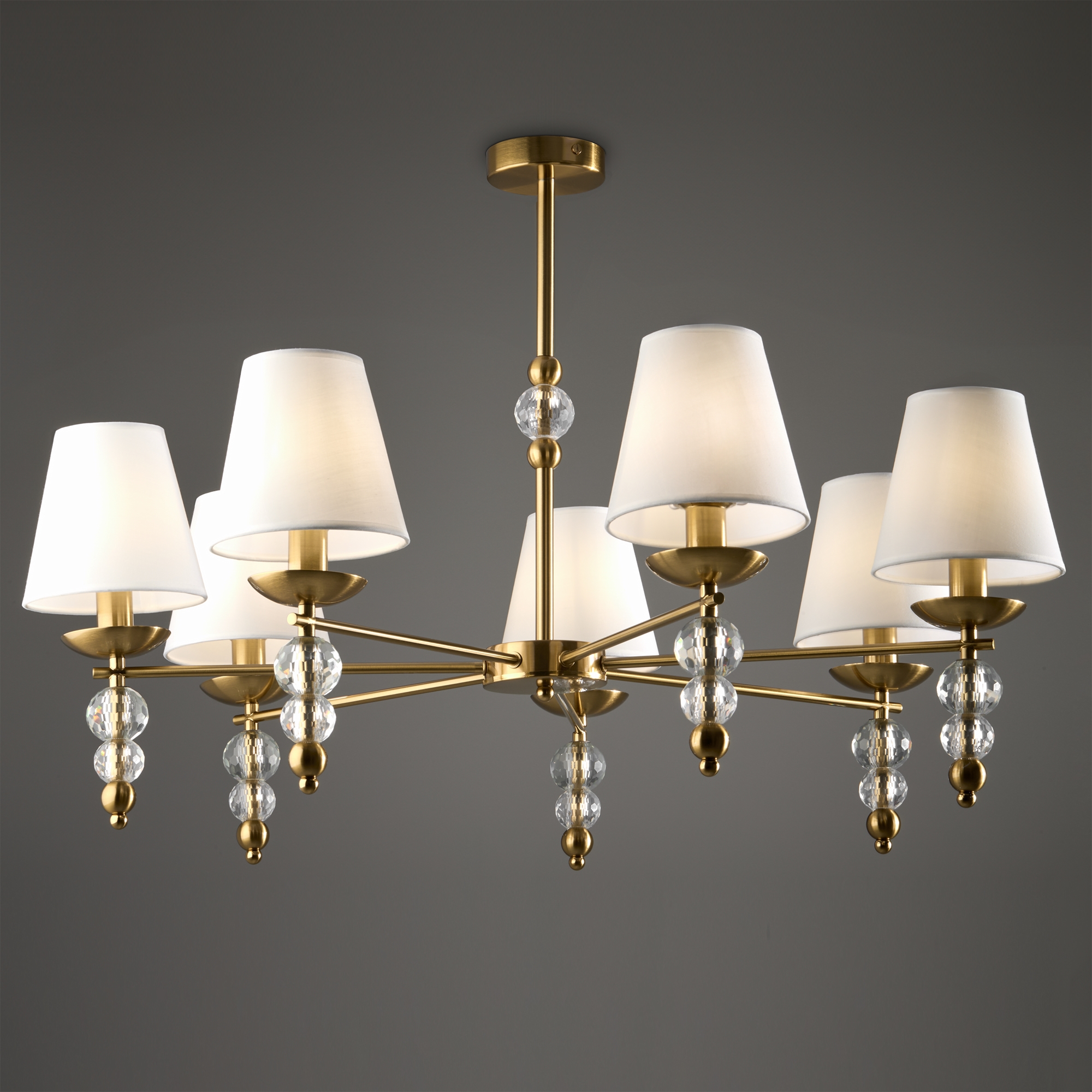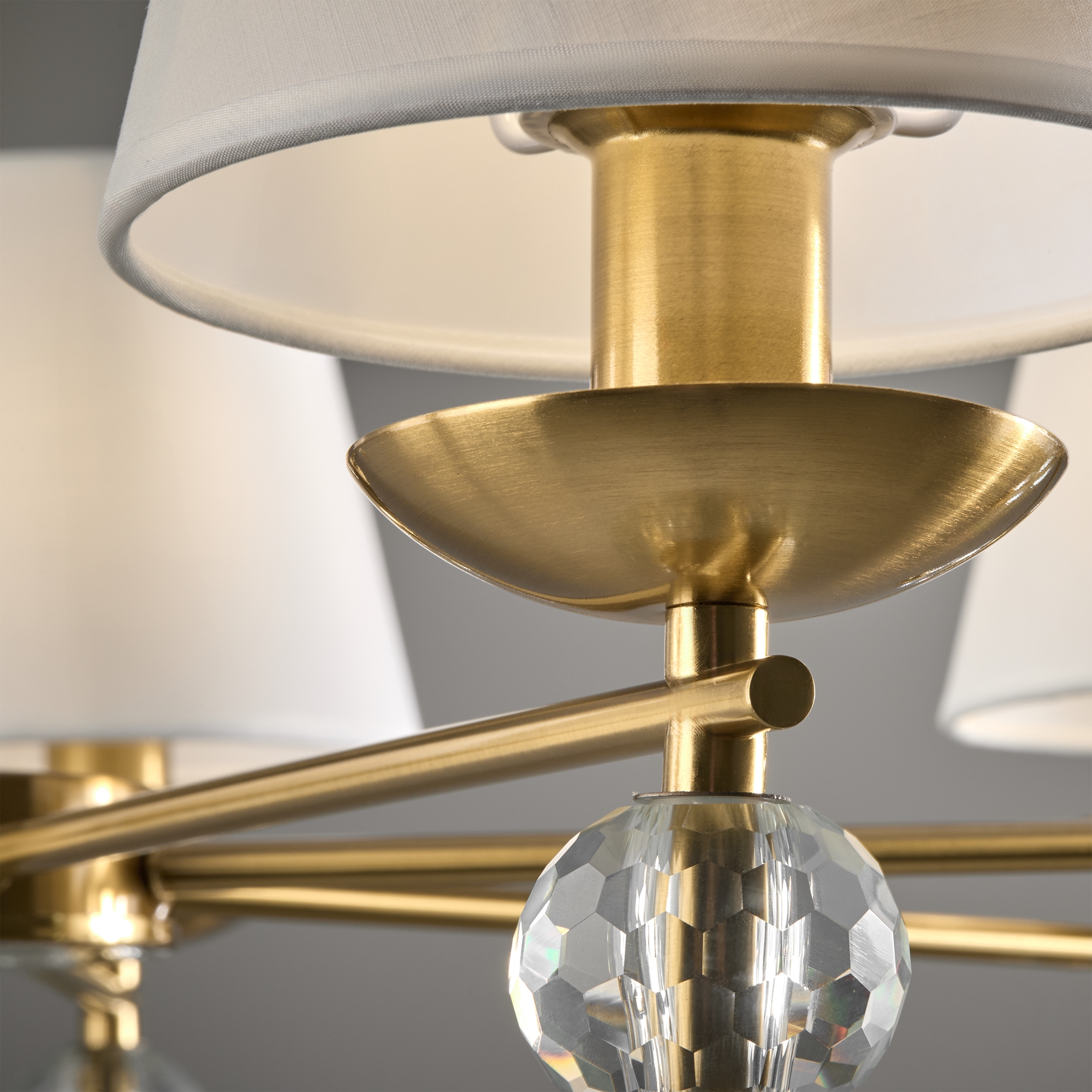 Материал абажура — ткань, цвет — белый. Металлическая арматура в цвете латунь обрамлена хрустальными бусинами. Источник света — лампы с цоколем Е14. Степень защиты — IP20.