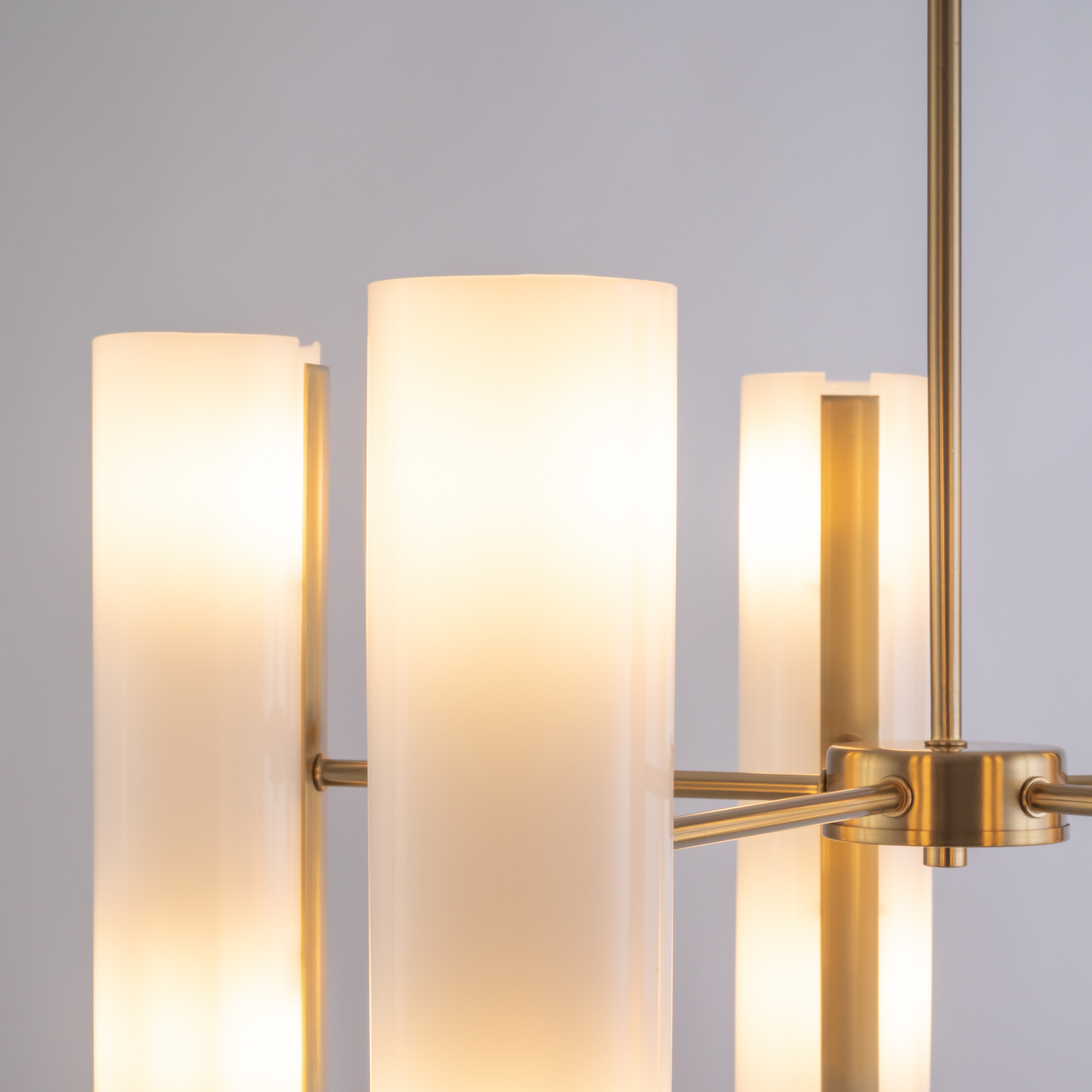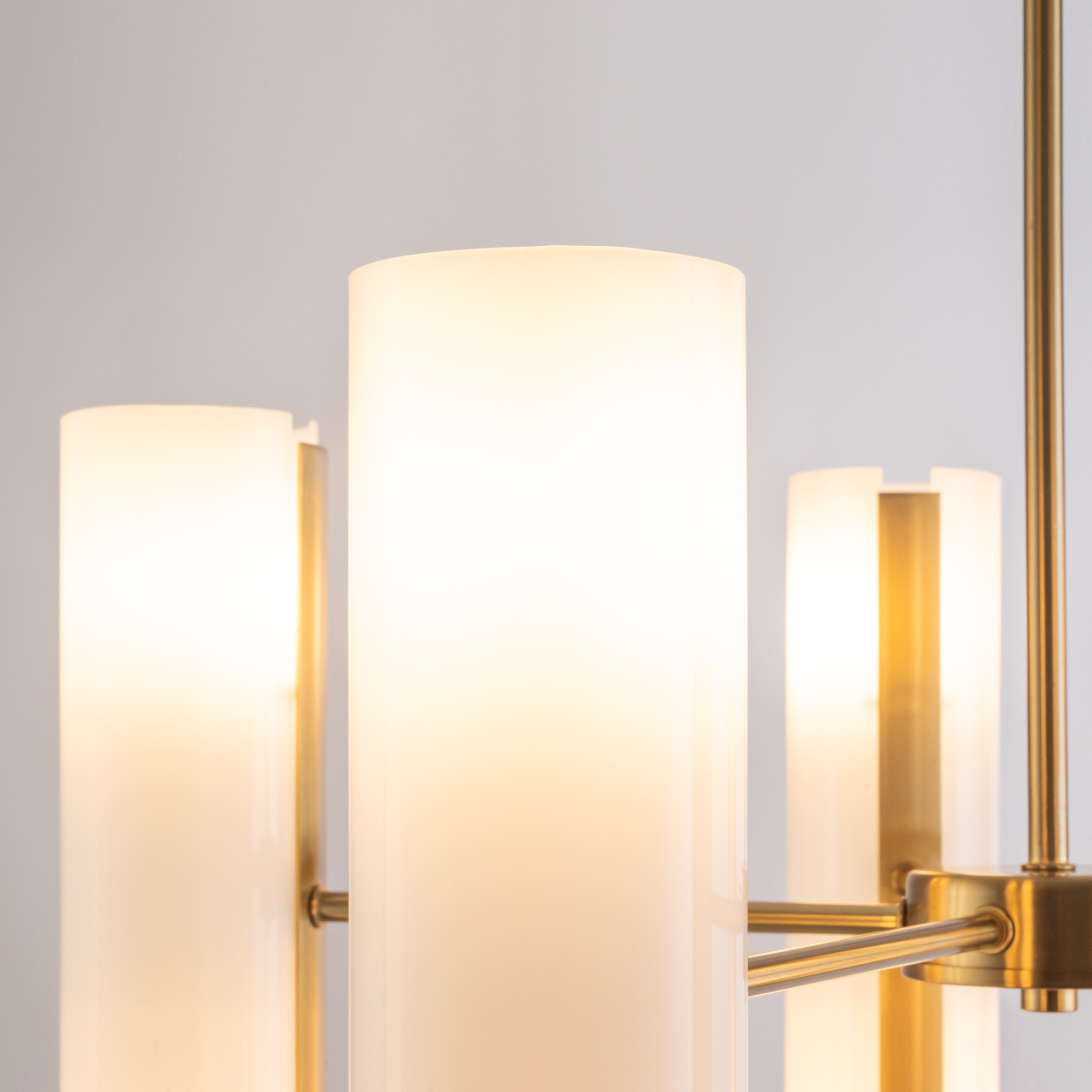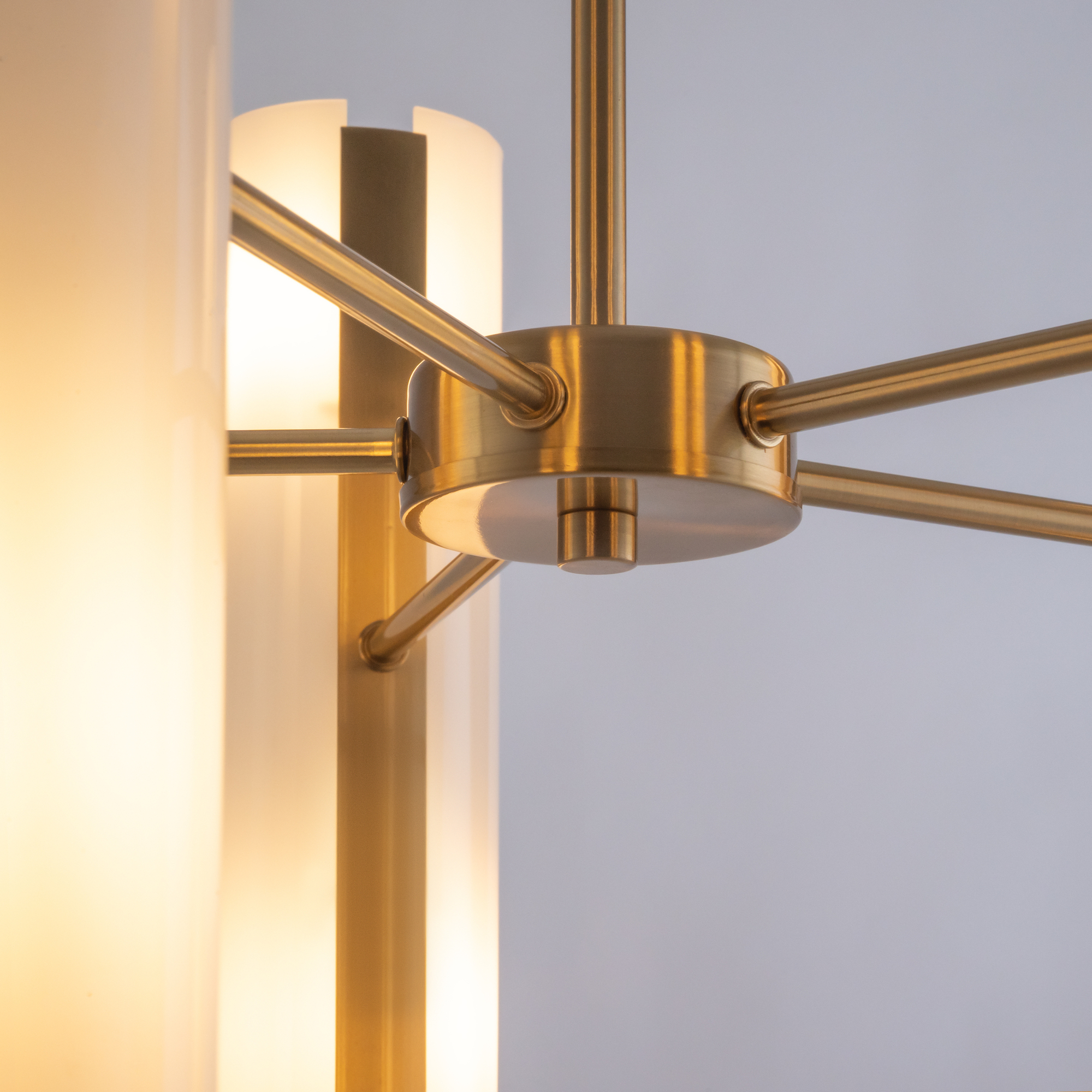Арматура — металлическая, цвет — латунь. Стеклянные белые плафоны-цилиндры мягко рассеивают свет в стороны. Открытые края плафонов и глянцевая поверхность дают дополнительный свет в вверх и вниз для максимальной освещенности. Источник света — лампа с цоколем Е14.