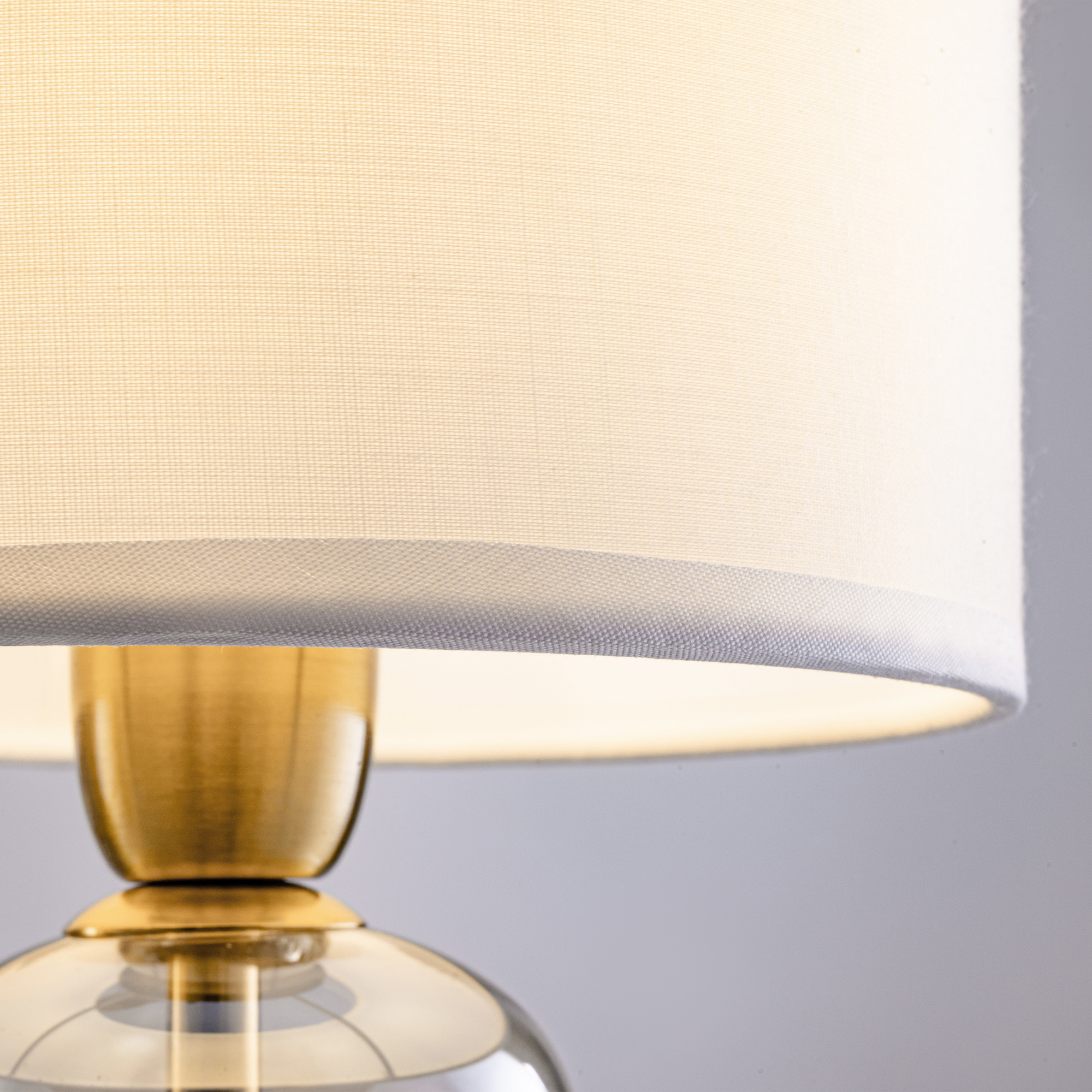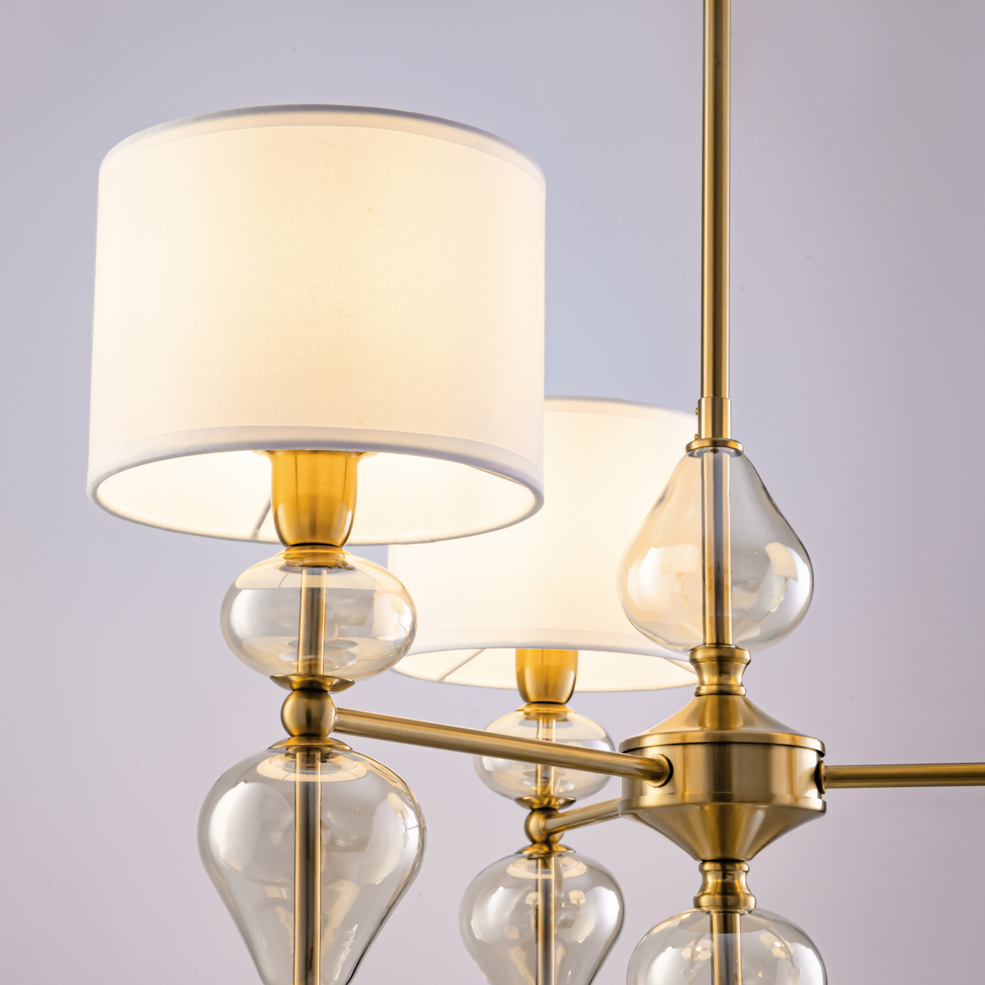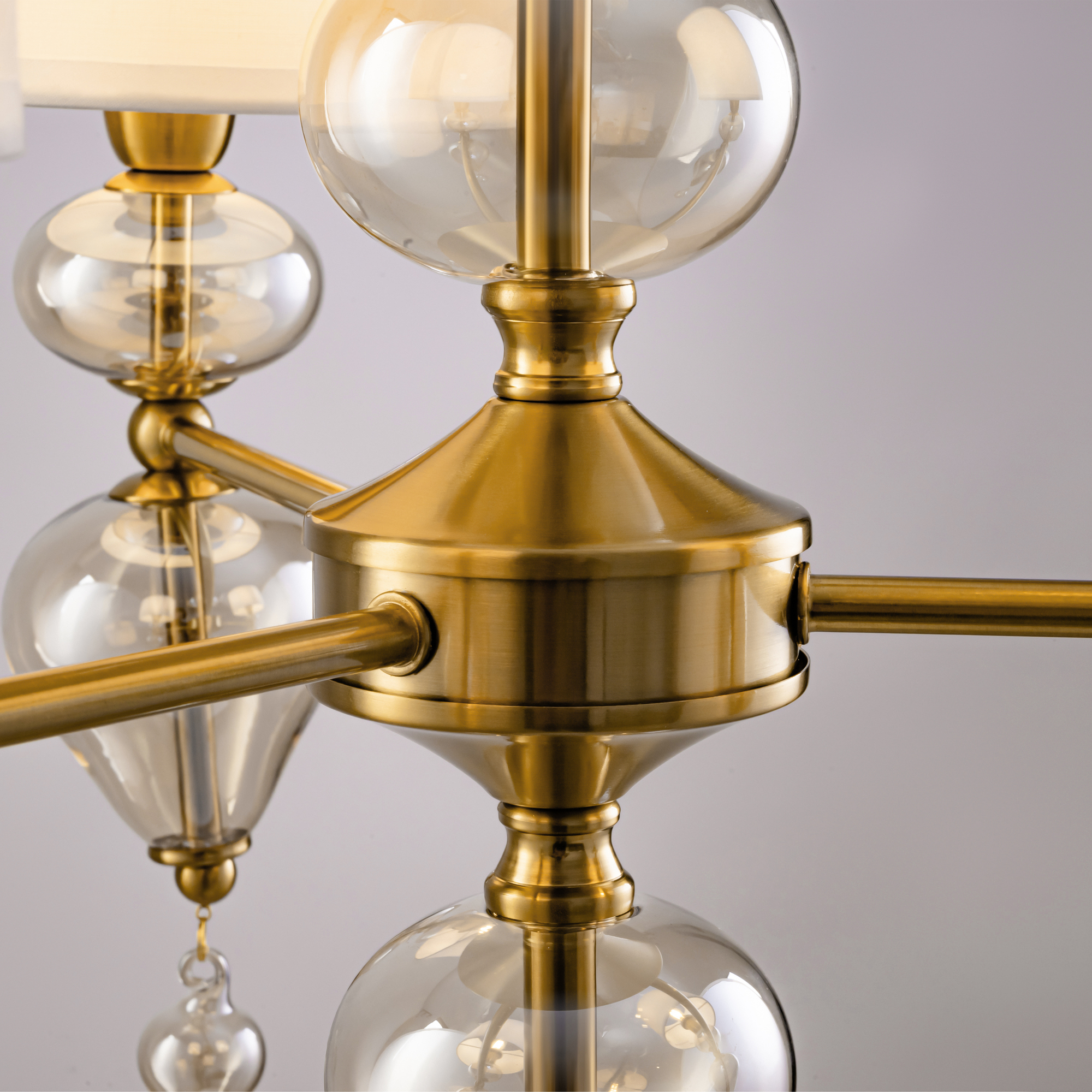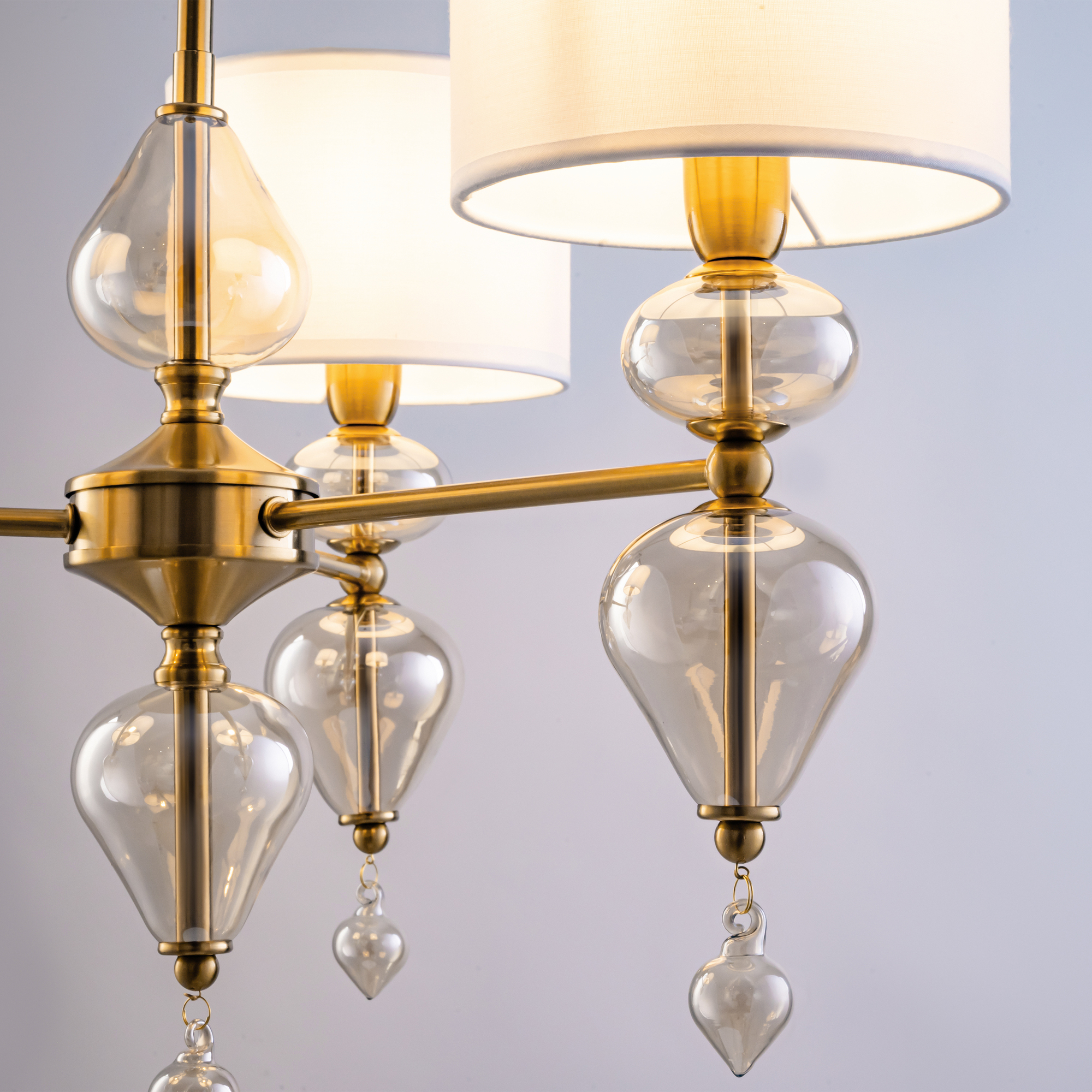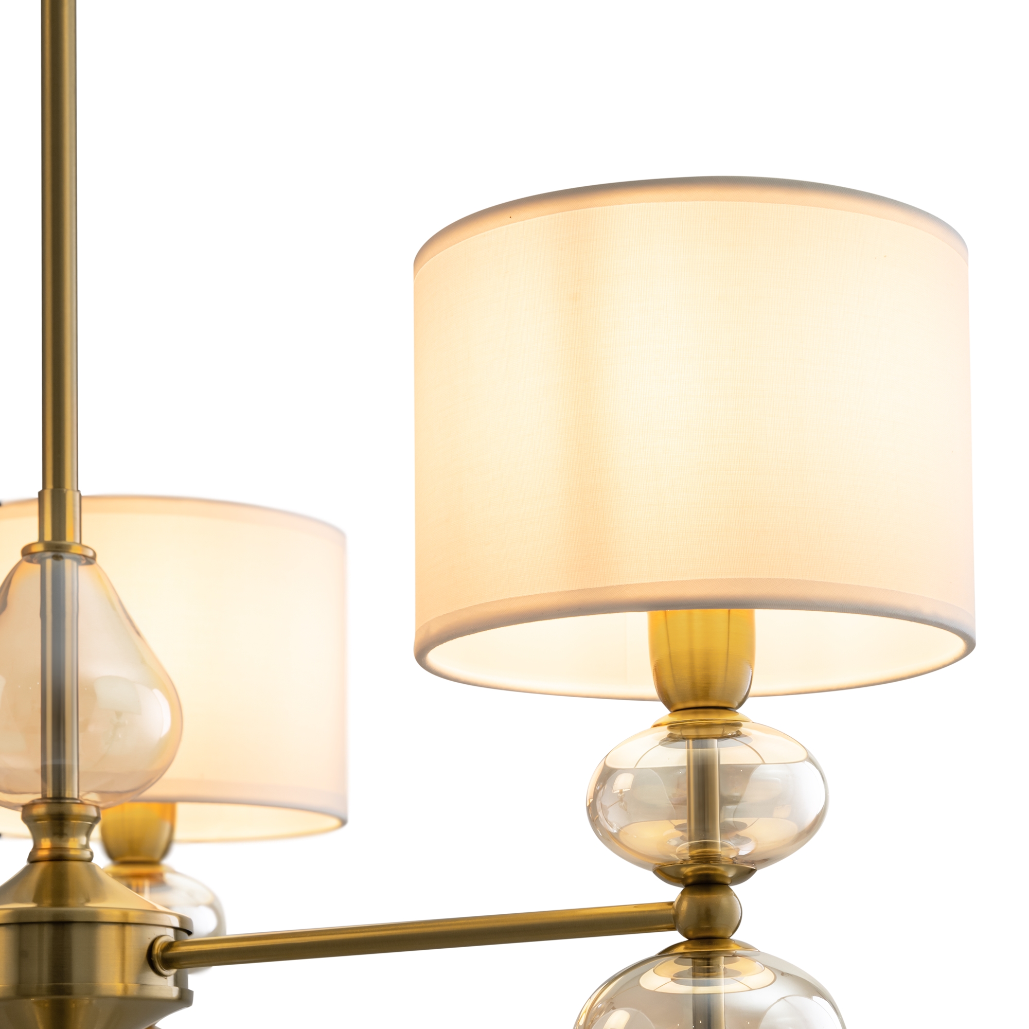 Арматура из металла, цвет — латунь. Плафоны — тканевые, молочного цвета. Металлическая конструкция декорирована выдувными стеклянными элементами с перламутровым напылением. Источником света служит лампа с цоколем Е14.