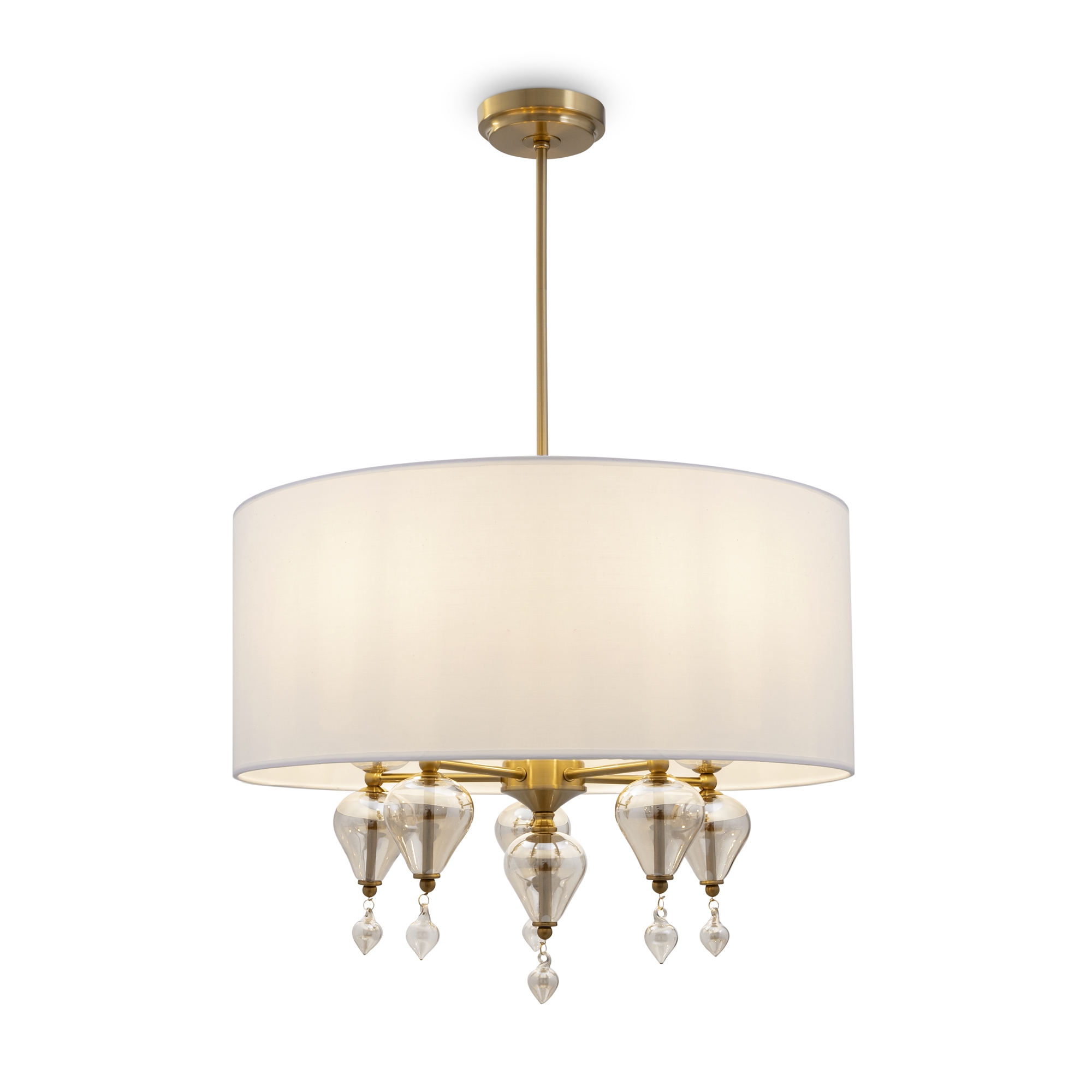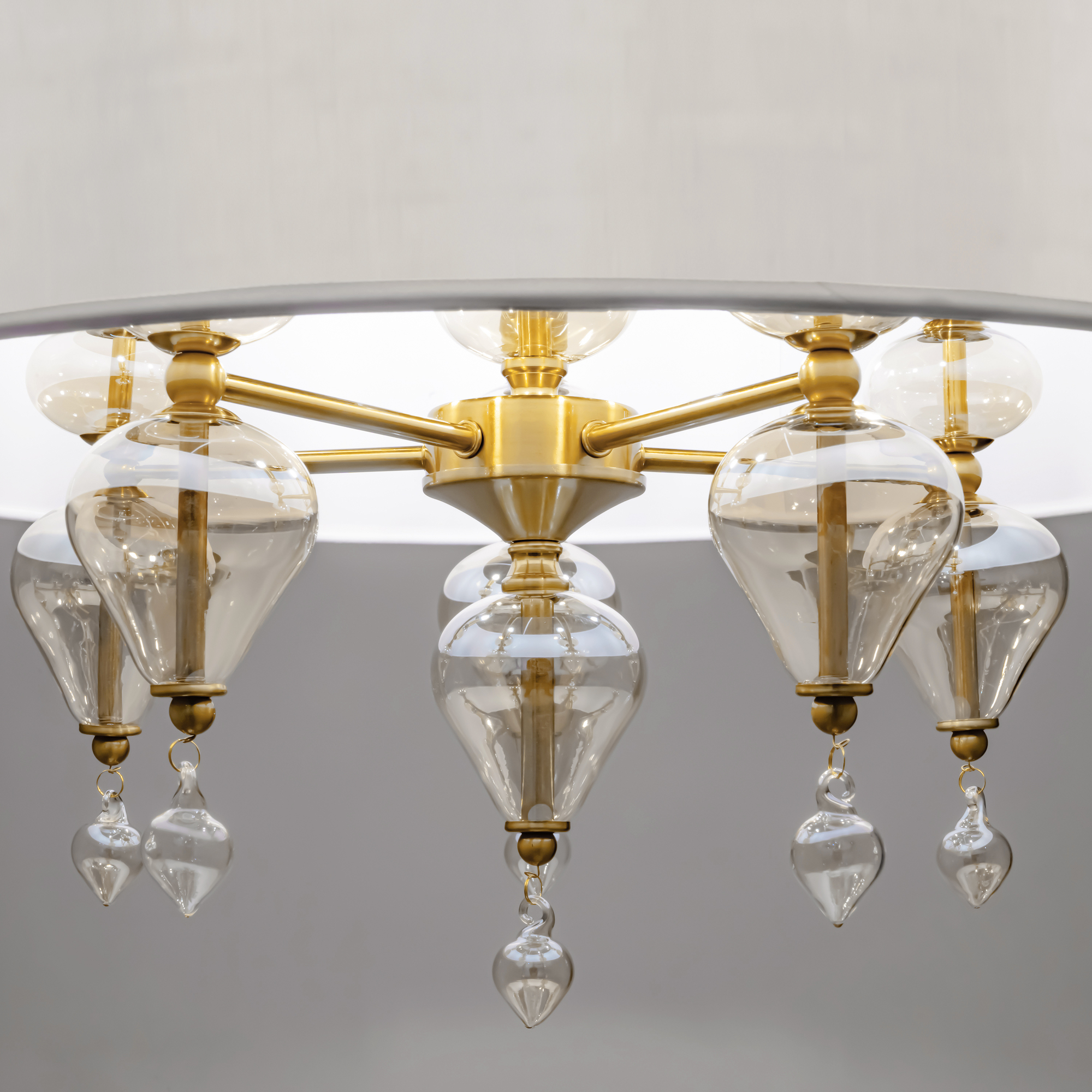 Арматура из металла, цвет — латунь. Плафоны — тканевые, молочного цвета. Металлическая конструкция декорирована выдувными стеклянными элементами с перламутровым напылением. Источником света служит лампа с цоколем Е14.