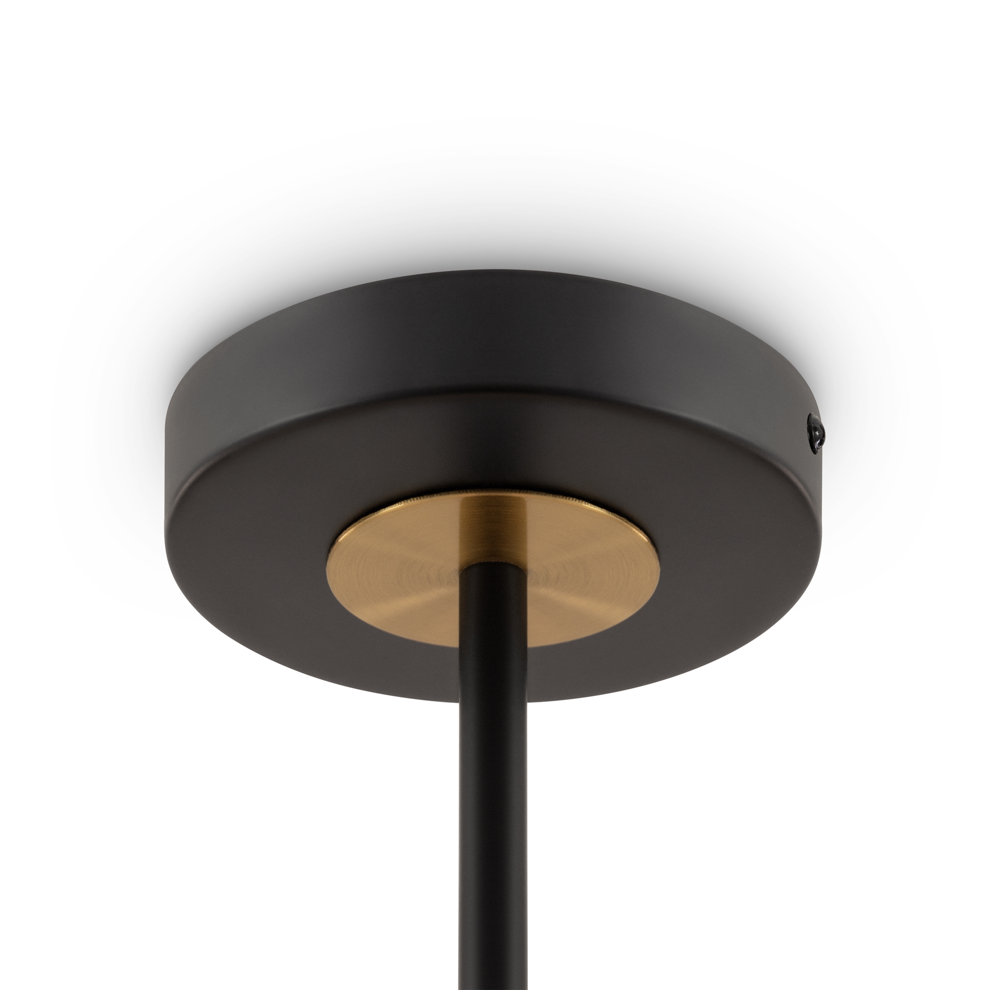 Арматура - металл, цвет — чёрный. Декоративные крепления и вставки цвета латуни. Тканевые абажуры в форме конуса из микса теплых цветов: бежевый и коричневый. Открытые верхние основания абажуров пропускают дополнительный свет. Динамичный дизайн в стиле Casual. Источник света — лампа с цоколем Е14.