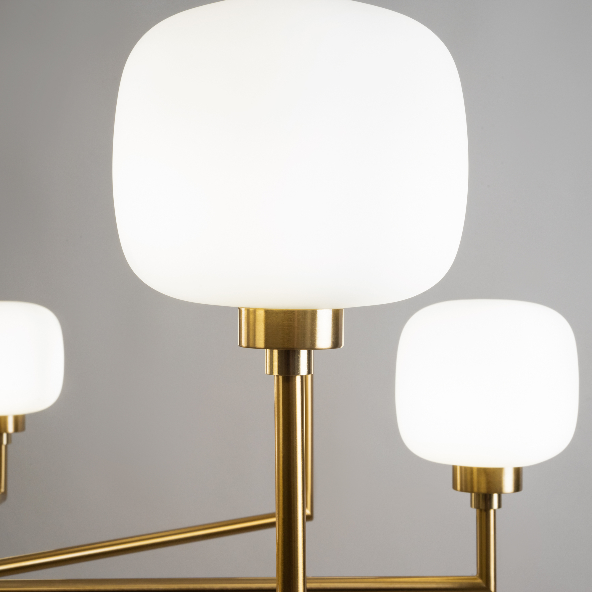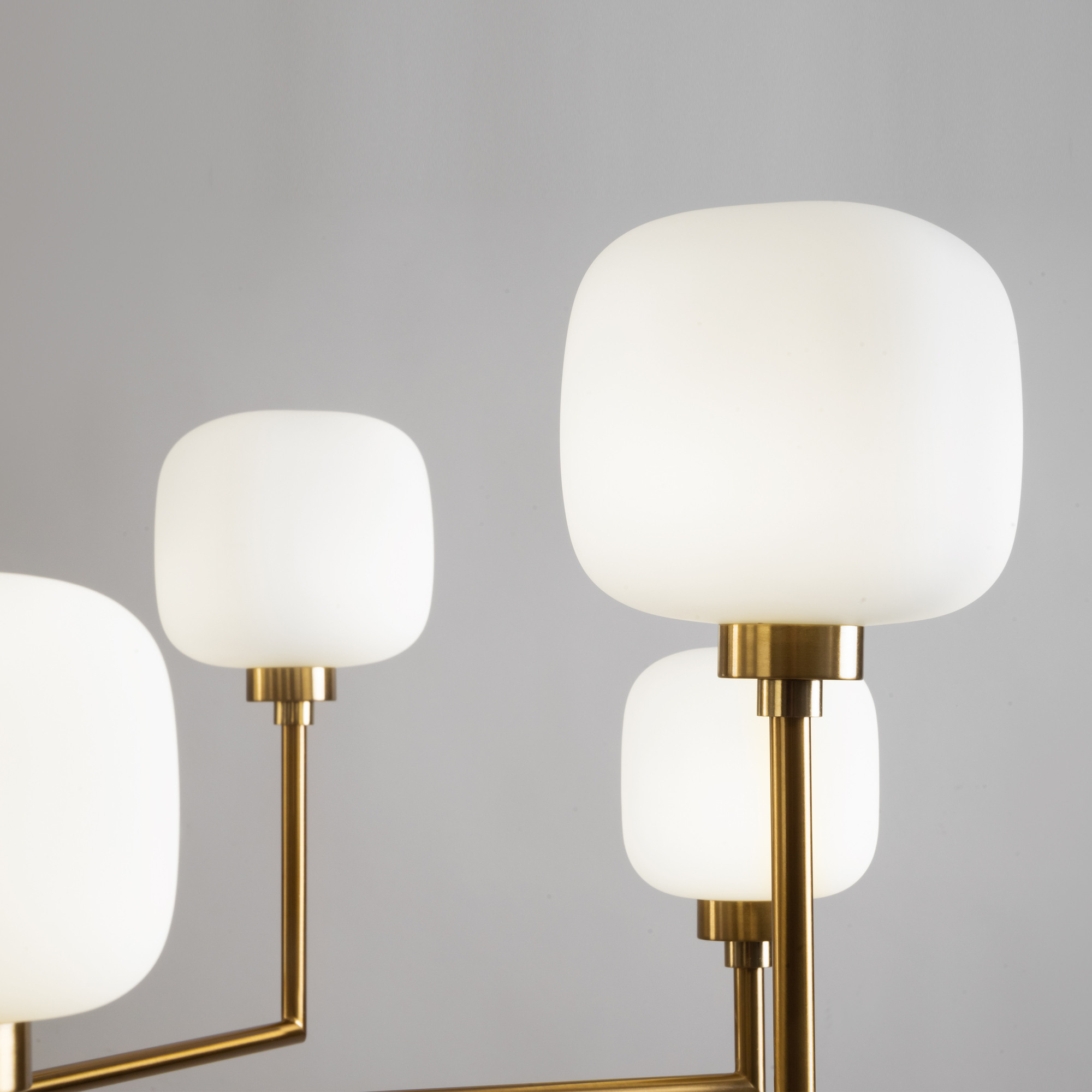 Металлическая графичная арматура цвета латунь. Плафоны из белого матового стекла в необычной форме округлых кубов - закреплены на разной по высоте комбинации. Мягкое равномерное освещение. Источником света служит лампа с цоколем G9.