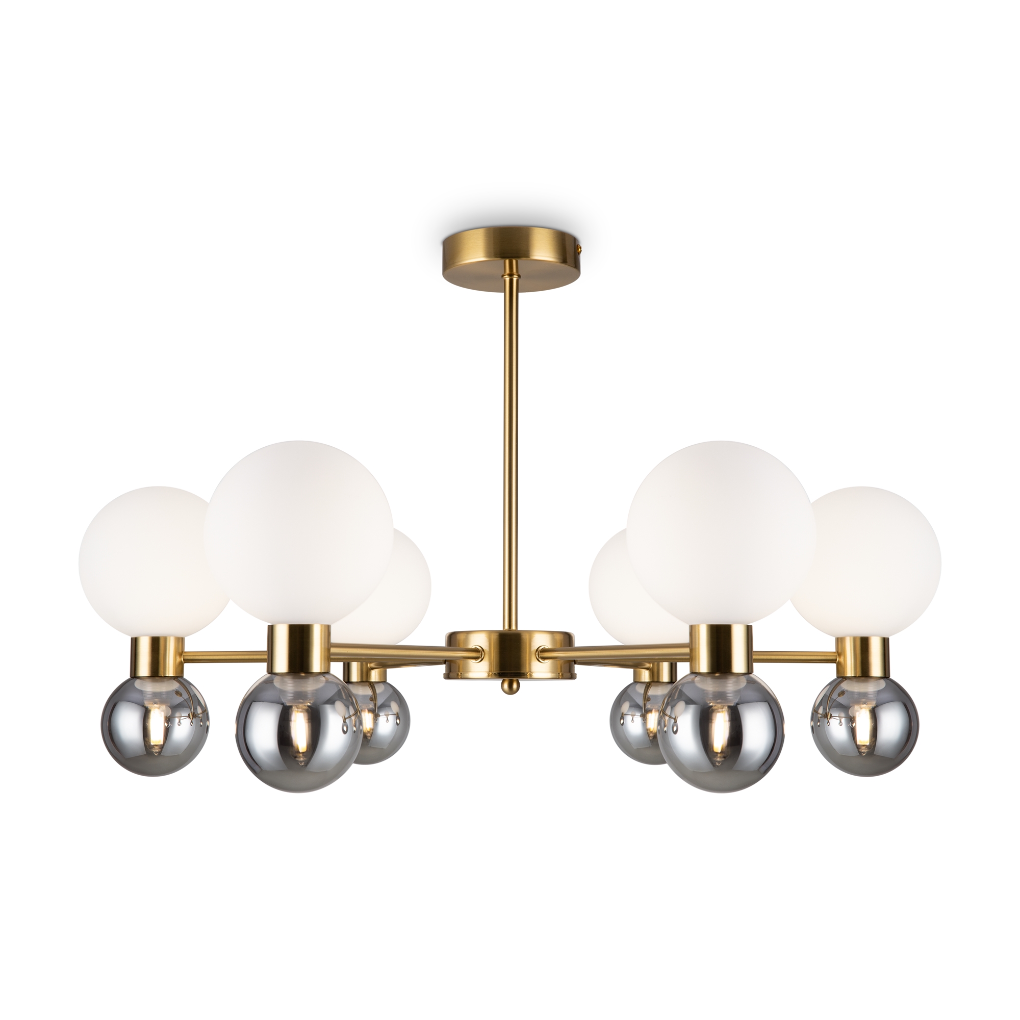 Металлическая арматура в цвете латунь. Открытые сферические плафоны в 2-х цветах: тёплый белый и тёмный гальванизированный. Плафоны разделены металлической вставкой в цвет арматуры. Источником света является лампа с цоколем G9. Для бра - цоколь Е27.