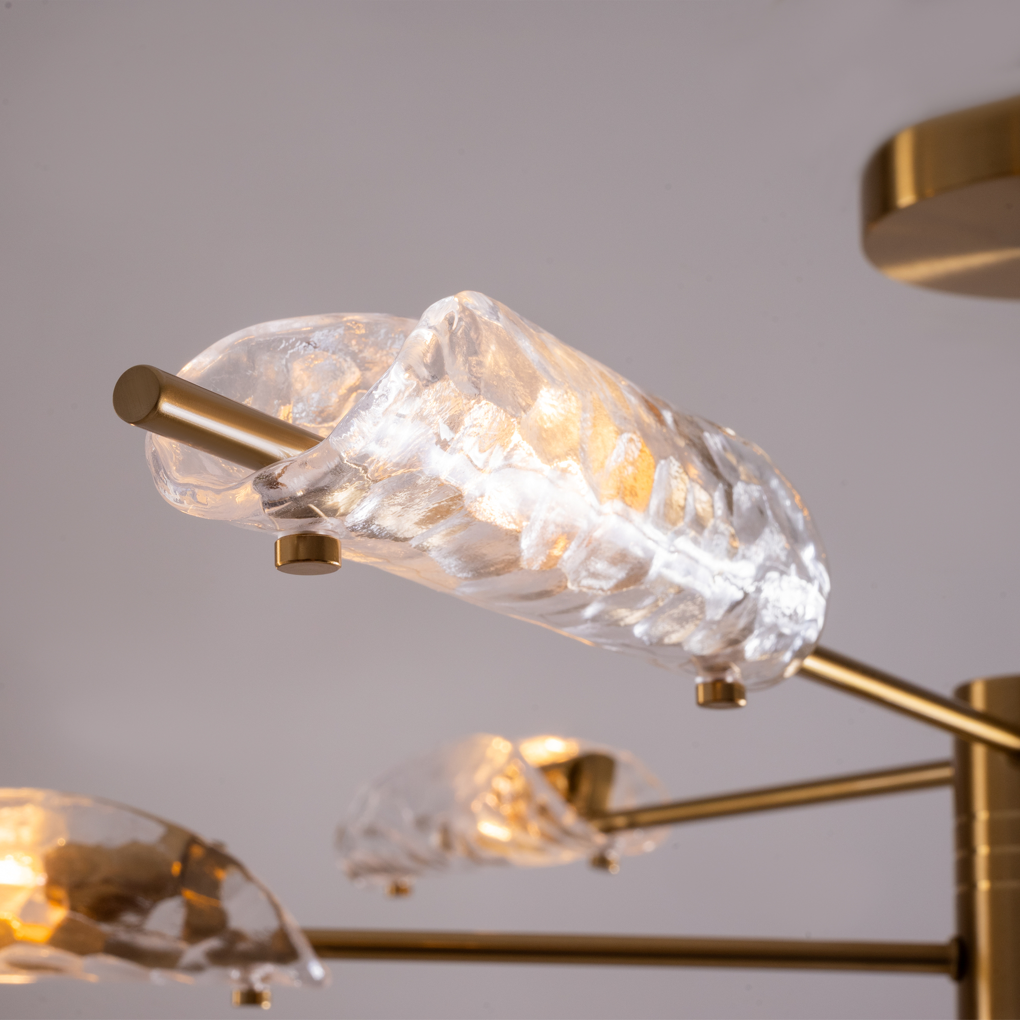 Металлический корпус, цвет— латунь. Плафон, моделированный под вытянутый лепесток с эффектом чеканки на стекле. Источник света — лампа с цоколем G9 и максимальной мощностью 30W дает яркое и равномерное освещение. Компактная высота – идеальное решение для низких потолков.