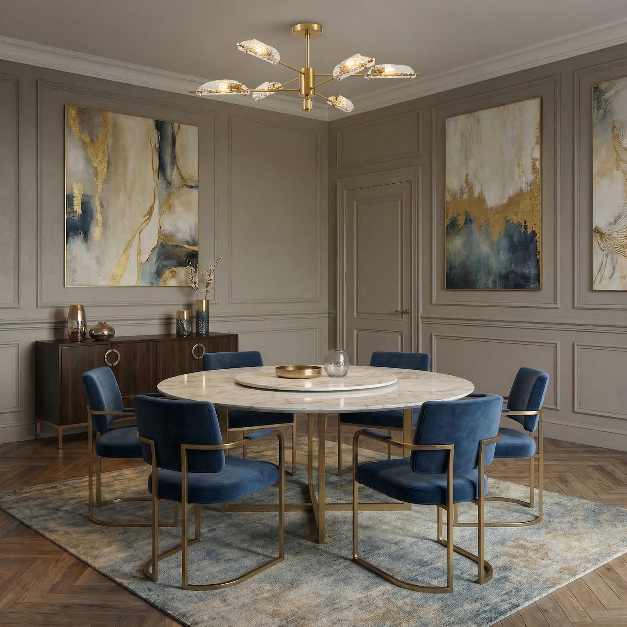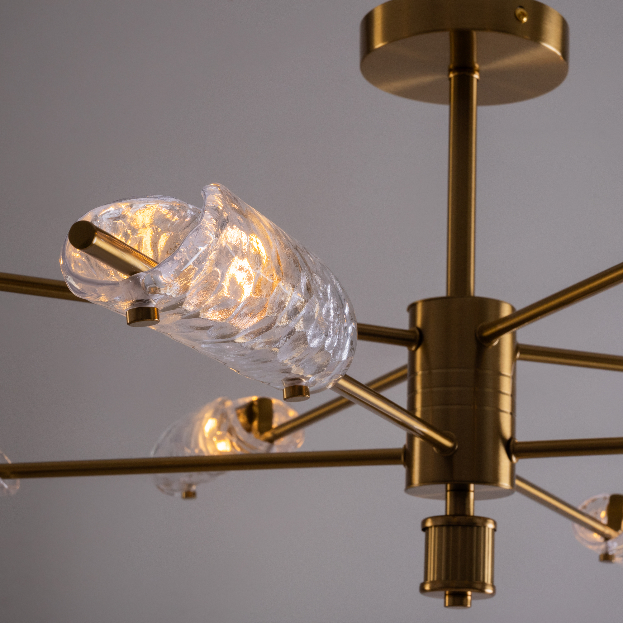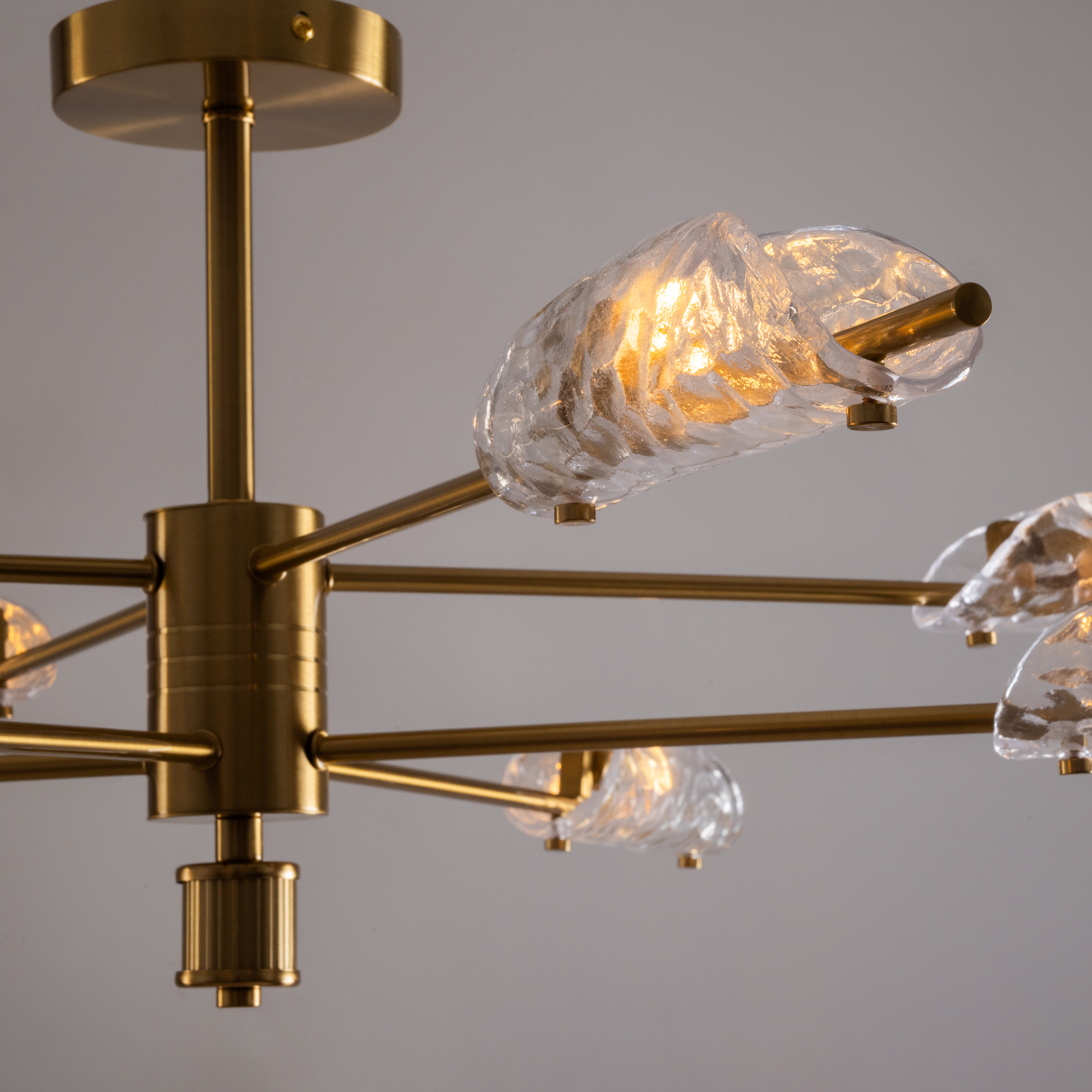 Металлический корпус, цвет— латунь. Плафон, моделированный под вытянутый лепесток с эффектом чеканки на стекле. Источник света — лампа с цоколем G9 и максимальной мощностью 30W дает яркое и равномерное освещение. Компактная высота – идеальное решение для низких потолков.