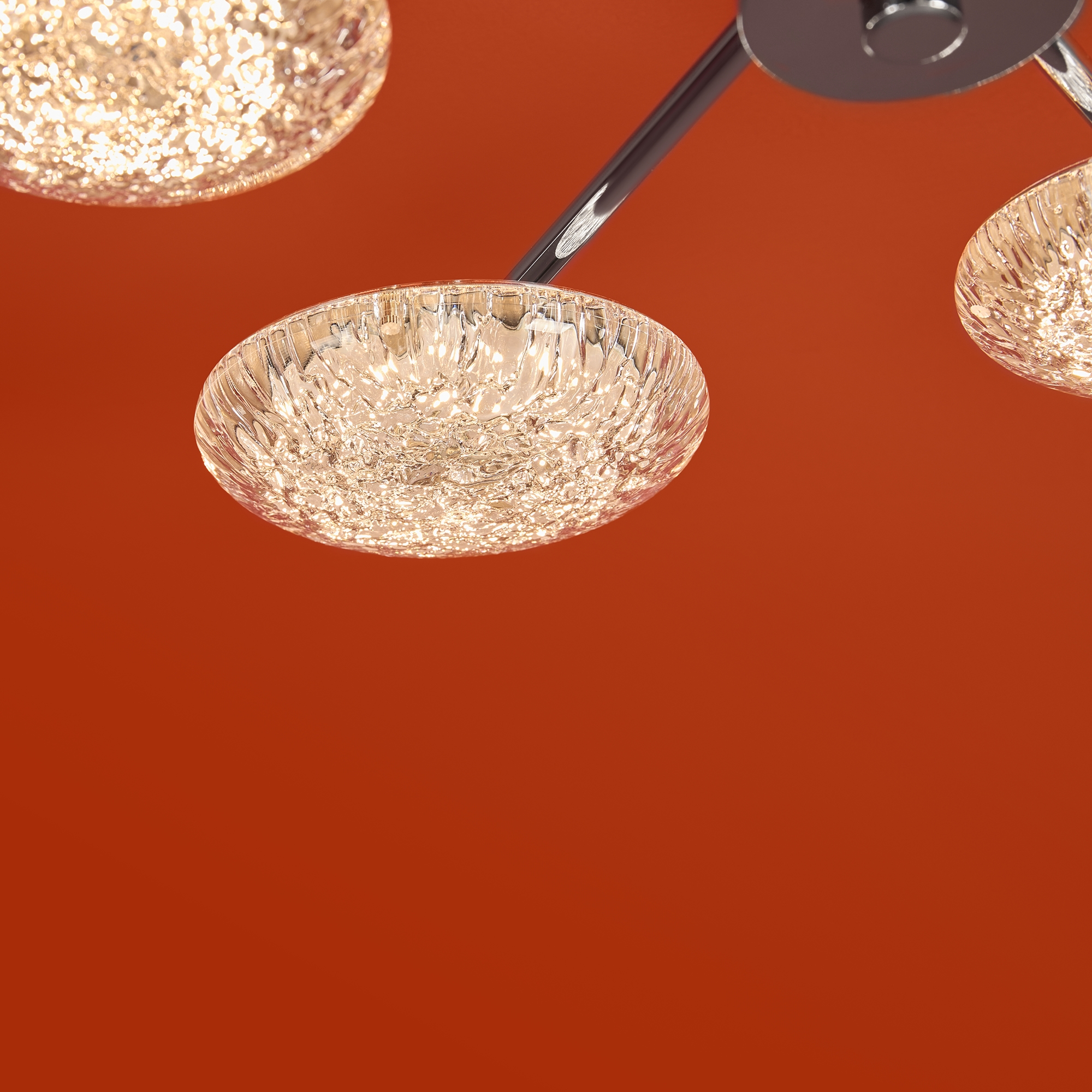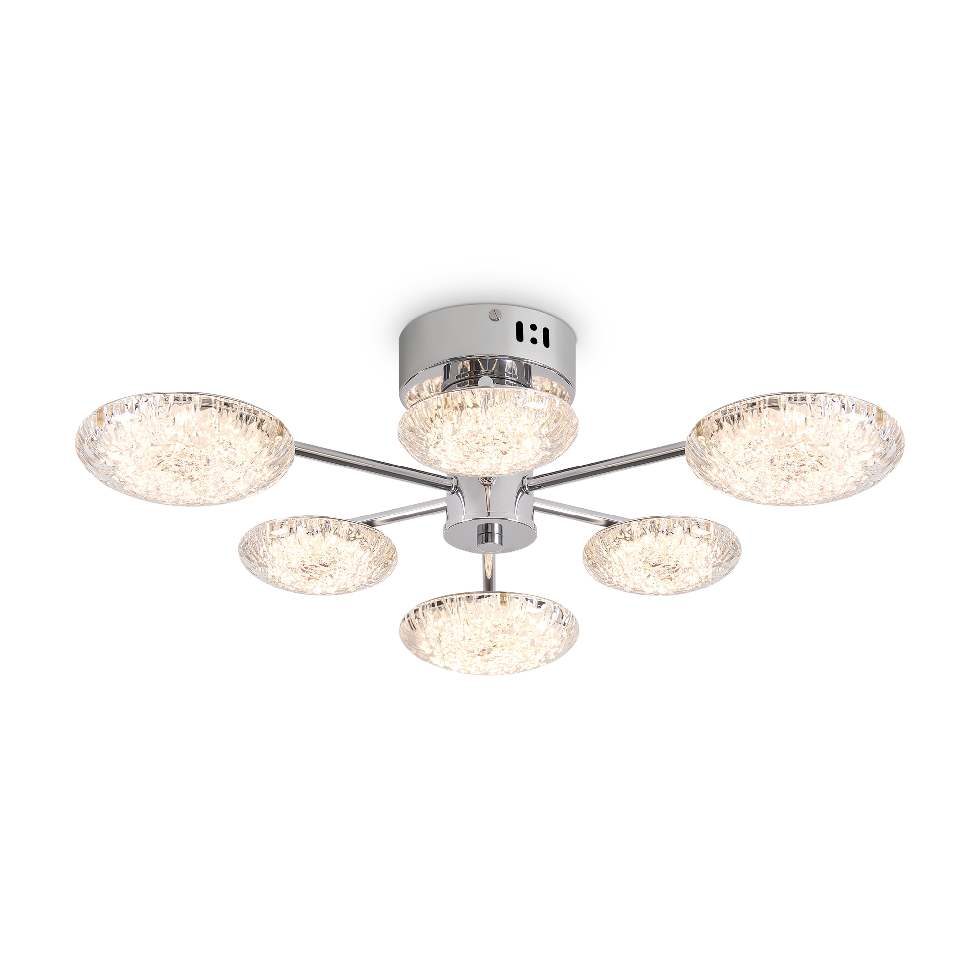 Материал арматуры — металл, цвет — хром. Потолочный светильник оснащен LED-источником света с цветовой температурой 2700К. Плафоны с рисунком из воздушных пузырьков акрила полусферической формы. Футуристичный дизайн идеально дополнит современные интерьеры и помещения с невысокими потолками.
