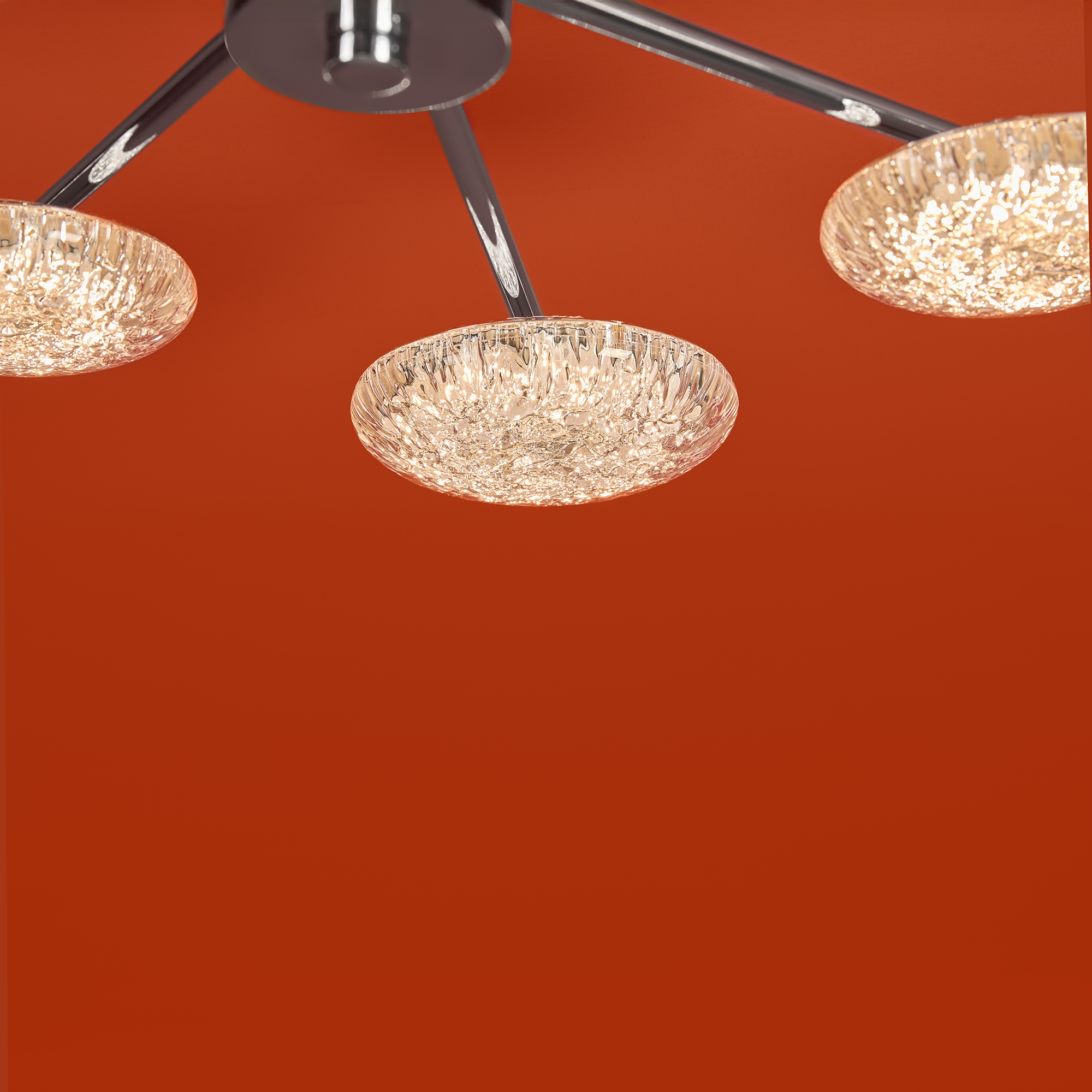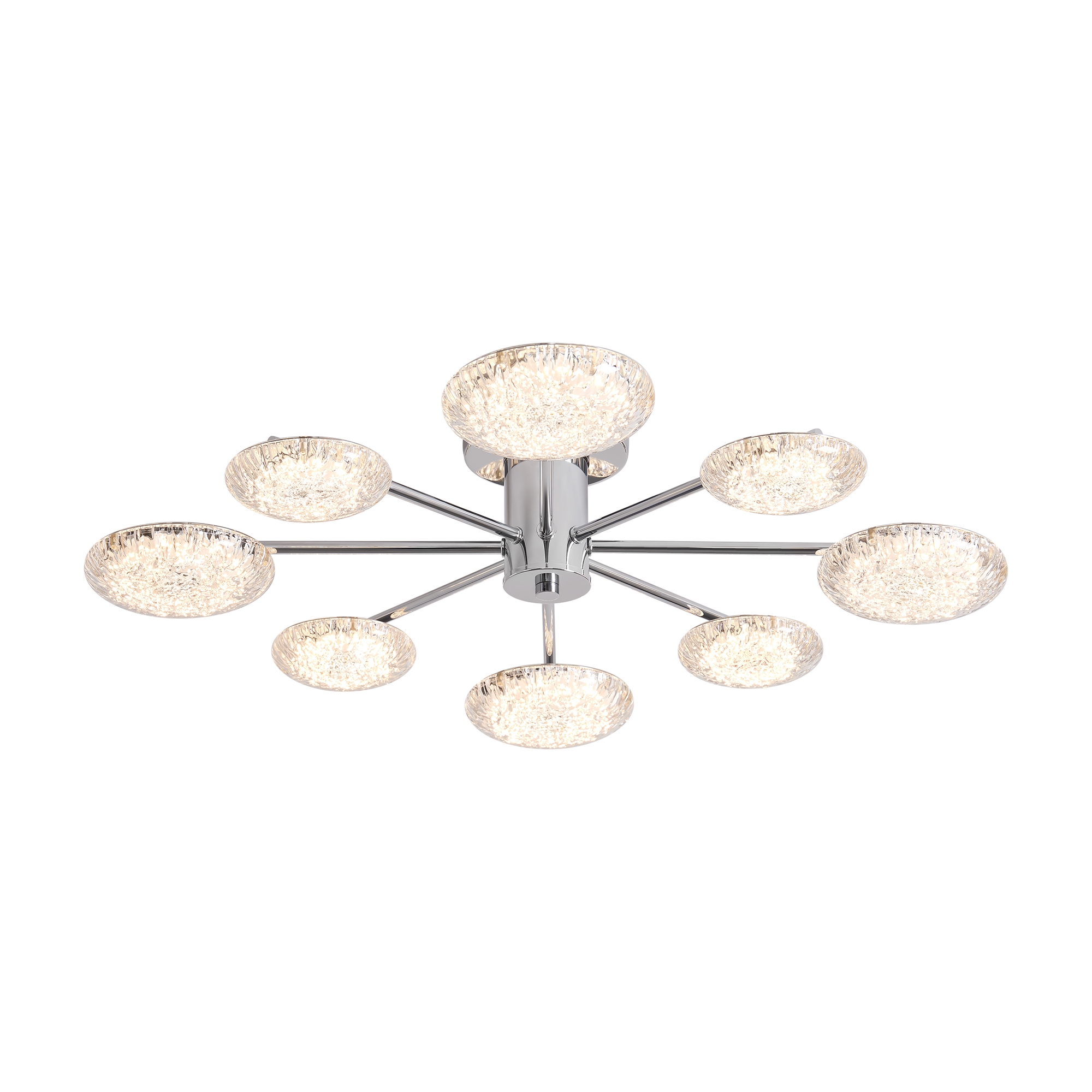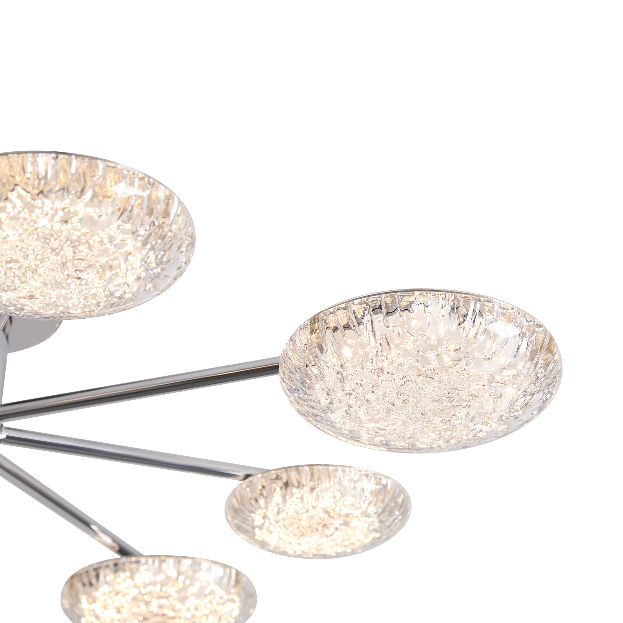 Материал арматуры — металл, цвет — хром. Потолочный светильник оснащен LED-источником света с цветовой температурой 2700К. Плафоны с рисунком из воздушных пузырьков акрила полусферической формы. Футуристичный дизайн идеально дополнит современные интерьеры и помещения с невысокими потолками.