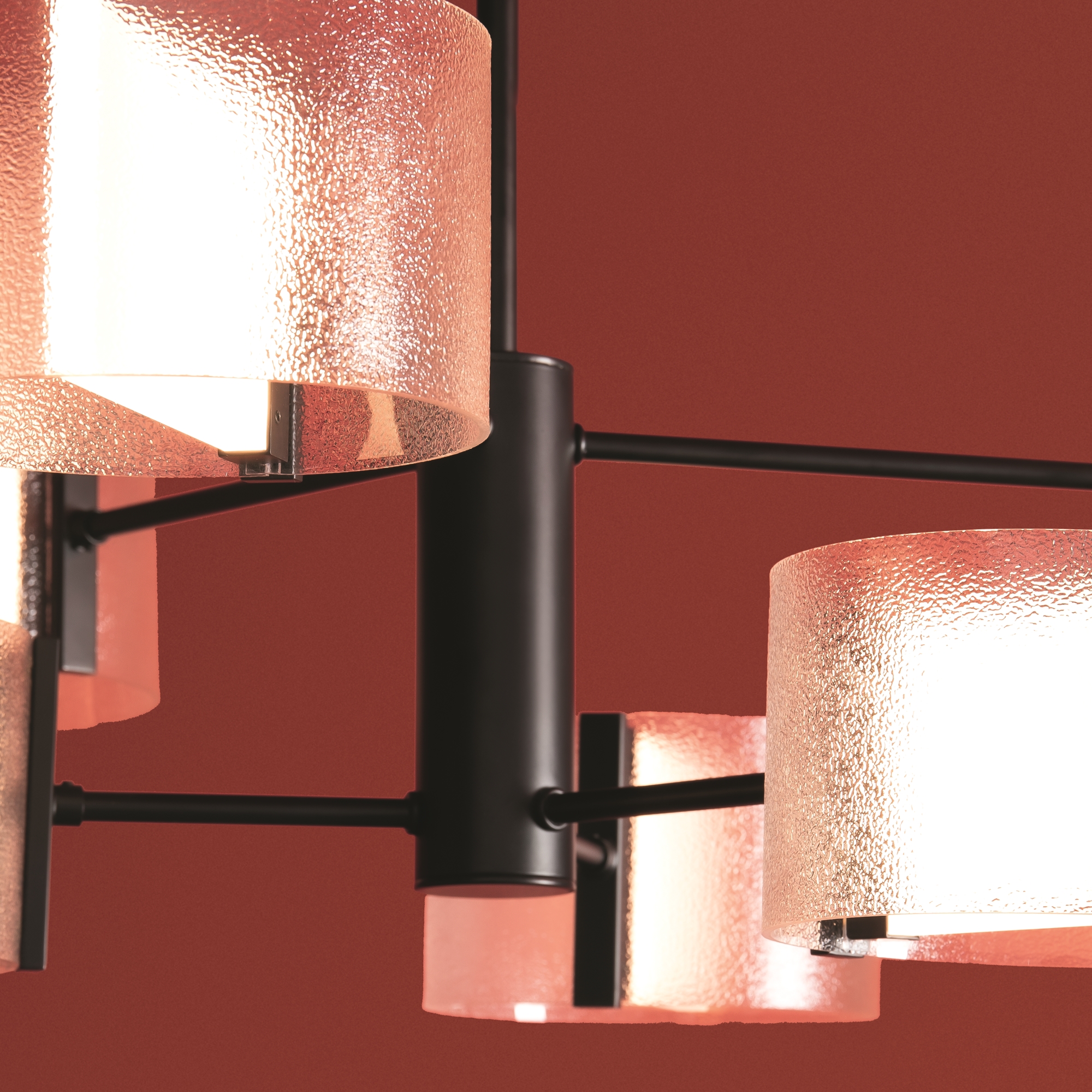 Материал арматуры — металл, цвет — черный. Потолочный, настенный и подвесной светильники оснащены LED-источниками света. Цветовая температура 3000К. Прозрачный рельефный плафон «парящий в воздухе» с эффектом замороженного стекла. Подходит для интерьеров в стиле минимализм и лайт лофт.