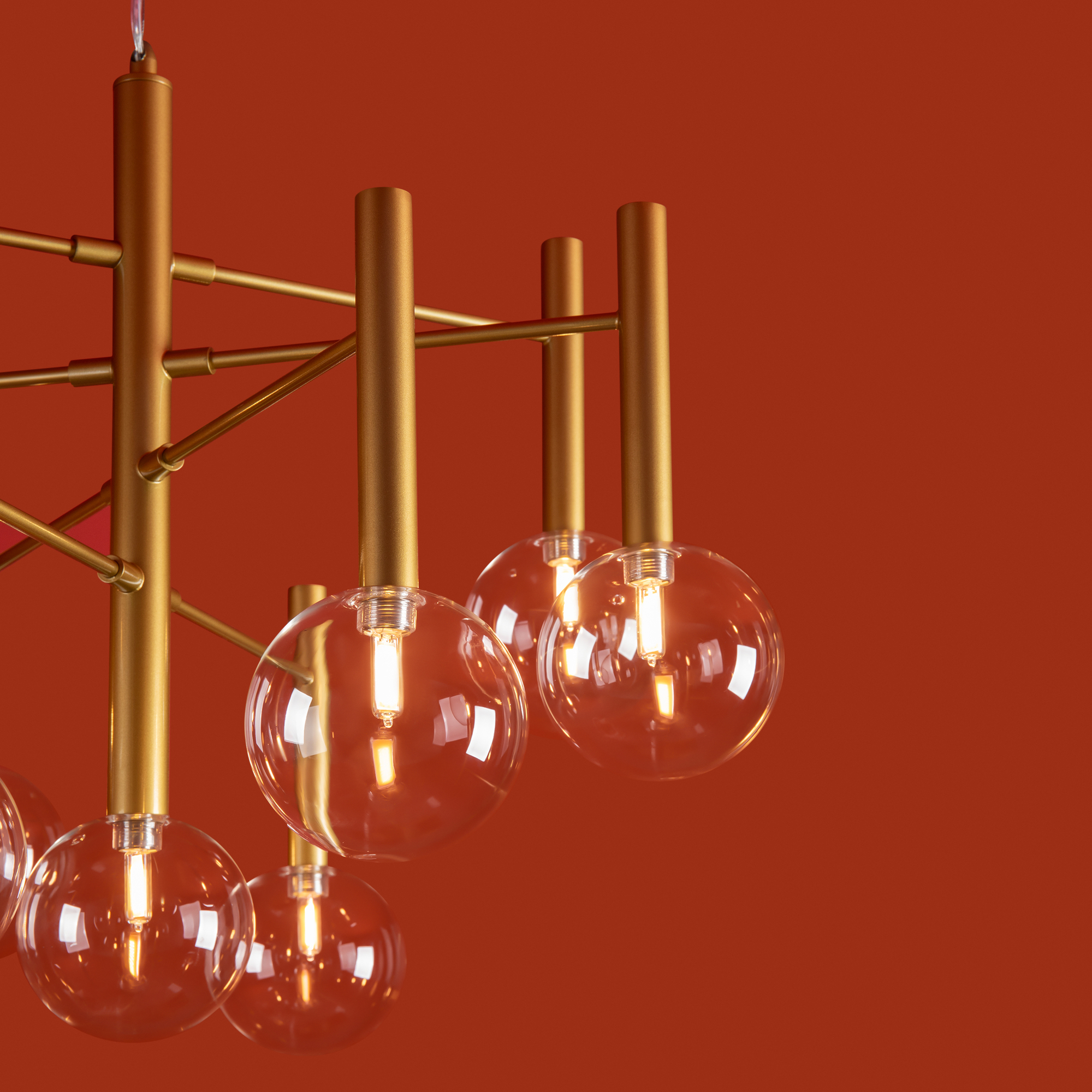 Арматура - металл в цвете матовое золото. Светильники с прозрачным дутым стеклом. LED источник света (2700K). Круглые стеклянные абажуры создают тёплый свет. У настенного светильника 2 источника света.