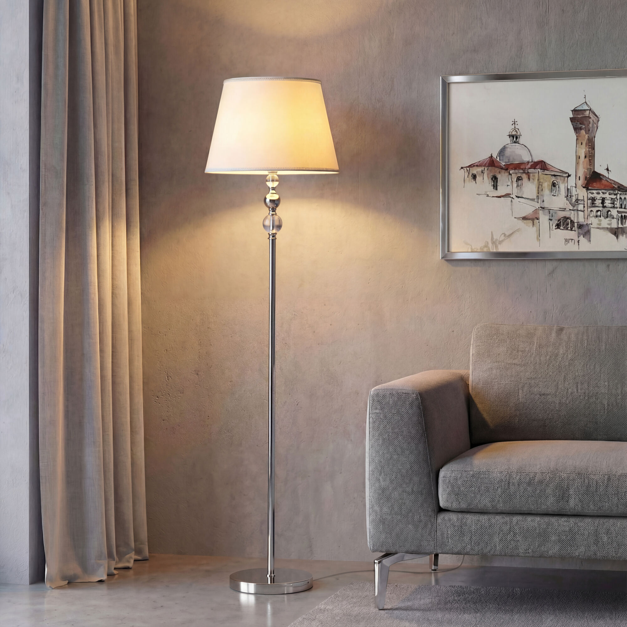 Напольный светильник с тканевым абажуром 01072/1 хром - это стильный элемент светового дизайна в современных и классических интерьерах. Эффектный торшер со сменной лампой E27 поможет создать качественное дополнительное освещение на площади 5 м² и станет изящным украшением вашей спальни или гостиной.